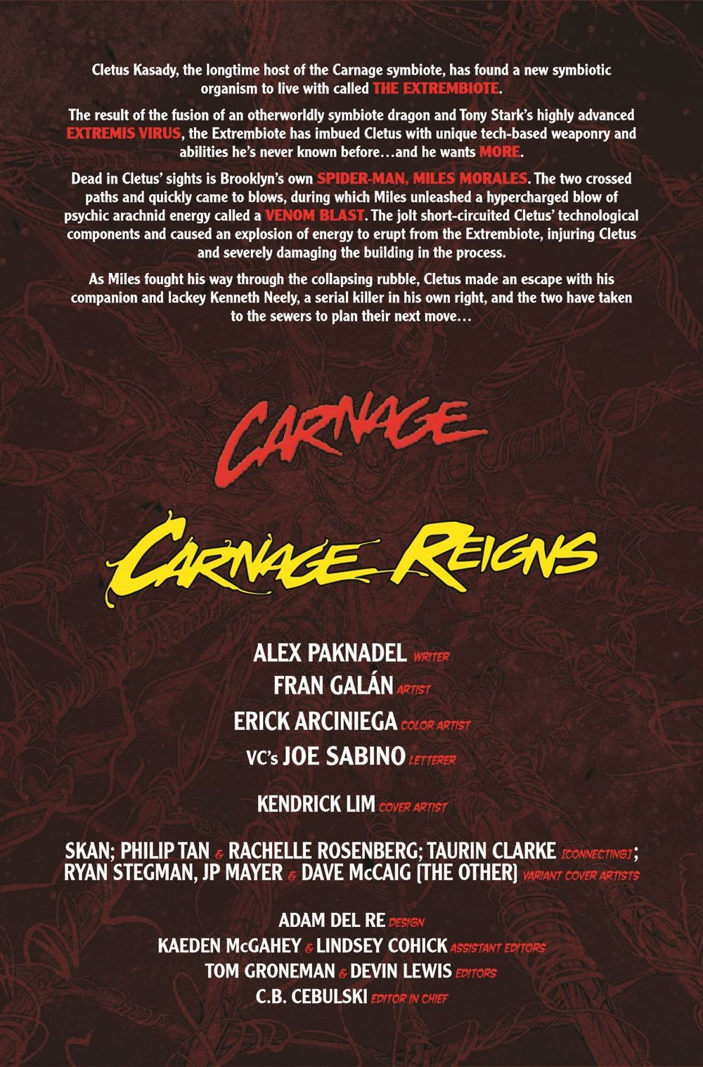 "CARNAGE REIGNS" - PART 3! Returning to and fortifying his underground stronghold from the days of ABSOLUTE CARNAGE, Cletus Kasady sets his sights on even greater and gorier heights as Extremis demands blood!