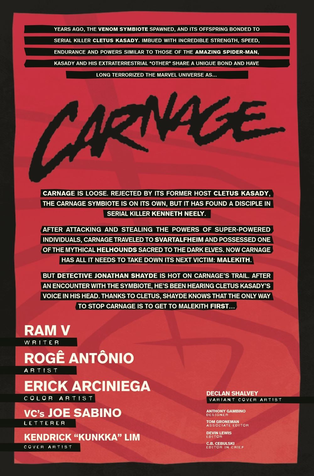The Carnage symbiote has a bloodlust unlike any other organism in the Marvel Universe. IN THIS ISSUE, its ruthless and aggressive efforts to quench that bloodlust reach new and never-before-seen heights. But what in the Hel is Carnage up to, and what will it do to anyone who gets in its way?!