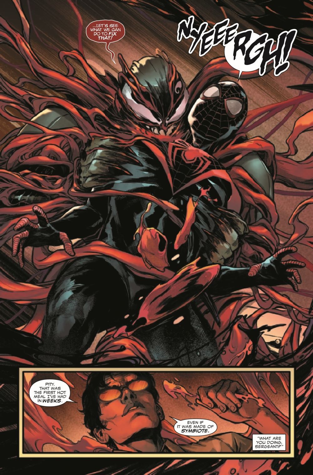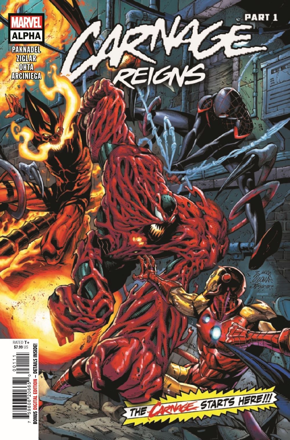 CARNAGE VS. MILES MORALES! CLETUS KASADY IS BACK and badder than ever. With his soul trapped within the Extrembiote Armor created by Tony Stark during KING IN BLACK, Cletus has the means to level an untold amount of chaos and, well, carnage on New York City and the entire Marvel Universe. But like any good Tony Stark invention, the Extremis coursing through Cletus' symbiotic veins needs POWER, and that means Cletus is HUNGRY. Good thing Brooklyn's very own SPIDER-MAN is there to stand in his way! If he survives their first encounter, that is. Including story and art by Alex Paknadel, Cody Ziglar, David Pepose, Cheryl Lynn Eaton, Julius Ohta, Travel Foreman, Paris Alleyne, and Will Robson!