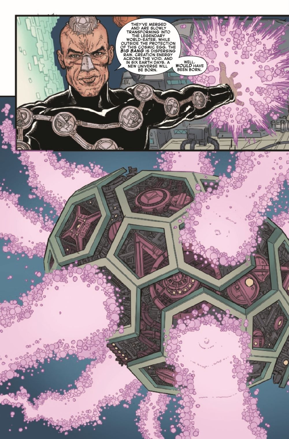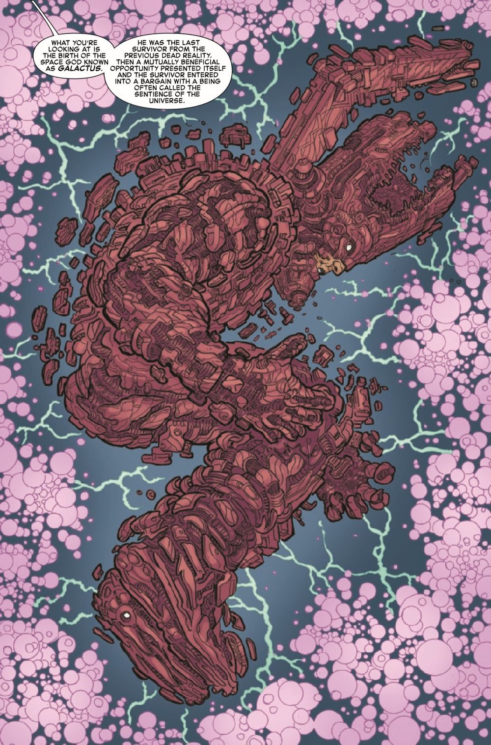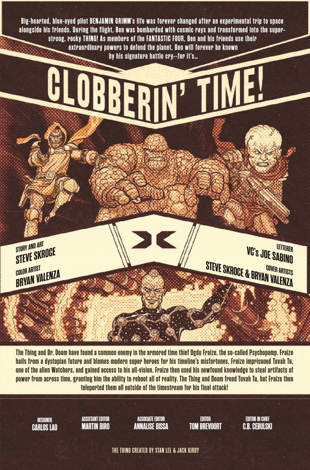 OGDU FRAIZE's plan is almost complete, he has reverse engineered every item of power across the Marvel Universe's timestream to create the PSYCHOPOMP machine, a device that will steal the creation energy of the nascent GALACTUS and the SENTIENCE of the UNIVERSE at the moment of the BIG BANG. The THING, DOCTOR DOOM and TUVAH TU are an unwilling audience to the universe's re-making. That is, unless they can get free...