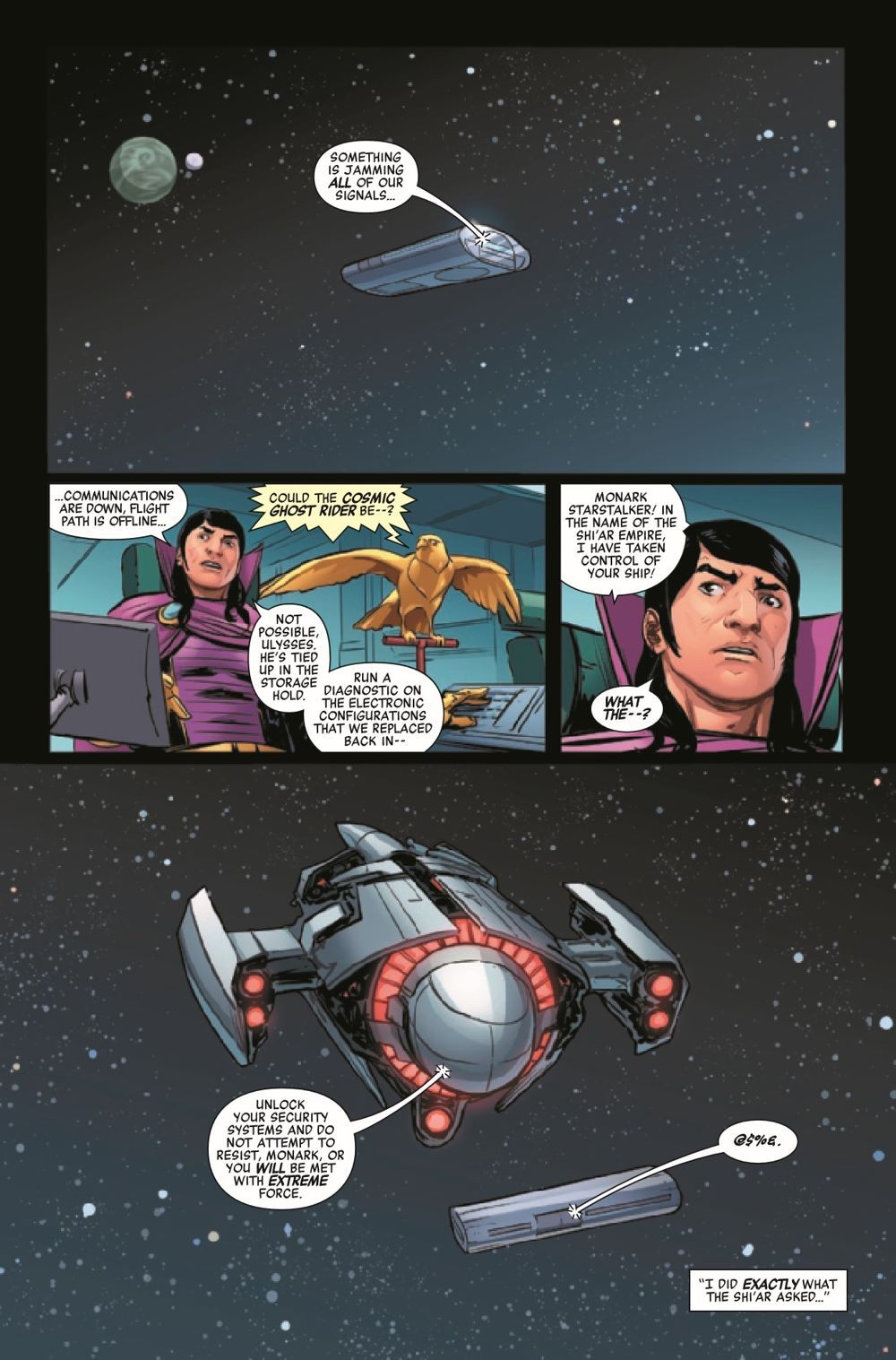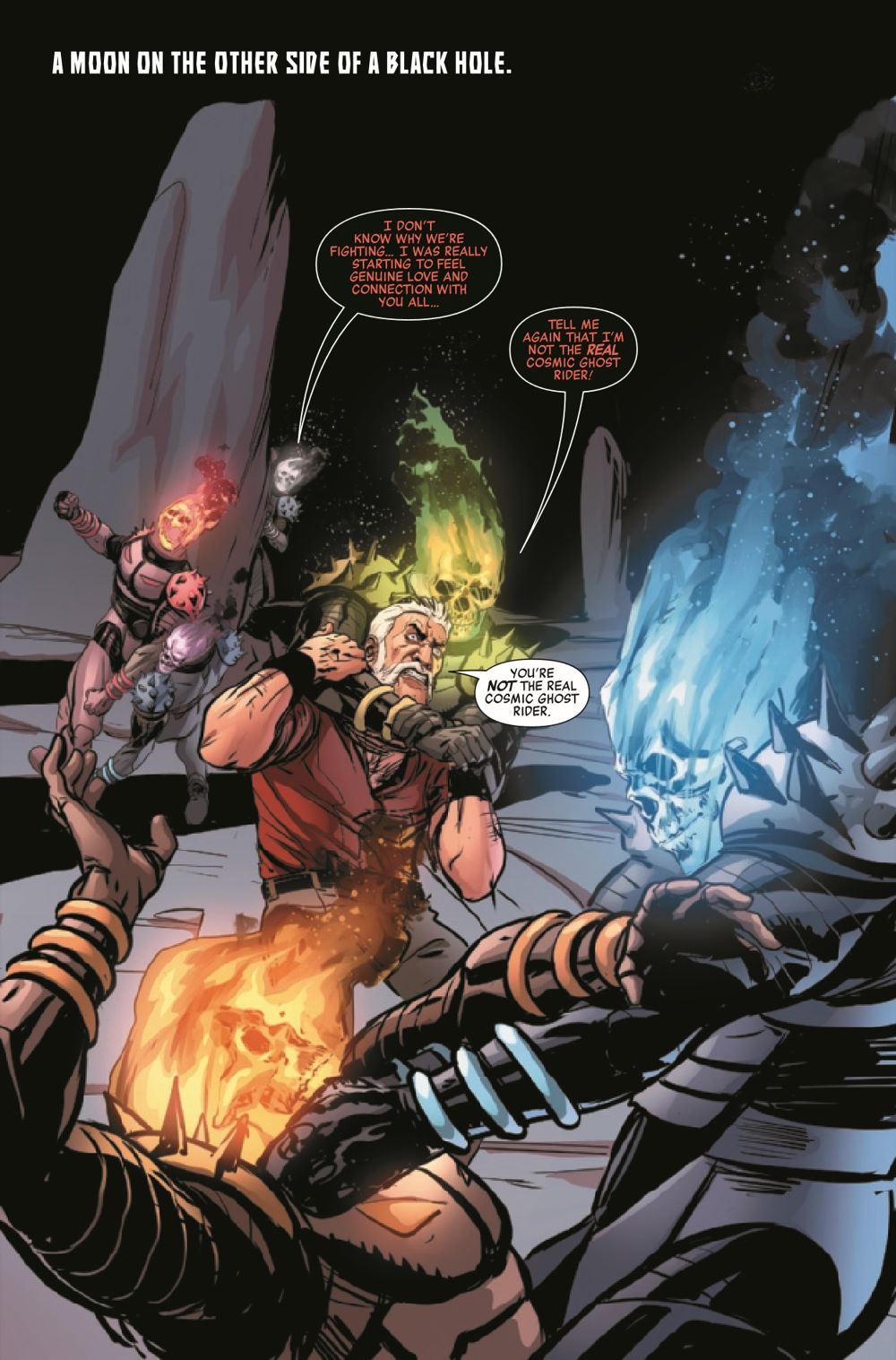 Cosmic Ghost Rider has been tested like never before as he's battled his own twisted alter ego across the galaxy. But now, trapped on an isolated moon, he must face off against an entire horde of Cosmic Ghost Riders! Who will be left alive when the moondust settles?! And one character will undergo a shocking transformation as a new force explodes into the Marvel Universe!