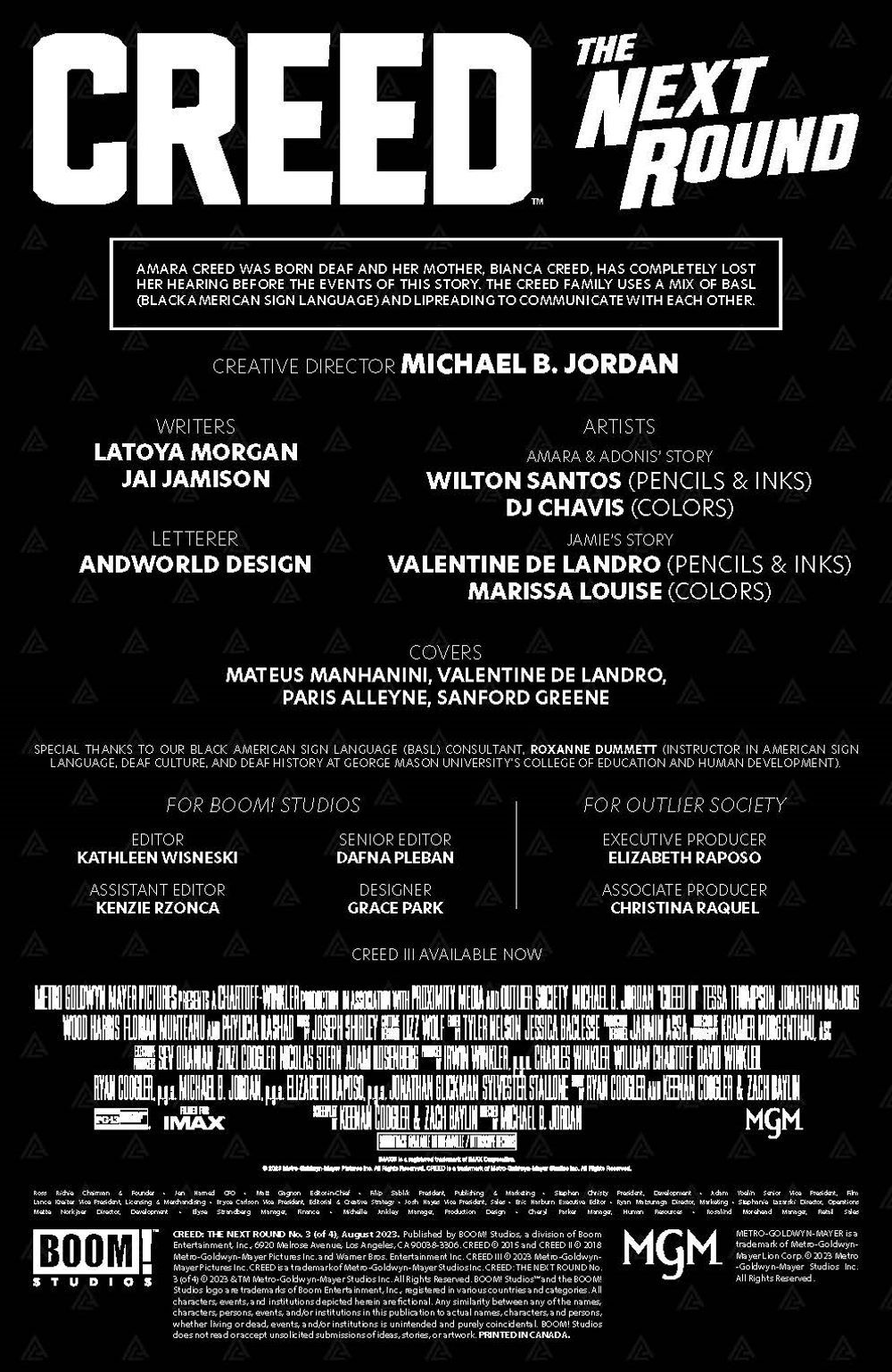 While Amara–with two trainers in an uneasy alliance–crosses paths with her greatest rival in the tournament circle, Adonis and Bianca face the cutthroat capitalism of the business world, where only one Creed will be the victor. The shocking new sponsor of the monumental upcoming fight only adds insult to injury as Adonis is forced to make a frustrating decision. Co-creator of Bitch Planet Valentine De Landro (X-Factor, Black Manta) joins the Creed fight as the guest artist alongside Creative Director Michael B. Jordan, writers LaToya Morgan and Jai Jamison and series artist Wilton Santos!