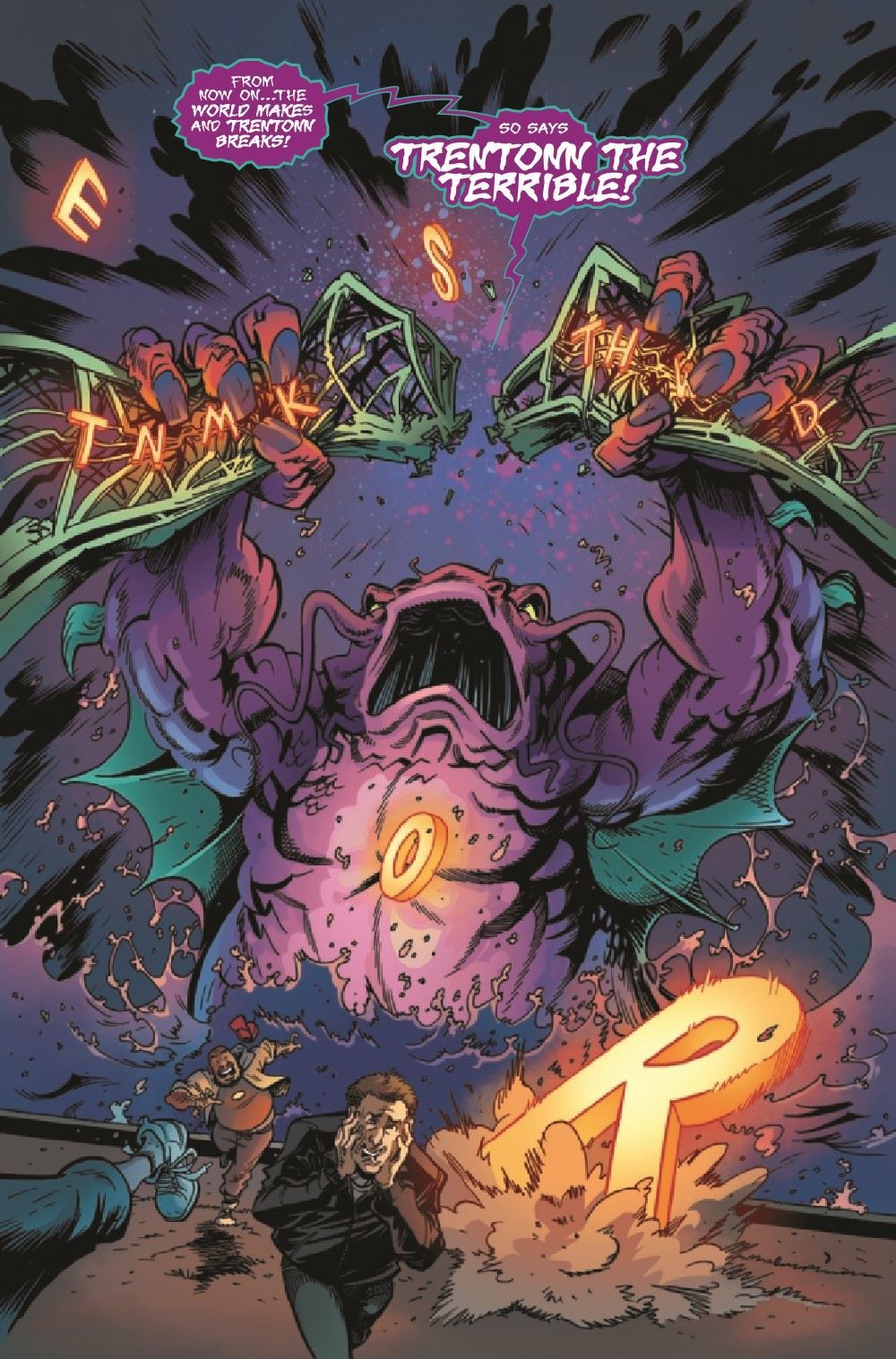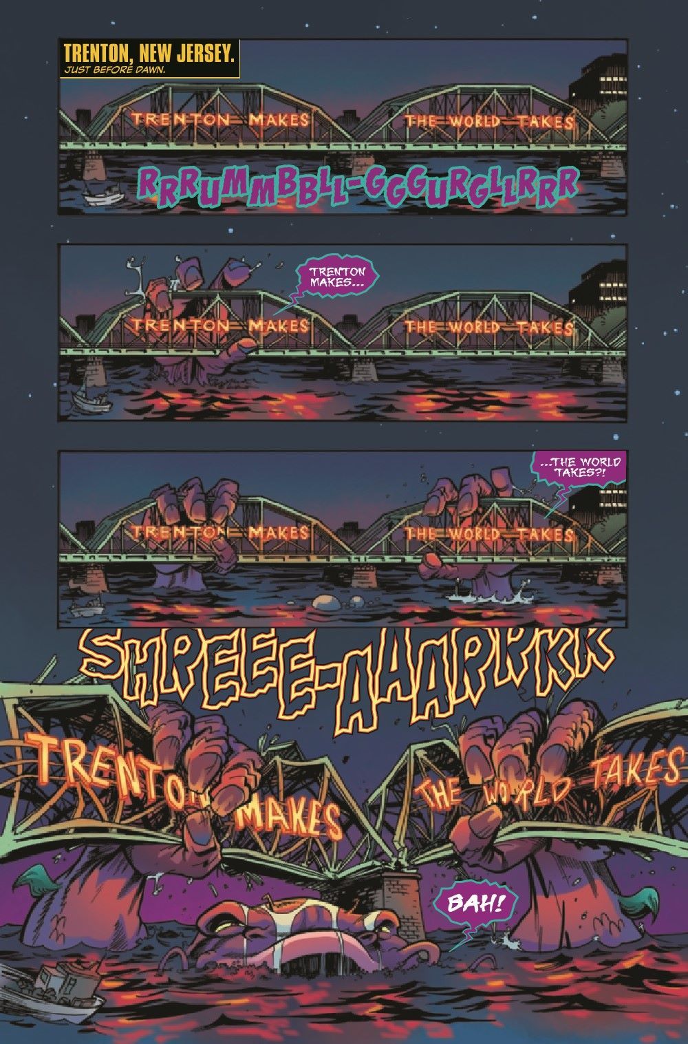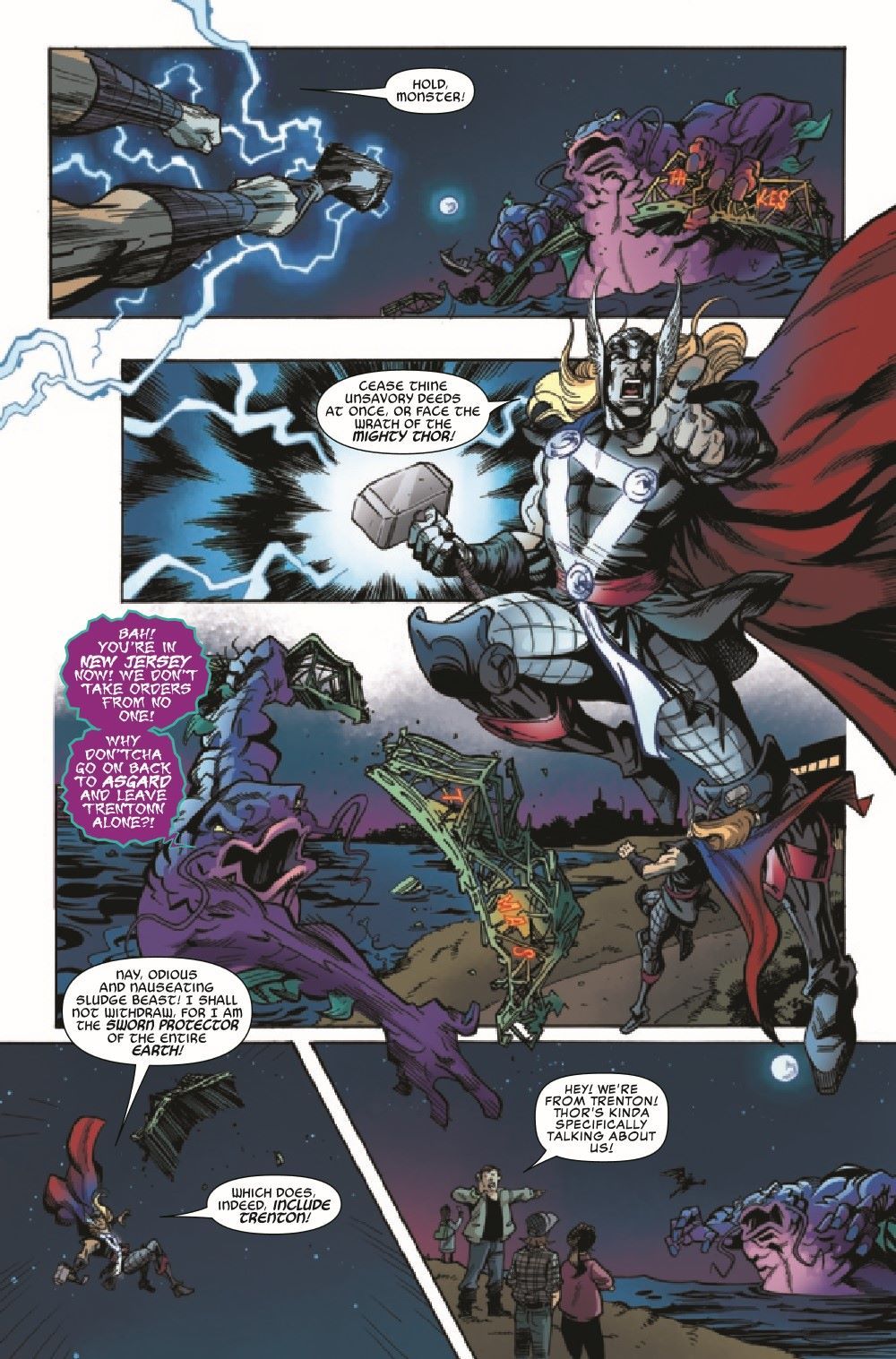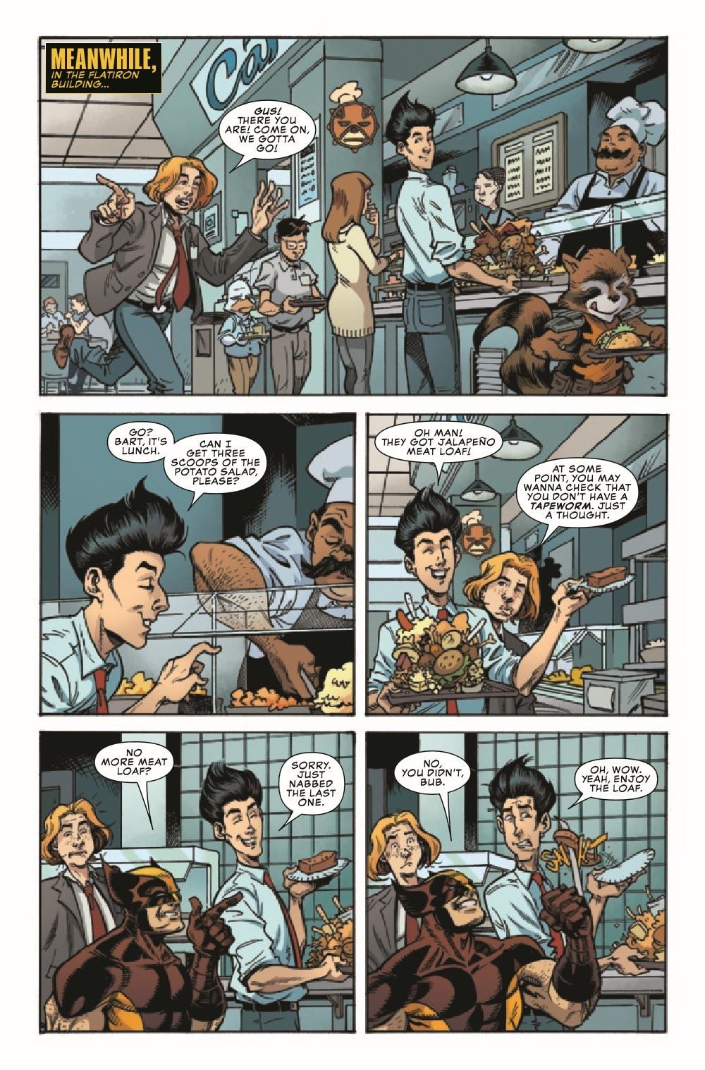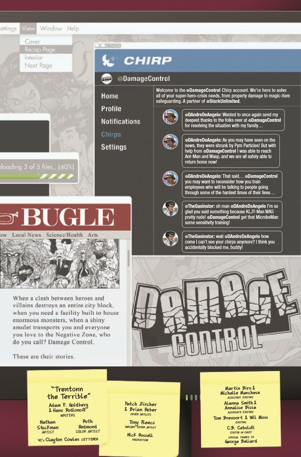 After two disastrous days of office mayhem, Head Intern Bart Rozum decides that he has to find Gus a job outside of the Flatiron Building - so he assigns Gus to the Search and Rescue unit. Bart thinks, if Gus is mostly responding to the scenes of superhuman battles after the fact, how much trouble could he really get in to? Unfortunately, on Gus' first day with Search and Rescue, the unit is summoned to New Jersey to deal with a giant mutated catfish monster who calls himself Trentonn the Terrible. ADAM F. GOLDBERG and HANS RODIONOFF write pithy dialogue while NATHAN STOCKMAN adds his visual wizardry to bring you a tale of Catfish Kaiju, Insurance Fraud and Terrigenesis with special appearances from the Black Tarantula, Hammerhead and the God of Thunder himself...the Mighty Thor!