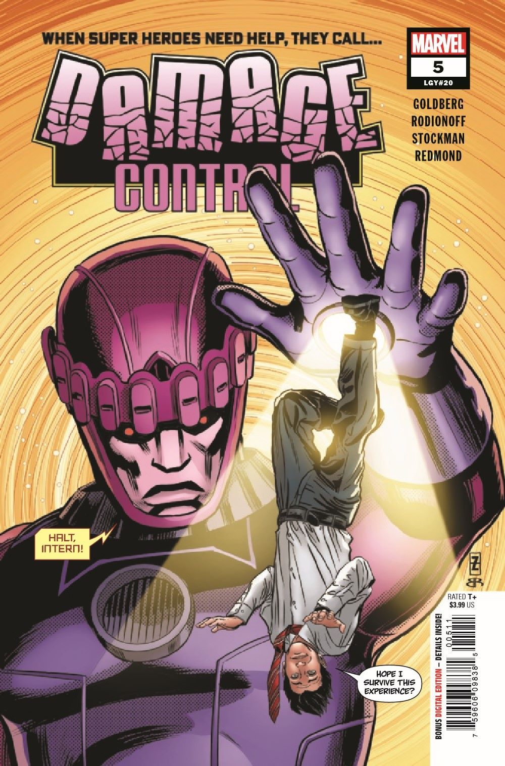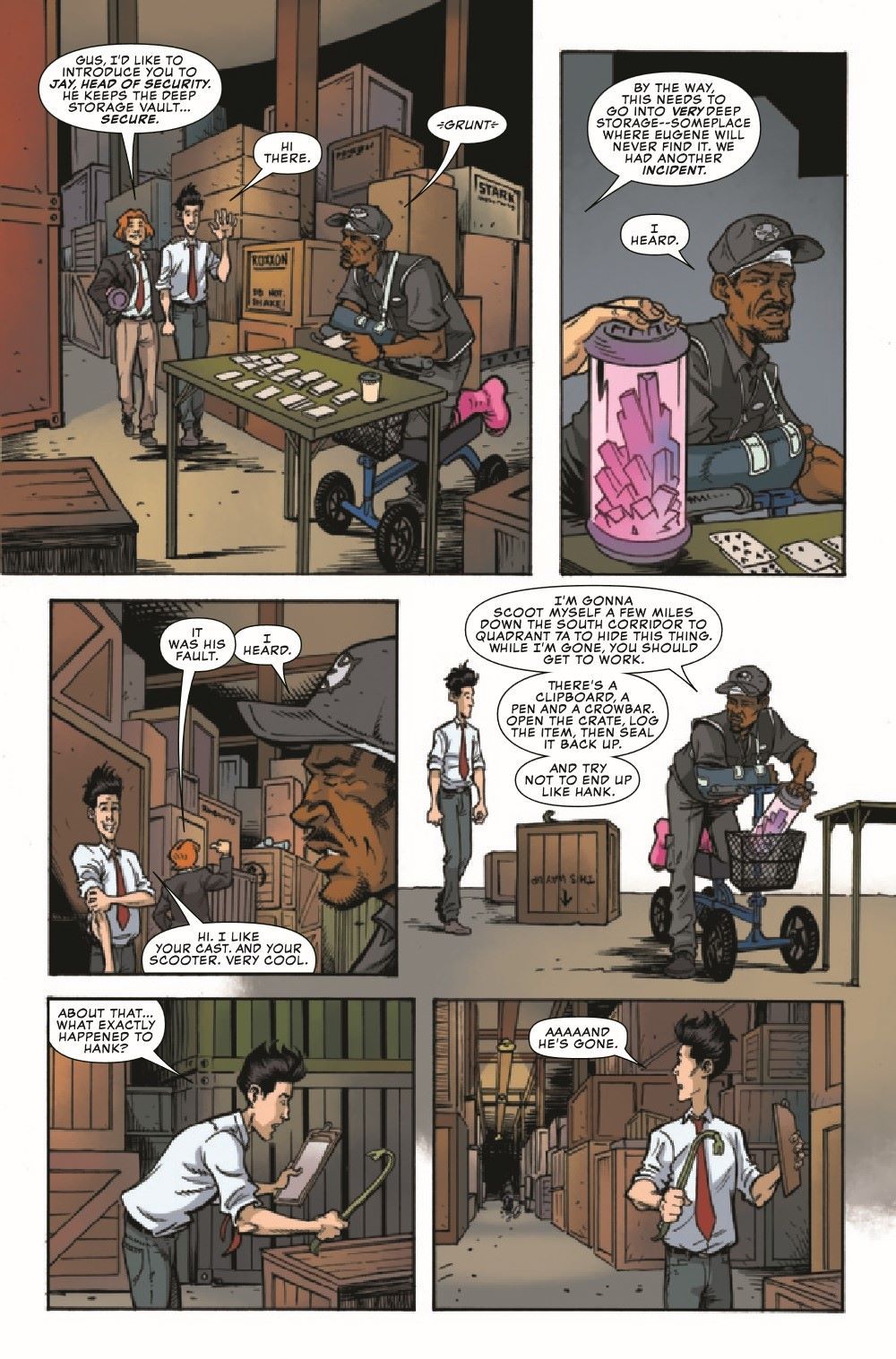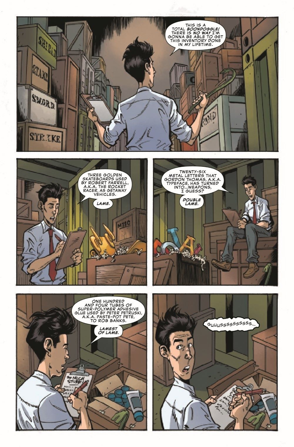 This is it... This is Gus's absolute last, last chance to find a place to fit in at Damage Control. Unfortunately, the only remaining department that will have him is the Deep Storage Vault - where he is tasked with cataloging the contents of all the endless rows of crates and containers. Seems like it should be fairly low-risk. However, this is Gus we're talking about, and before the day is over, there will be a massive morass of mechanical mayhem perpetrated by Machine Man, Jocasta, Sentry 459, TESS-ONE and Sentinels galore! HANS RODIONOFF and ADAM F. GOLDBERG continue to churn out hilarious word combinations, and NATHAN STOCKMAN serves up visual punchlines that will delight and entertain you as we conclude Gus' epic journey through Damage Control!