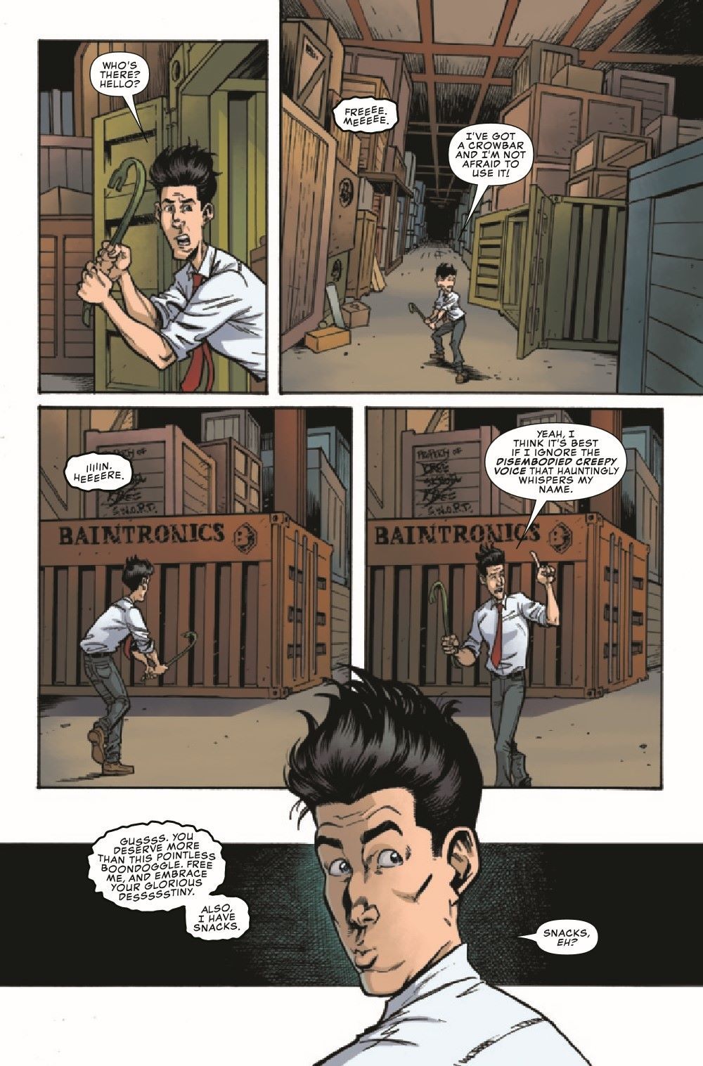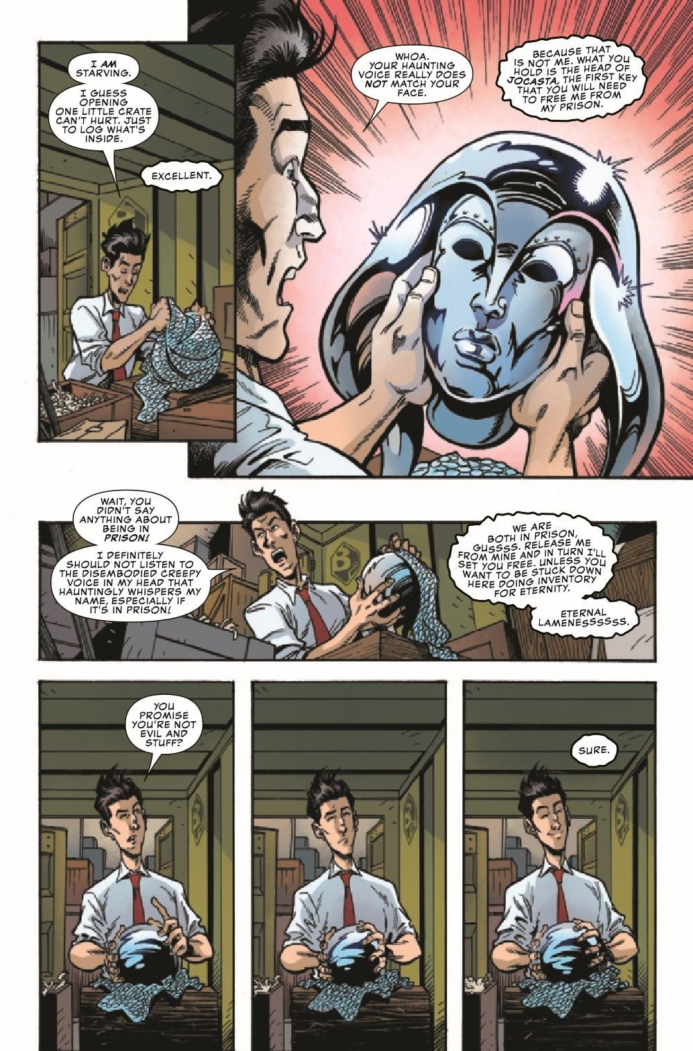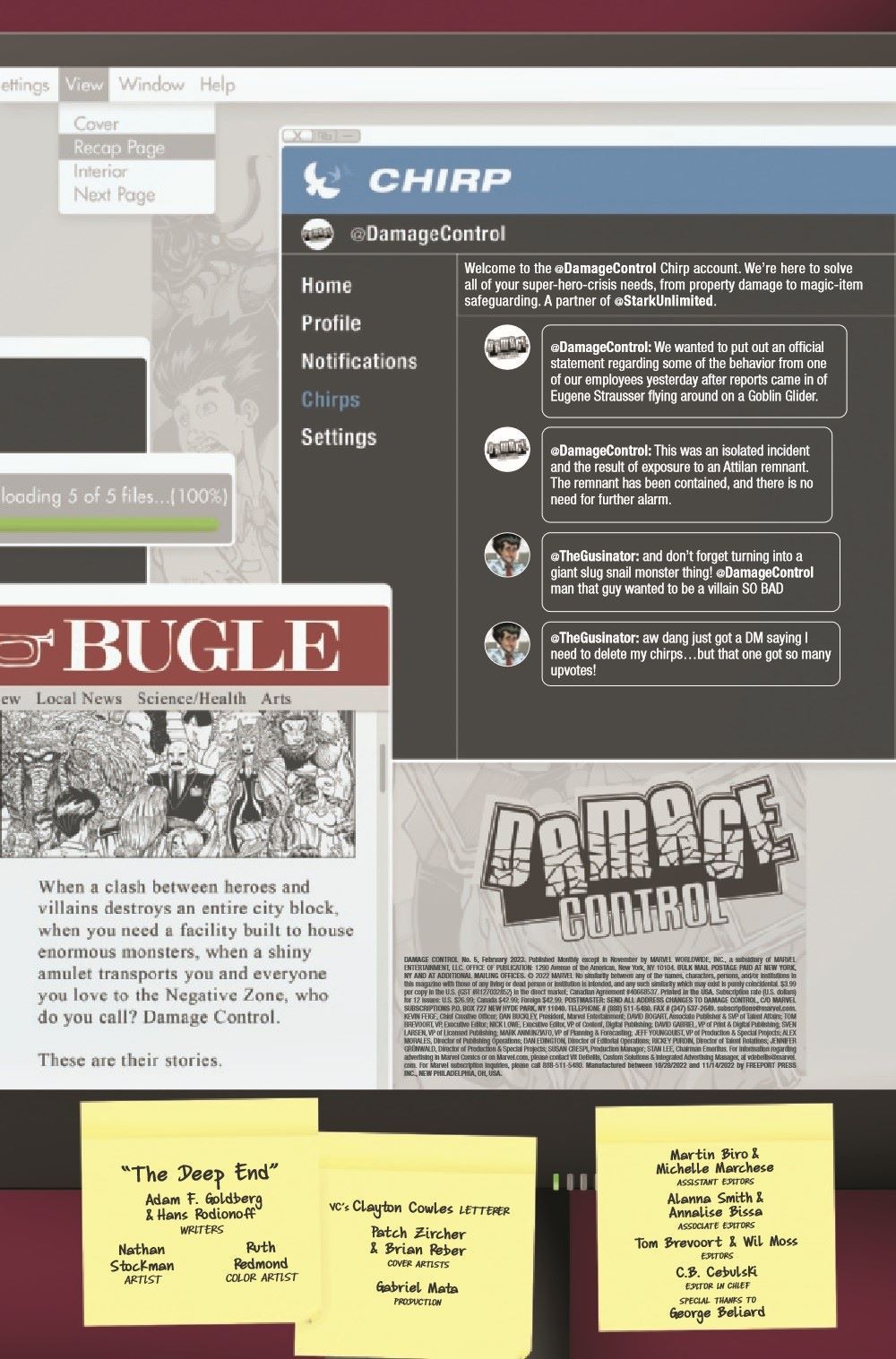 This is it... This is Gus's absolute last, last chance to find a place to fit in at Damage Control. Unfortunately, the only remaining department that will have him is the Deep Storage Vault - where he is tasked with cataloging the contents of all the endless rows of crates and containers. Seems like it should be fairly low-risk. However, this is Gus we're talking about, and before the day is over, there will be a massive morass of mechanical mayhem perpetrated by Machine Man, Jocasta, Sentry 459, TESS-ONE and Sentinels galore! HANS RODIONOFF and ADAM F. GOLDBERG continue to churn out hilarious word combinations, and NATHAN STOCKMAN serves up visual punchlines that will delight and entertain you as we conclude Gus' epic journey through Damage Control!