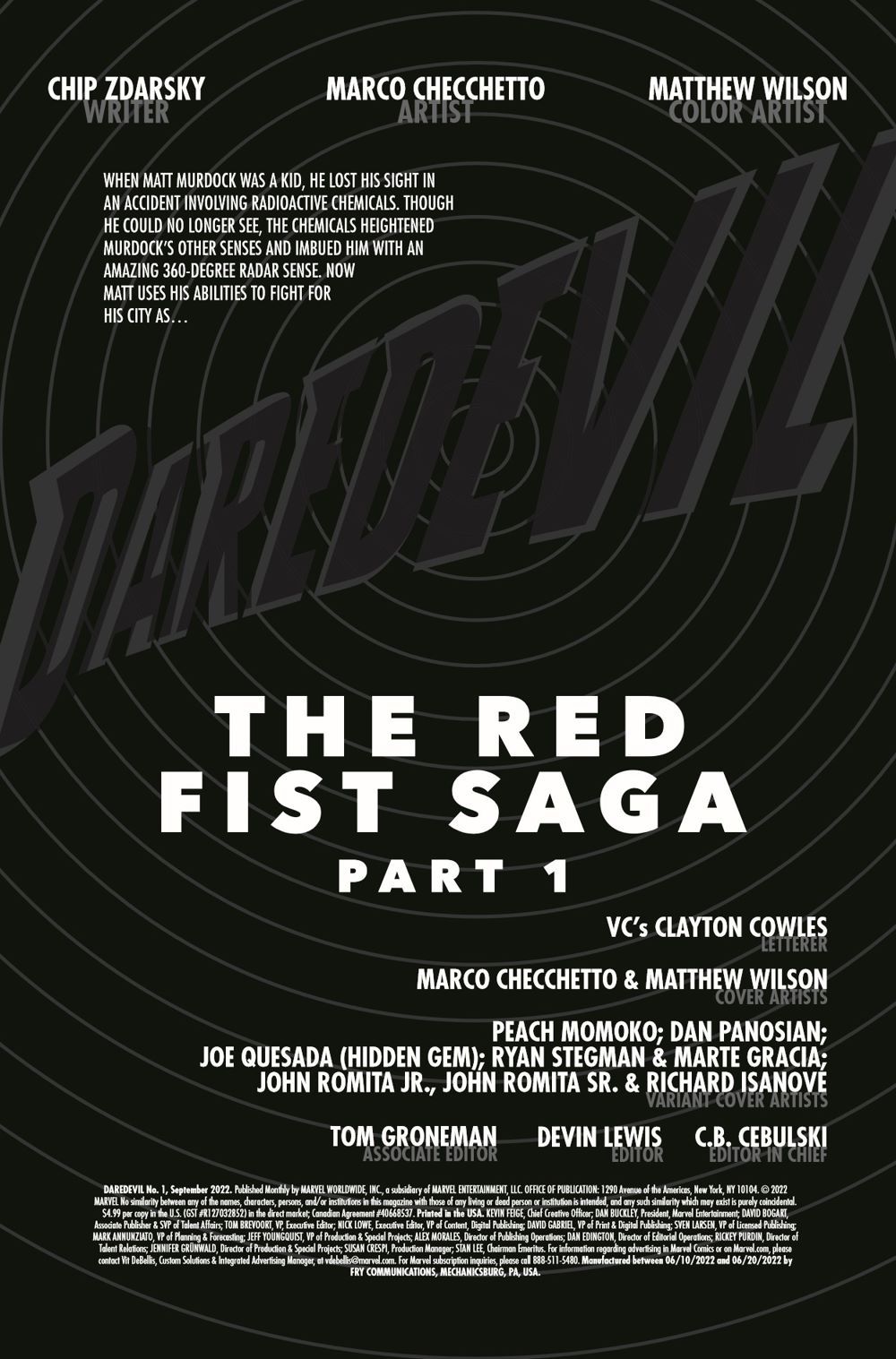 AN ALL-NEW ERA OF DAREDEVIL STARTS HERE! After the shocking events of DEVIL'S REIGN, what is left of DAREDEVIL? Who lived, who died, and who is left to pick up the pieces? CHIP ZDARSKY and his superstar collaborator MARCO CHECCHETTO turn their gaze to a future full of peril and pain, in this - the explosive beginning of an all new era for Hell's Kitchen's guardian devil, and the most important DAREDEVIL issue of the year (until next month.)!