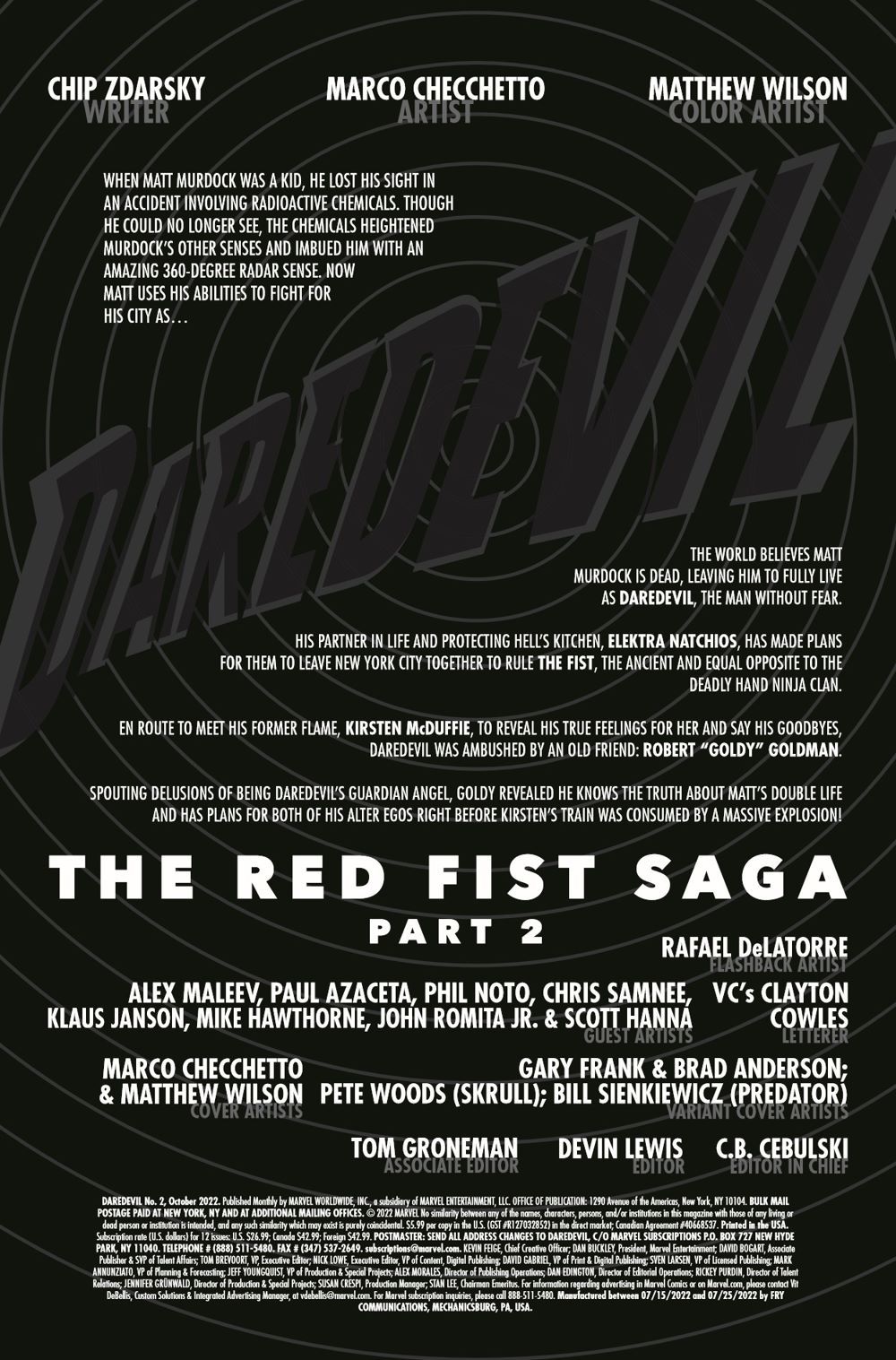 After DEVIL'S REIGN, everything it has ever meant to be DAREDEVIL has changed. Thanks to ELEKTRA and her newfound role as the Woman Without Fear, Daredevil is more ambitious than EVER, with a who's-who of creators from across the fabled character's history (and some can't-miss surprises along the way), this oversized epic - featuring art from Alex Maleev, Chris Giarrusso, Chris Samnee, John Romita Jr., Klaus Janson, Mike Hawthorne, Paul Azaceta, Phil Noto, Rafael de Latorre, and more - kicks the next year of Chip Zdarsky and Marco Checchetto's landmark run on DAREDEVIL off in explosive style!
