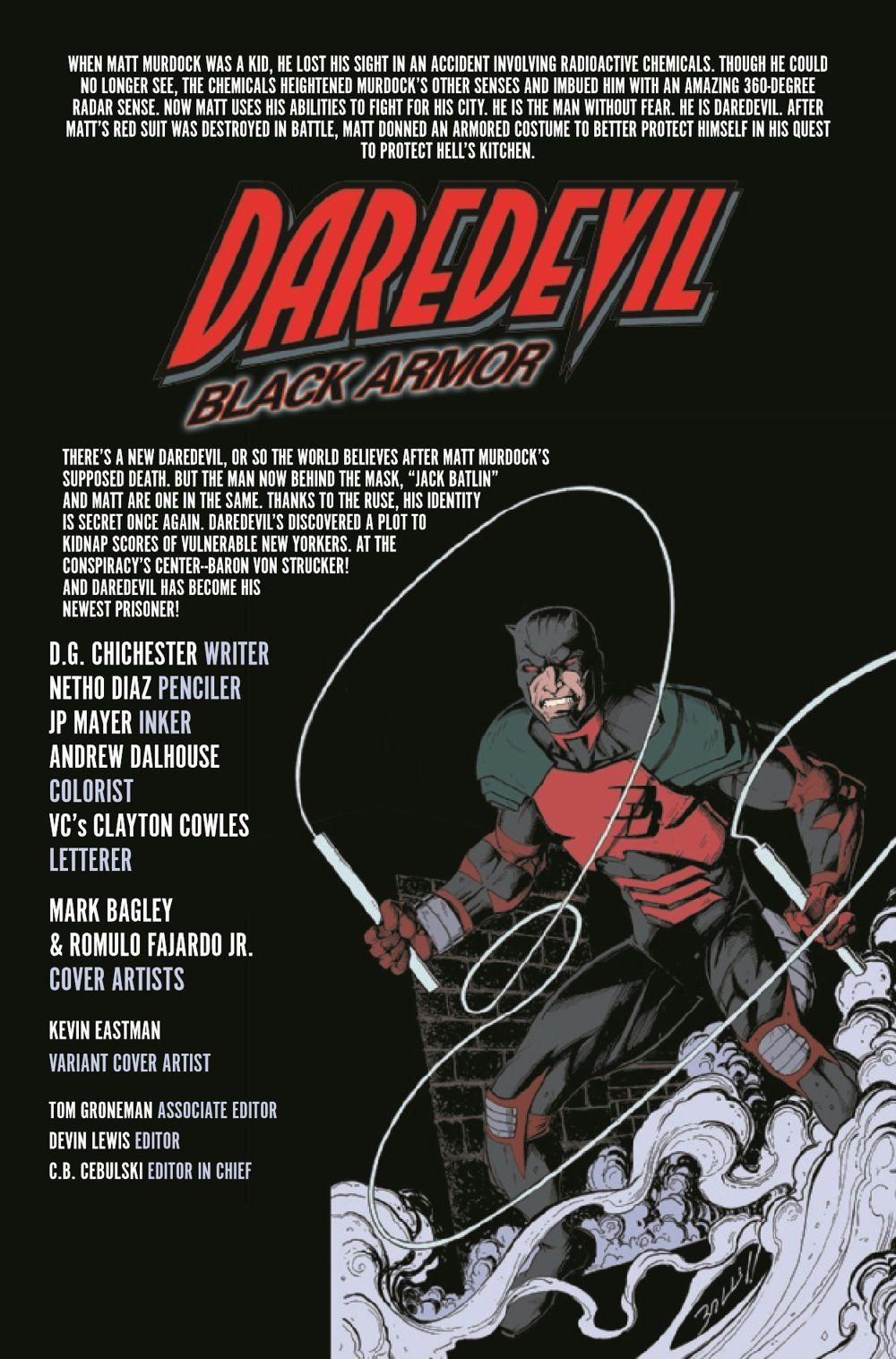 BACK IN BLACK! Friends and foes alike become embroiled in the battle for their lives beneath the streets of Hell's Kitchen! With a deadly puppet master who returning and legendary writer D.G. Chichester is no stranger to and your new favorite artist Netho Diaz, this series has only just started to turn up the heat!