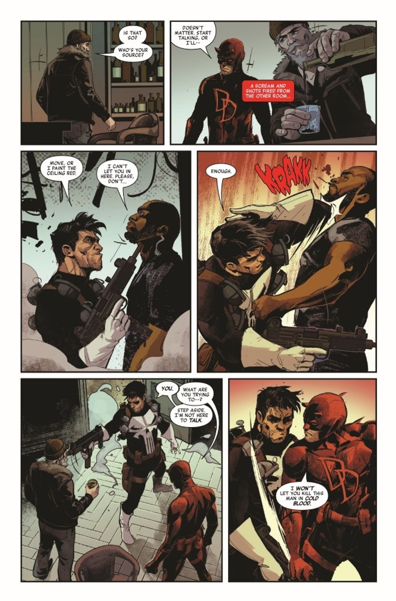 Spurred by the power vacuum left by the absent GNUCCI CRIME FAMILY, an unprecedented crime wave has flooded the streets of New York! Left to face the rising violence and vitriol, DAREDEVIL and THE PUNISHER will have to put aside their differences to keep the criminals of New York from consuming it altogether!