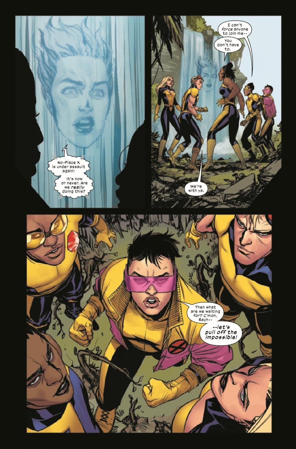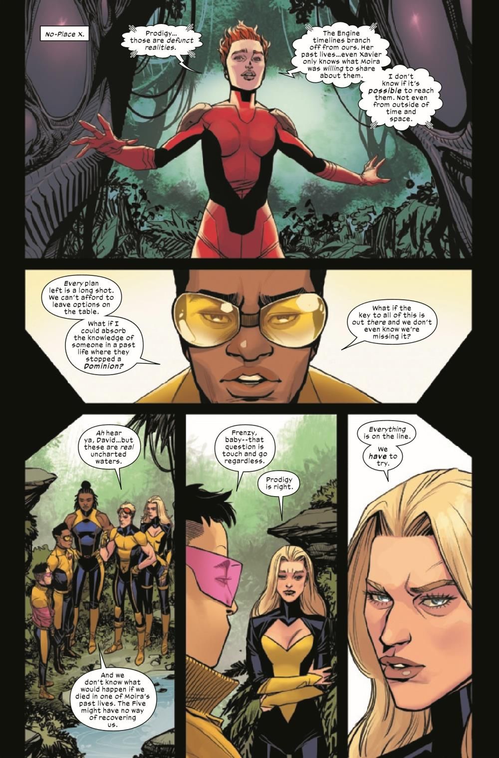 THE IMPOSSIBLE TEAM ON AN IMPOSSIBLE QUEST! The Dead X-Men leap across time and space in a last-ditch effort to prevent catastrophe, but they're not the only ones breaking through the fabric of reality! As these five mutants go places no one has gone before, a cloaked figure stalks them from the shadows…and nothing will survive if she reaches her goal!
