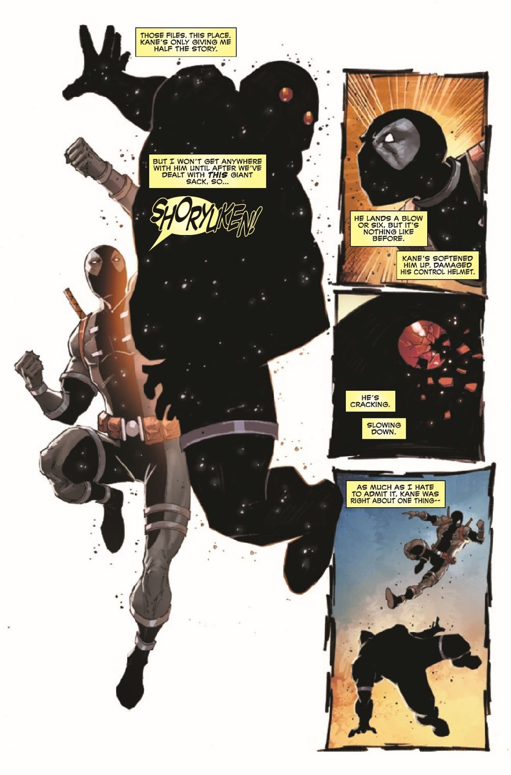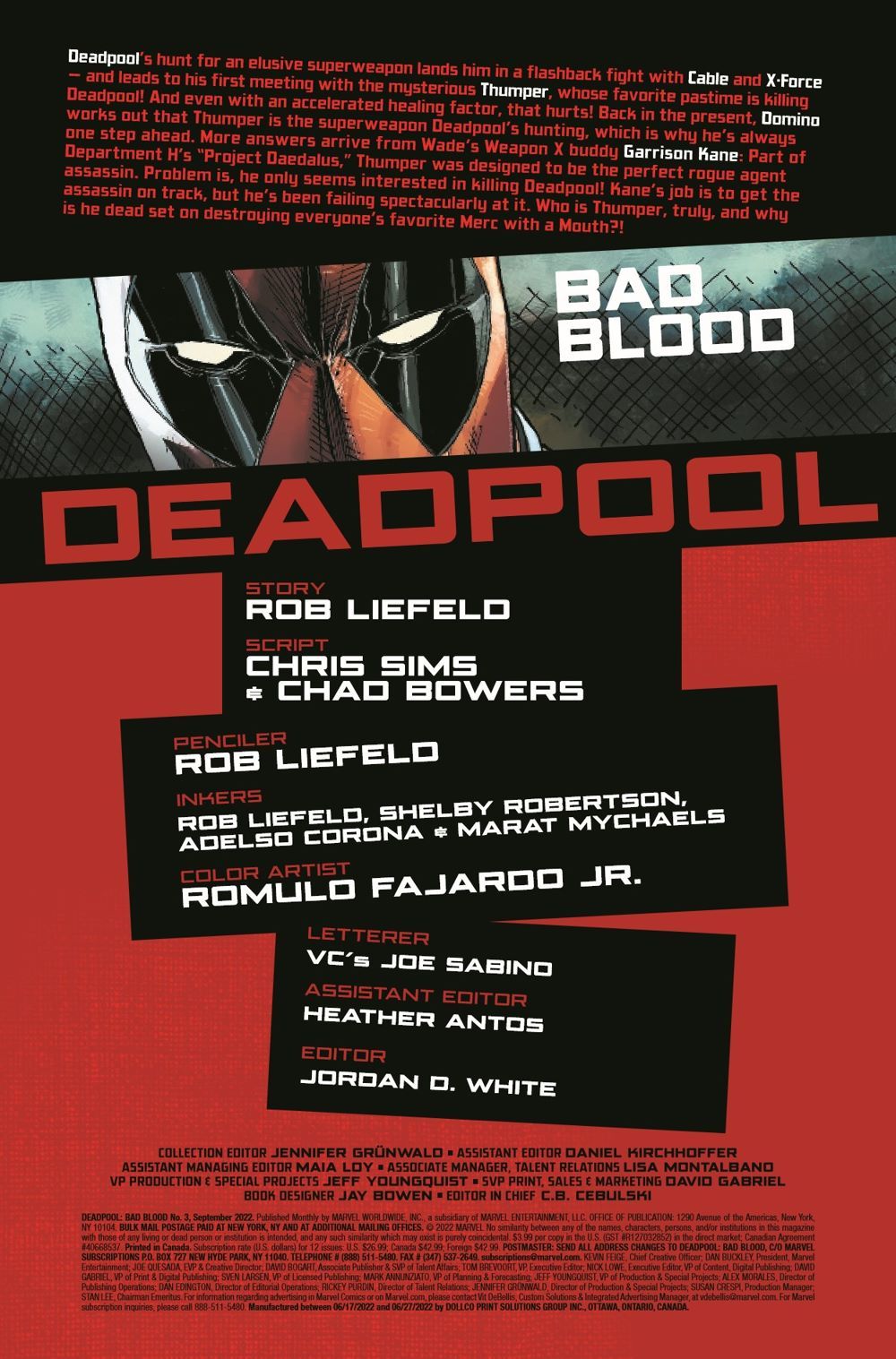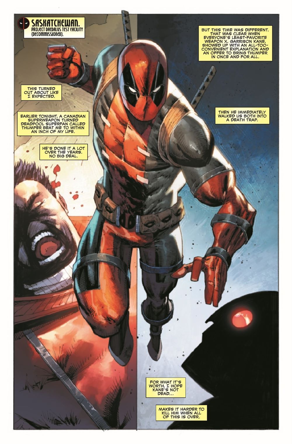 ISSUE #3 - Thumper was supposed to be Canada's answer to the Winter Soldier, a programmable killing machine who can assassinate any target! There's only one problem: On each mission, he goes rogue and hunts down Deadpool instead! That's bad news for Canada - and even worse news for Wade Wilson, who's no fan of the near-fatal beatings that Thumper administers every chance he gets! Now, with old pal Garrison Kane by his side, Deadpool faces the ultimate rematch against Thumper - but can he survive long enough to learn the truth about his single-minded nemesis?
