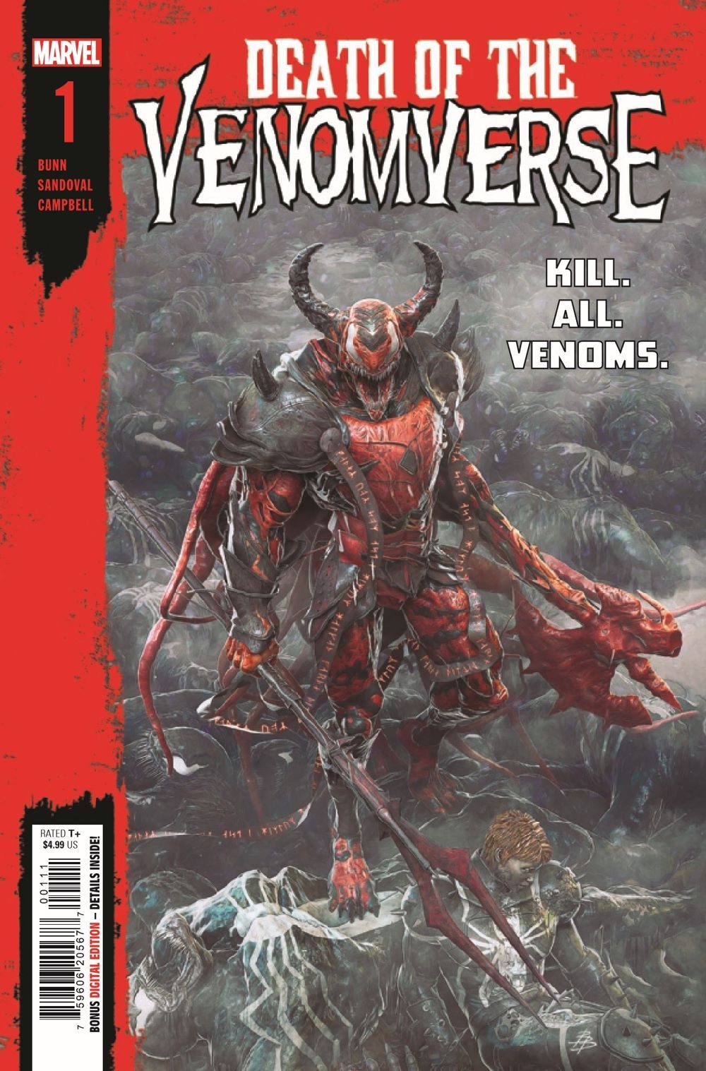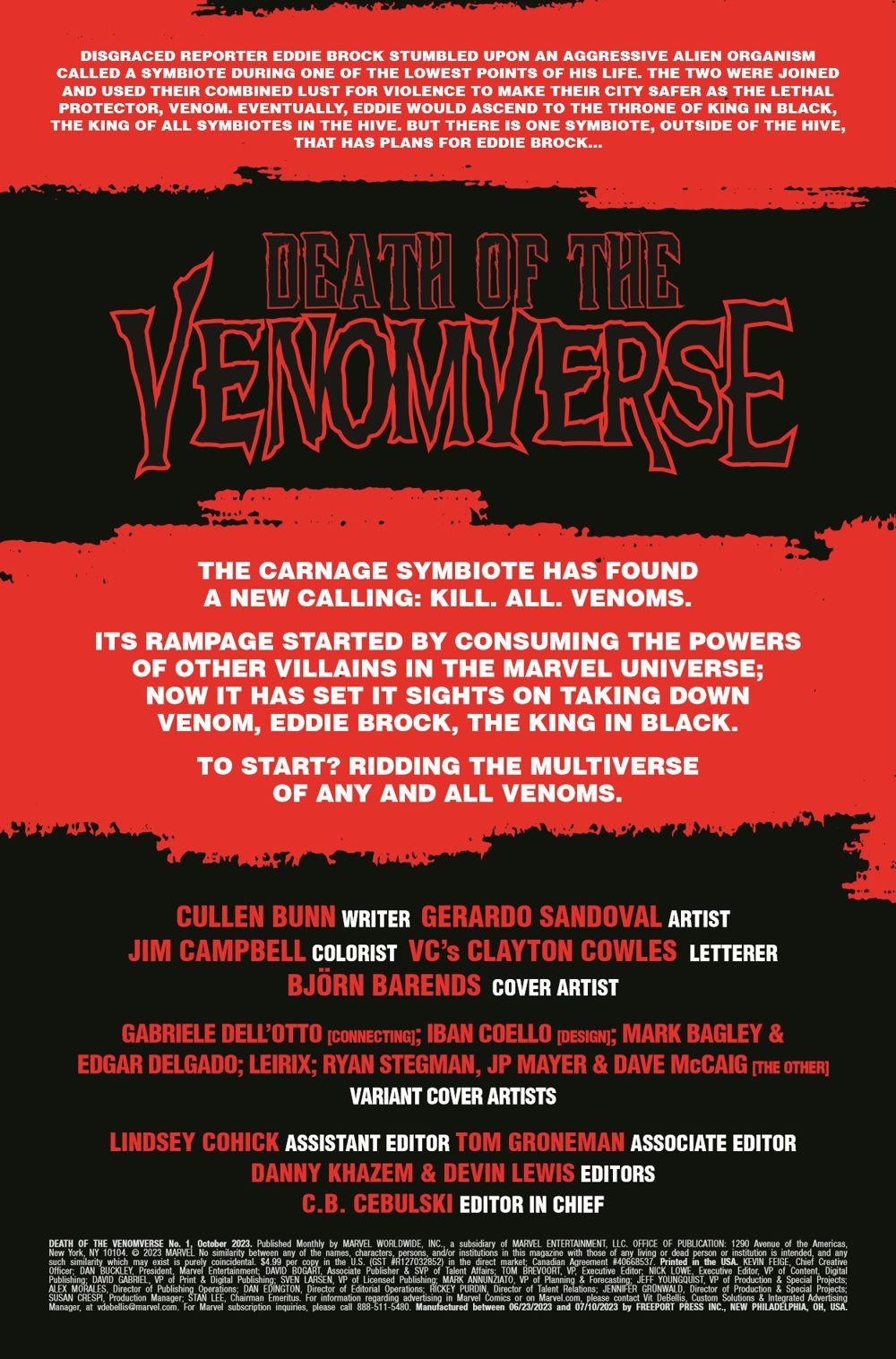 THE END OF THE VENOMVERSE IS HERE! CULLEN BUNN and GERARDO SANDOVAL reunite to bring the symbiotic ax down on the VENOMVERSE! CARNAGE has been building his powers up, extracting unique abilities from many villains throughout the MARVEL UNIVERSE to the point of traversing the Multiverse with ONE GOAL: KILL ANY AND ALL VENOMS!