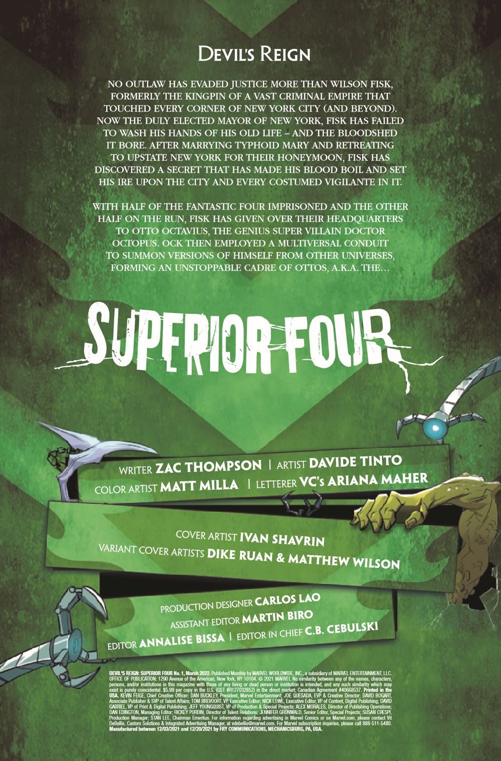 THE FANTASTIC ARE NO MORE. LONG LIVE...THE SUPERIOR FOUR. Otto Octavius has acquired a taste for the infinite. Empowered by Wilson Fisk, Doctor Octopus faces a tantalizing, unprecedented opportunity to scour the Multiverse, amassing an army of…himself. An army to march on our reality, proving Otto's supremacy - and it all begins with his SUPERIOR FOUR