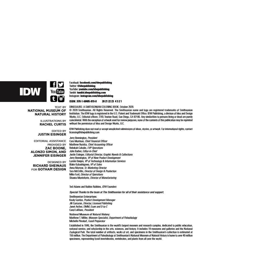 Dinosaurs come to life—with your help! The Smithsonian's National Museum of Natural History and IDW Publishing present a fascinating new coloring book that provides a beautiful and informative tour through the prehistoric world of dinosaurs.
