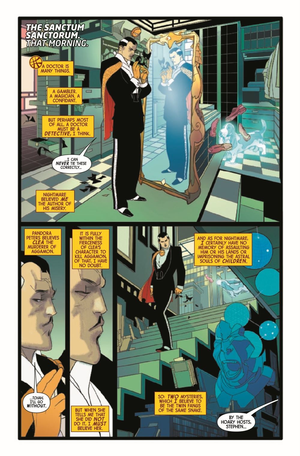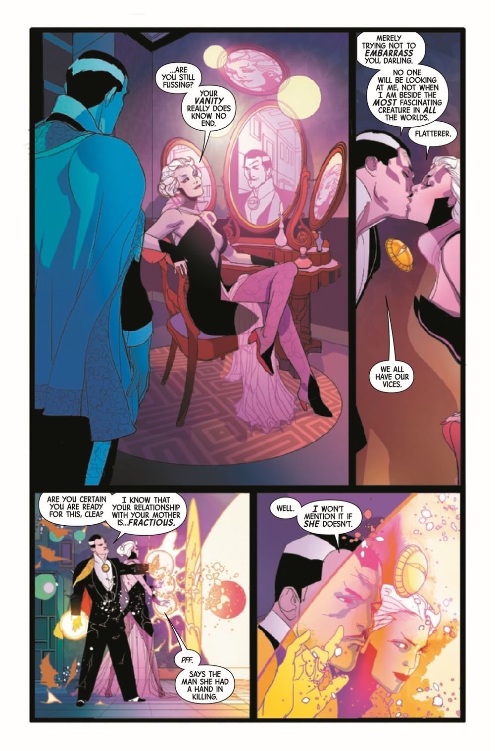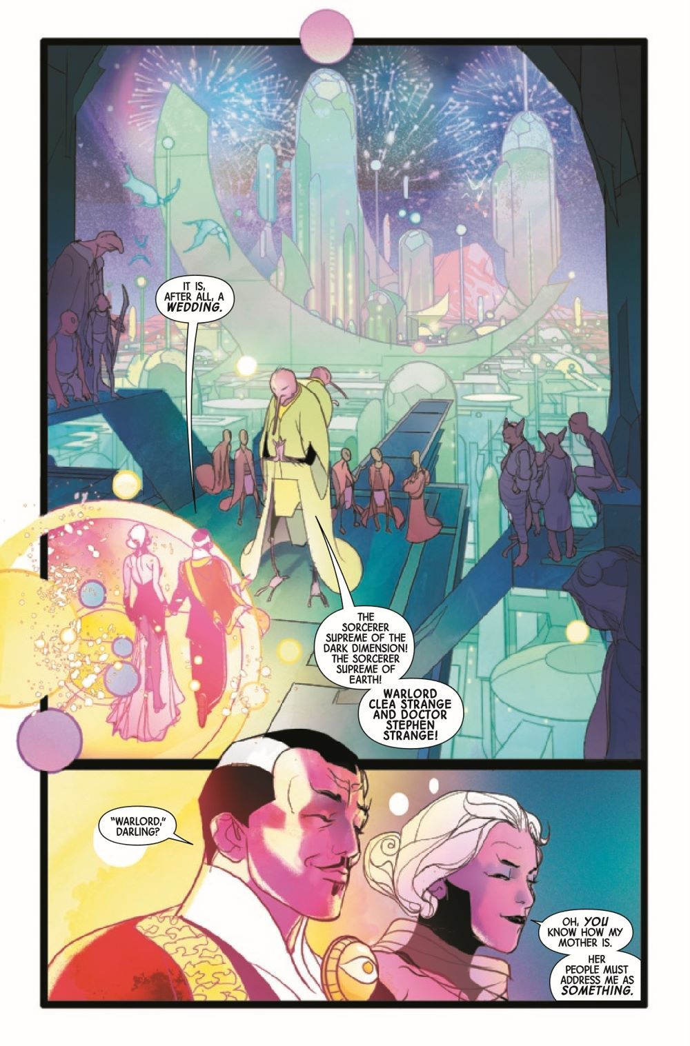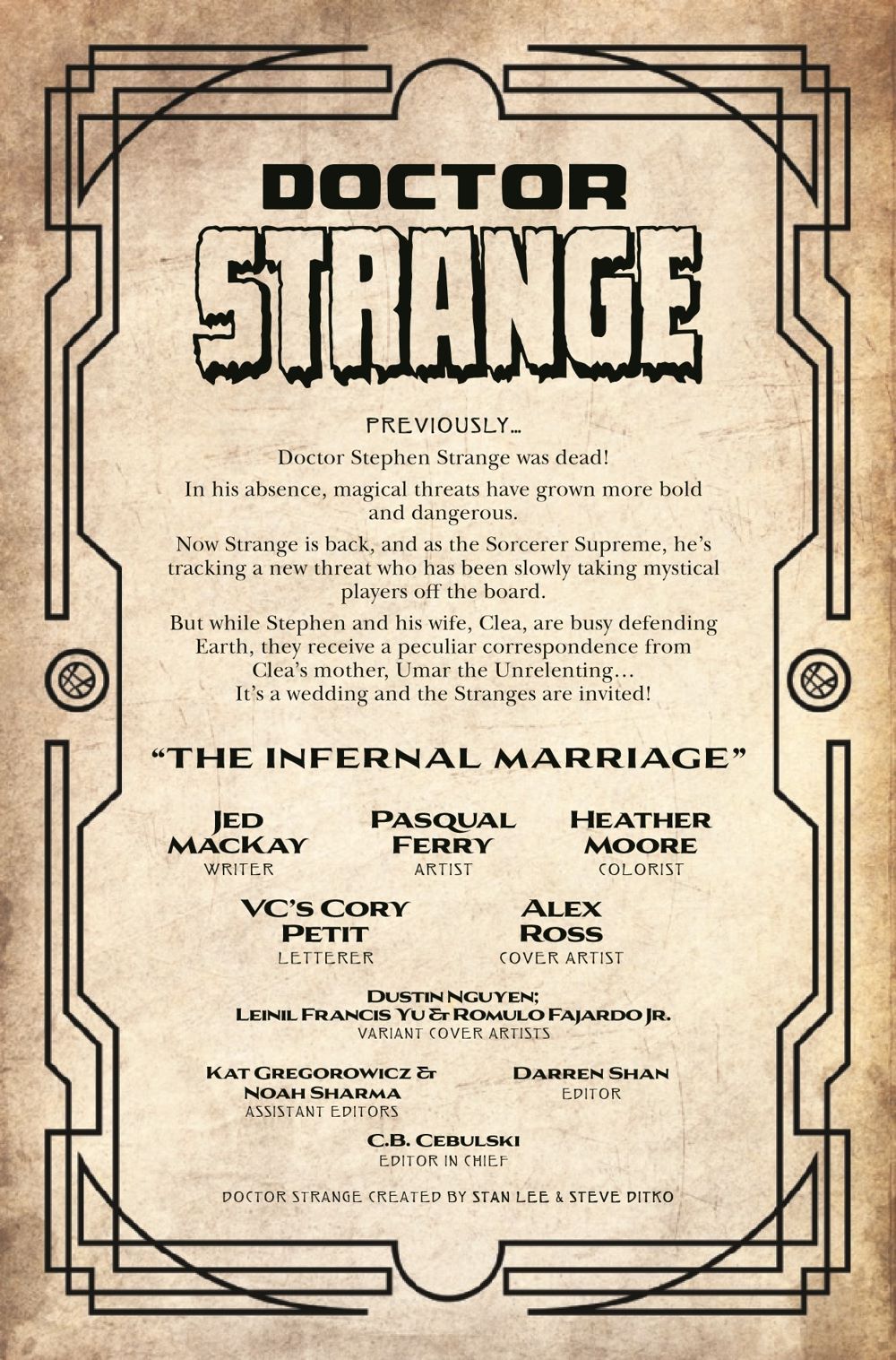 DARK WEDDING BELLS RINGING! Strange and Clea have been invited to an interdimensional wedding. But when the bride is Clea's own mother, Umar the Unrelenting, it's not exactly the family event the Stranges want to attend. Especially when the guests are mysteriously being murdered!
