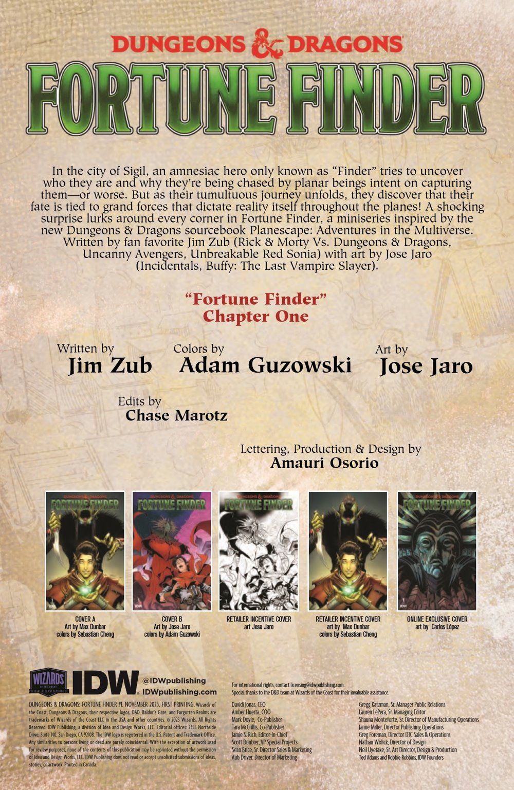 In the city of Sigil, an amnesiac hero only known as "Finder" tries to uncover who they are and why they're being chased by planar beings intent on capturing them—or worse. But as their tumultuous journey unfolds, they discover that their fate is tied to grand forces that dictate reality itself throughout the planes! A shocking surprise lurks around every corner in Fortune Finder, a miniseries inspired by the new Dungeons & Dragons sourcebook Planescape: Adventures in the Multiverse. Written by fan favorite Jim Zub (Rick & Morty Vs. Dungeons & Dragons, Uncanny Avengers, Unbreakable Red Sonia) with art by Jose Jaro (Incidentals, Buffy: The Last Vampire Slayer).