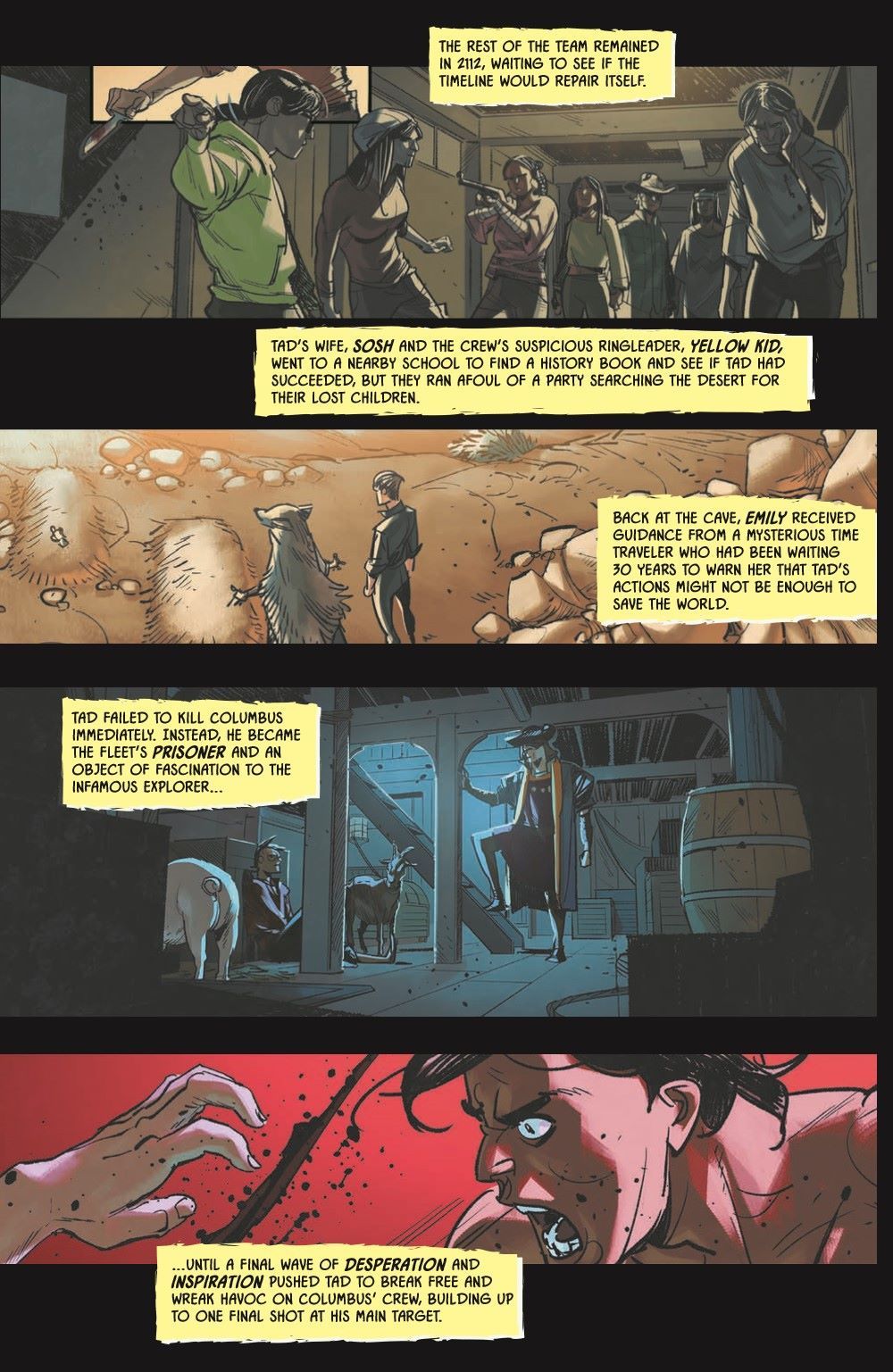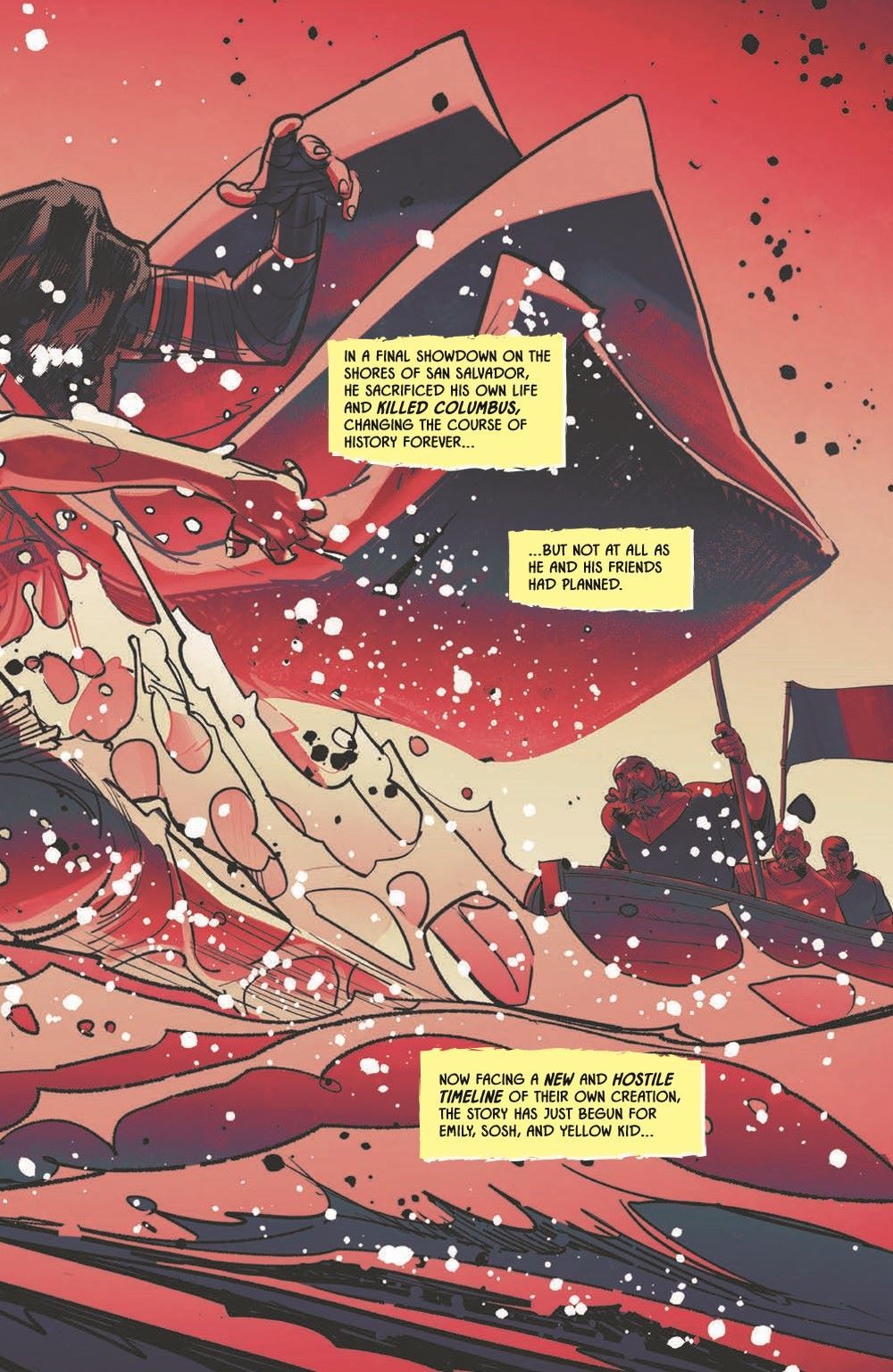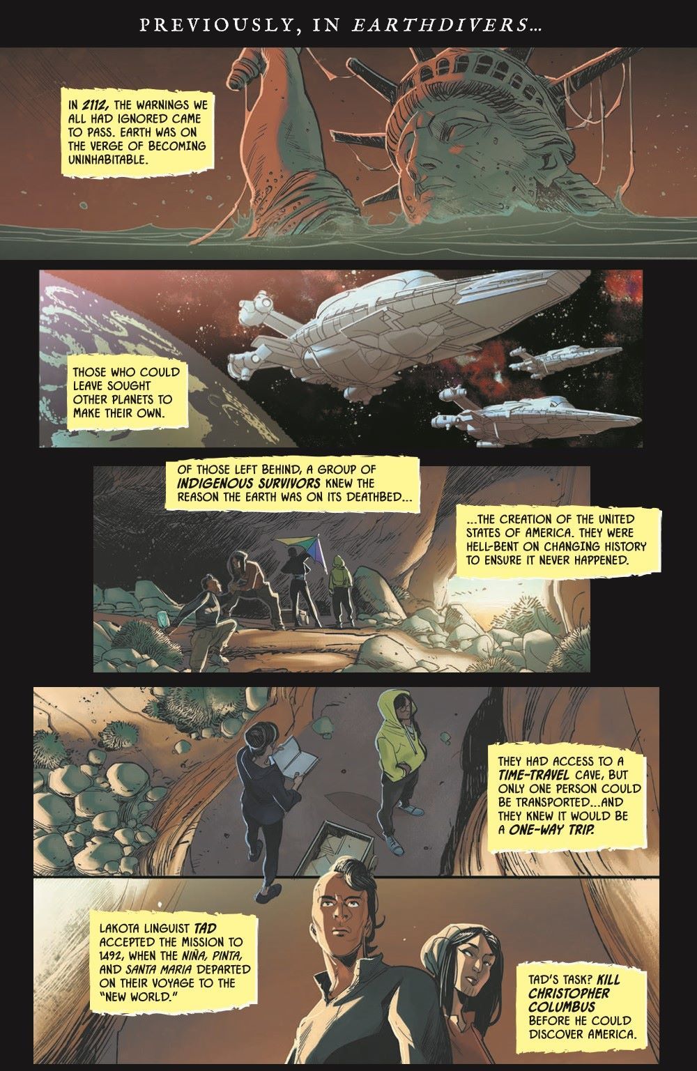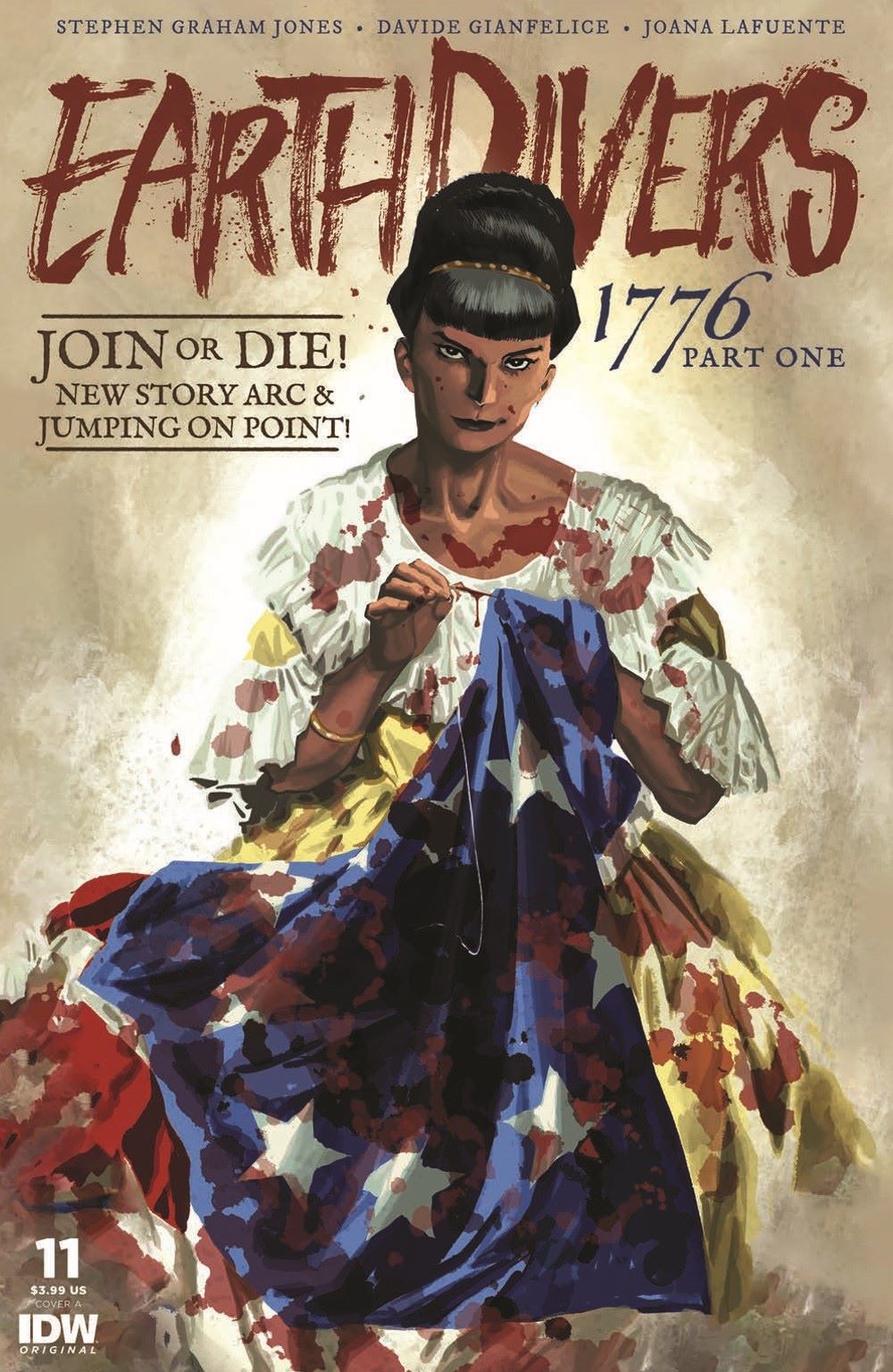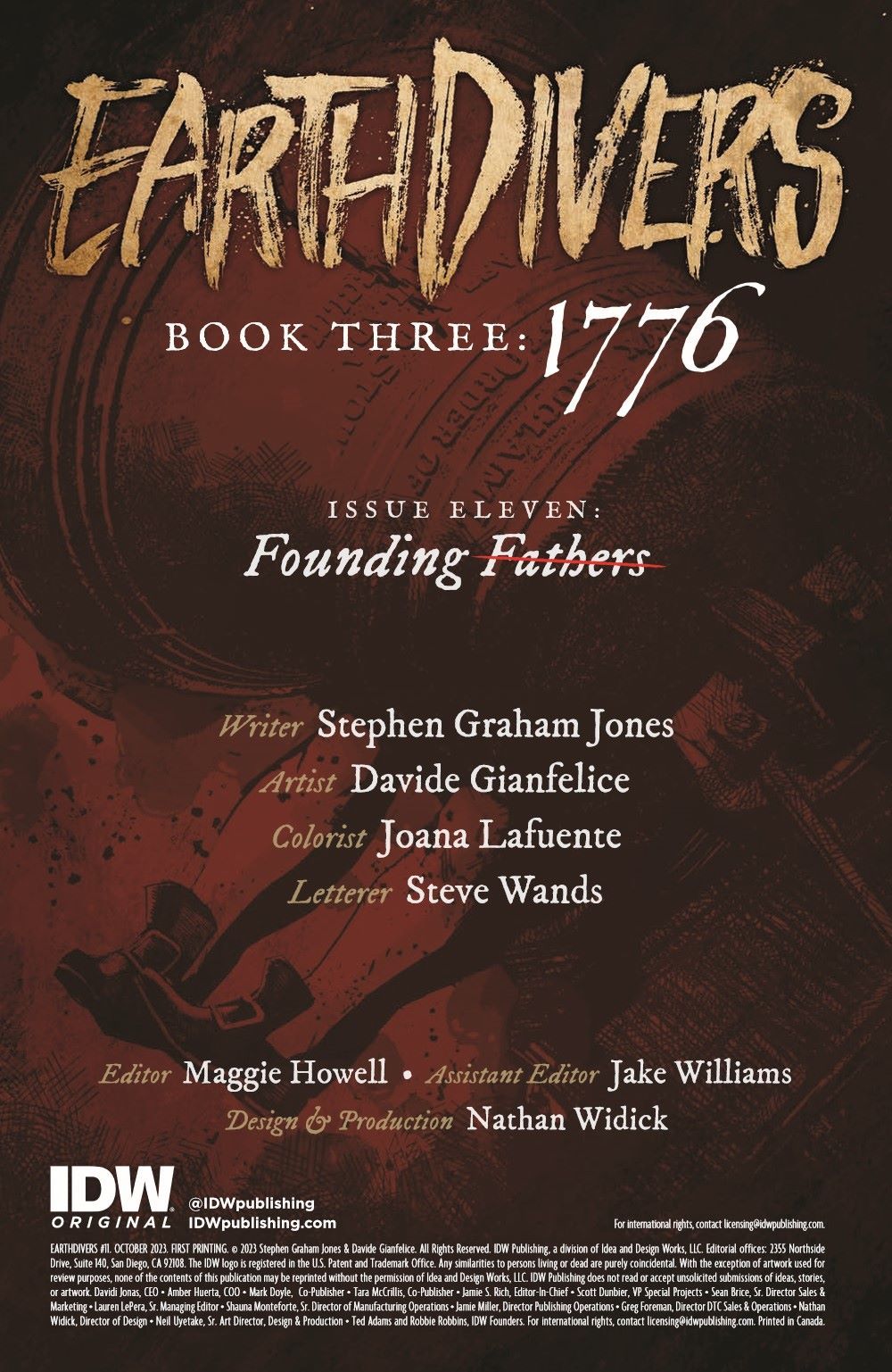 Join or die! New York Times bestselling author Stephen Graham Jones and artist Davide Gianfelice are back in action for the next chapter of their heart-pounding historical sci-fi slasher EARTHDIVERS!A team of time traveling Indigenous survivors had one goal: save the world from an American apocalypse by sending one of their own on a suicide trip to kill Christopher Columbus and course-correct world history. Mission accomplished? Maybe not. Blood is still soaking into the sands of San Salvador as Tad's friends suffer the consequences of his actions—and their own slippery moral rationalizations—620 years in the future. Faced with a choice to watch the world crumble or double down on their cause, the path is clear for Seminole two-spirit Emily: it's personal now, and there's no better time and place to take another stab at America than Philadelphia, 1776.But where violence just failed them, she has a new plan: pass as a man, infiltrate the Founding Fathers, and use only wit and words to carve out a better future in the Declaration of Independence. No need to cut throats this time…right?