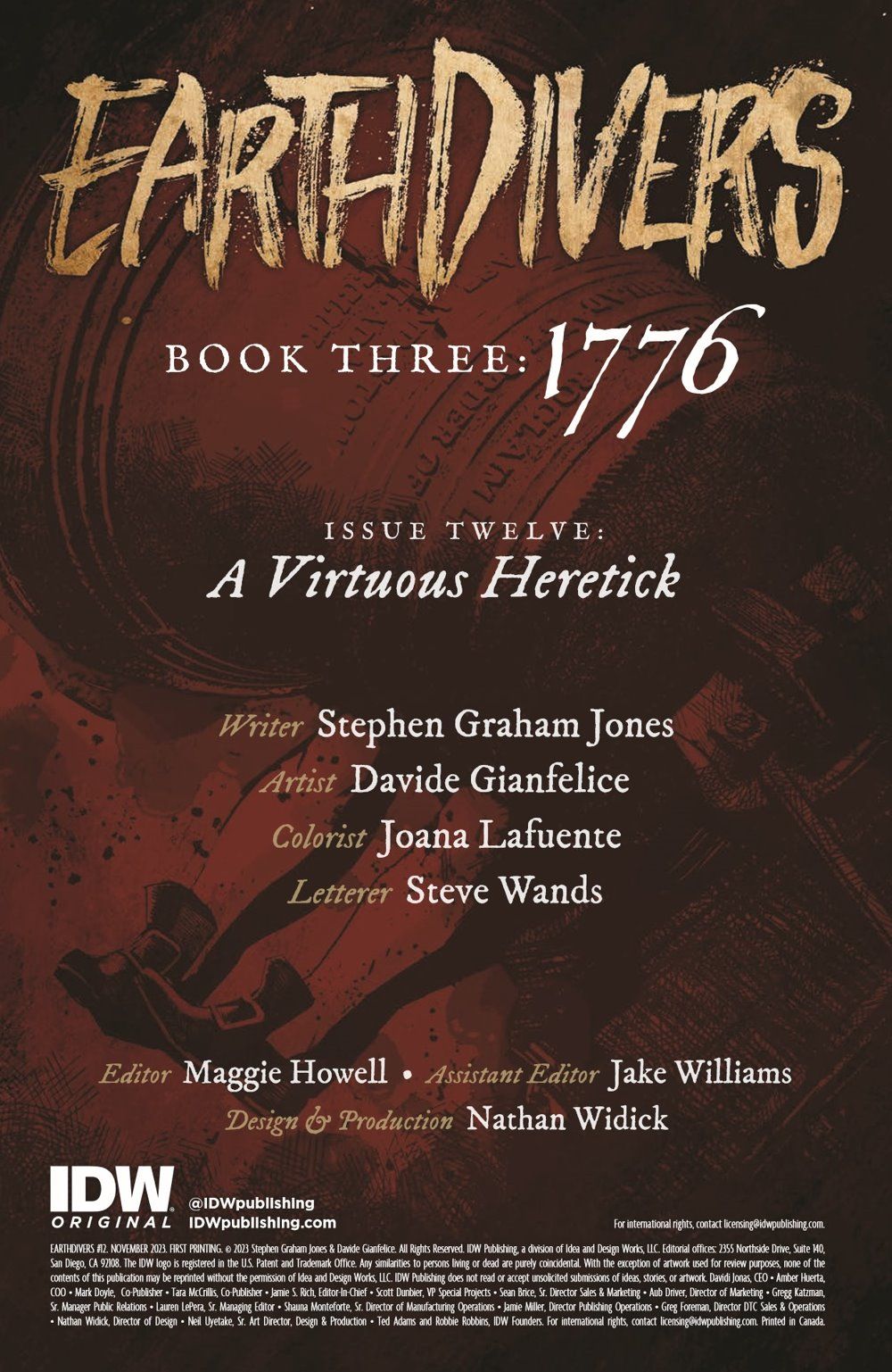 Emily's plan to infiltrate the Founding Fathers, influence monumental edits to the Declaration of Independence, and reverse the American-bred 21st-century apocalypse is off to a surprisingly smooth start after Benjamin Franklin himself takes her under his wing. But revolution is still brewing in the streets of Philadelphia, and when Emily catches wind of a royalist plot, she'll need to think on her feet to use it to her advantage before it hijacks her only opportunity to change the course of history and save the world. It's not too late to join or die! A new arc of New York Times best-selling author Stephen Graham Jones and artist Davide Gianfelice's time-twisting historical slasher continues!