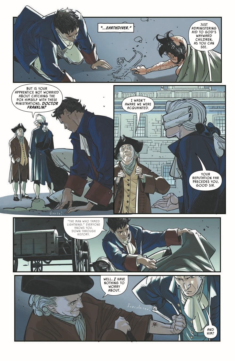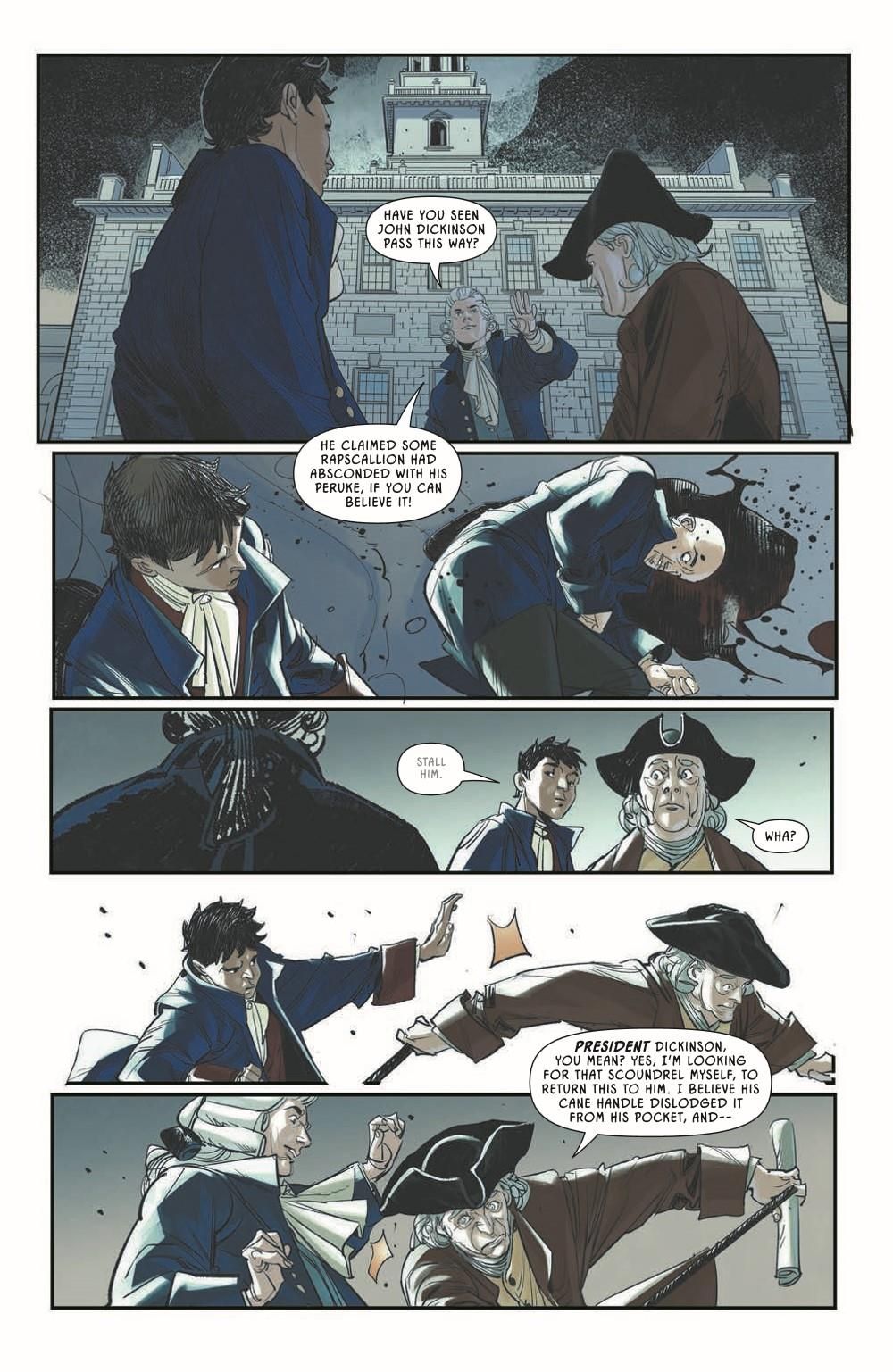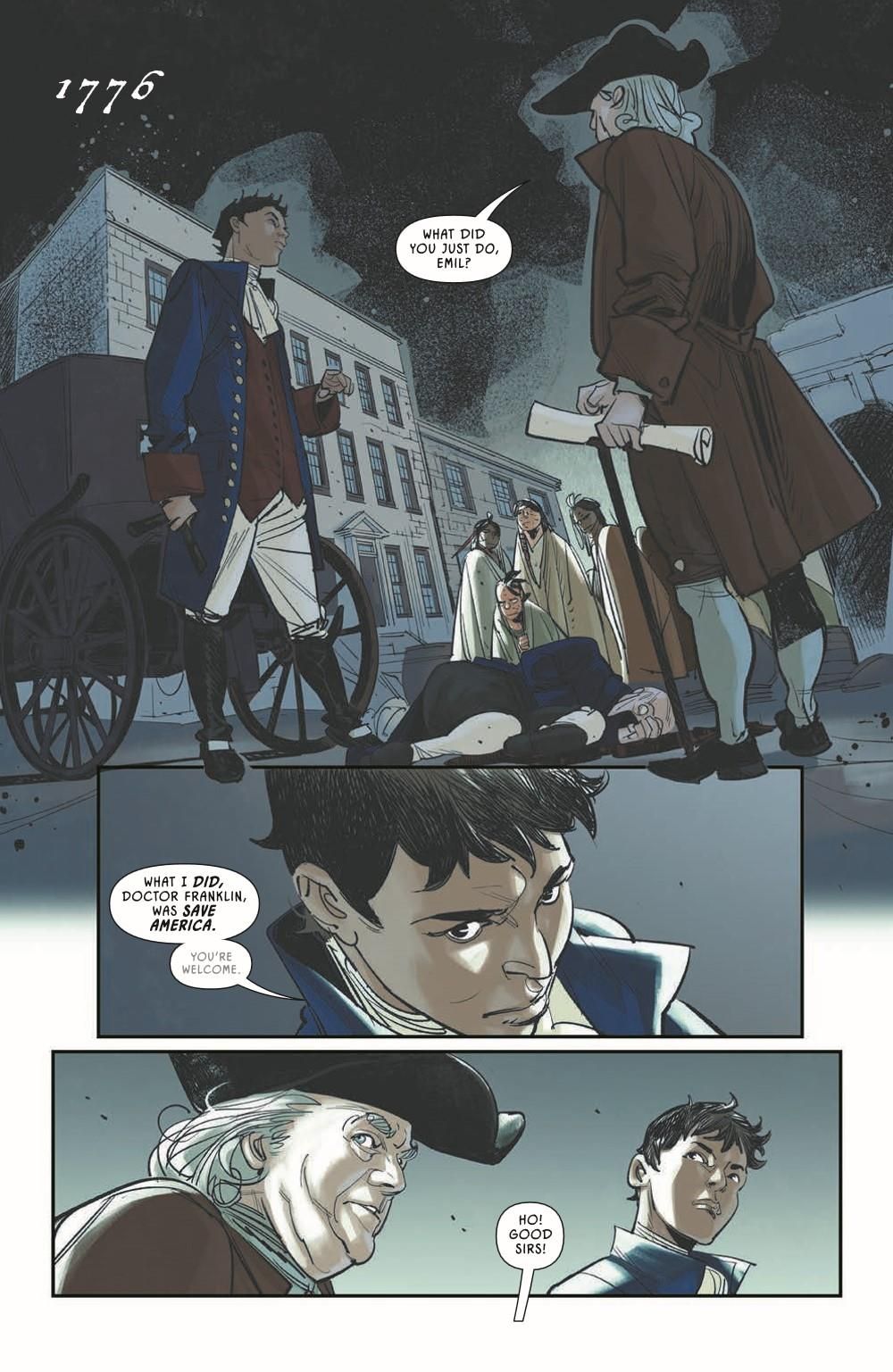 Yellow Kid is on the run from Martin, who is desperate to know what happened to his children. Yellow Kid knows the truth, but before he can get too far, he runs across an old friend in the strangest way possible. Back in 1776, Emily has revealed her true identity as a time traveler from the year 2112, her well-being in danger, her mission on the verge of absolutely collapsing in on itself and having effects on the timeline she couldn't have imagined.