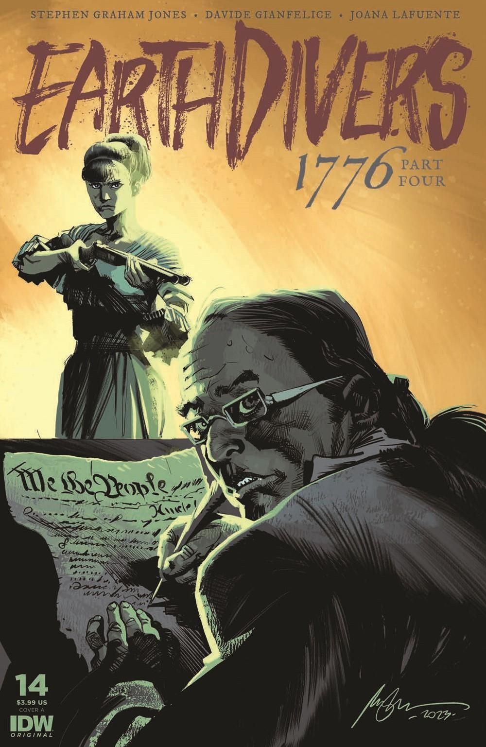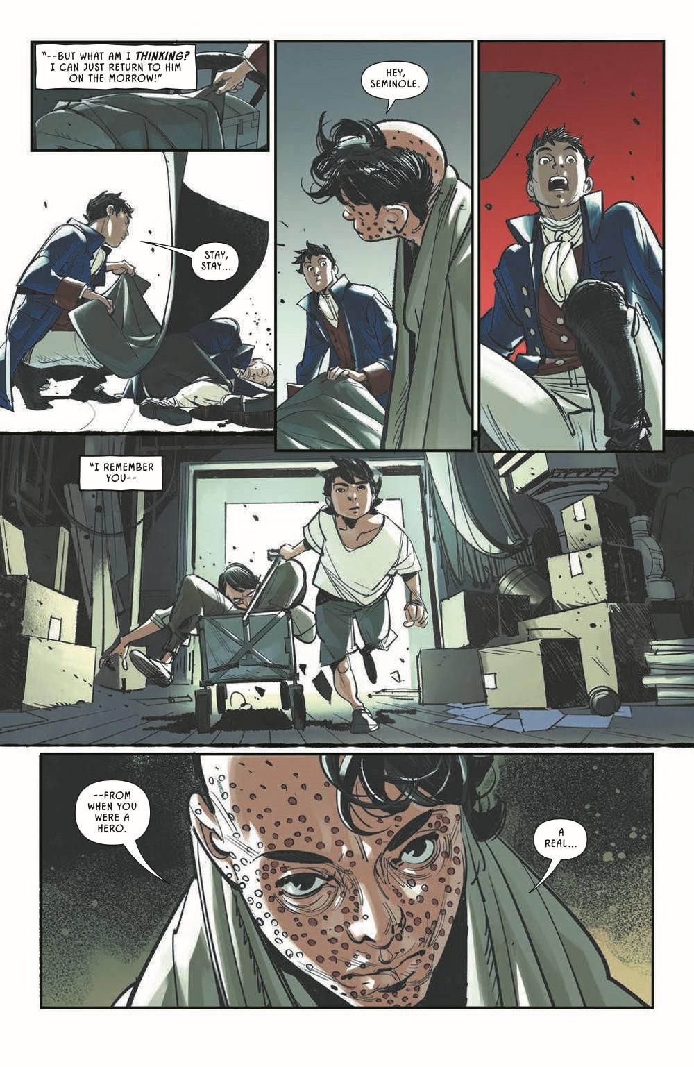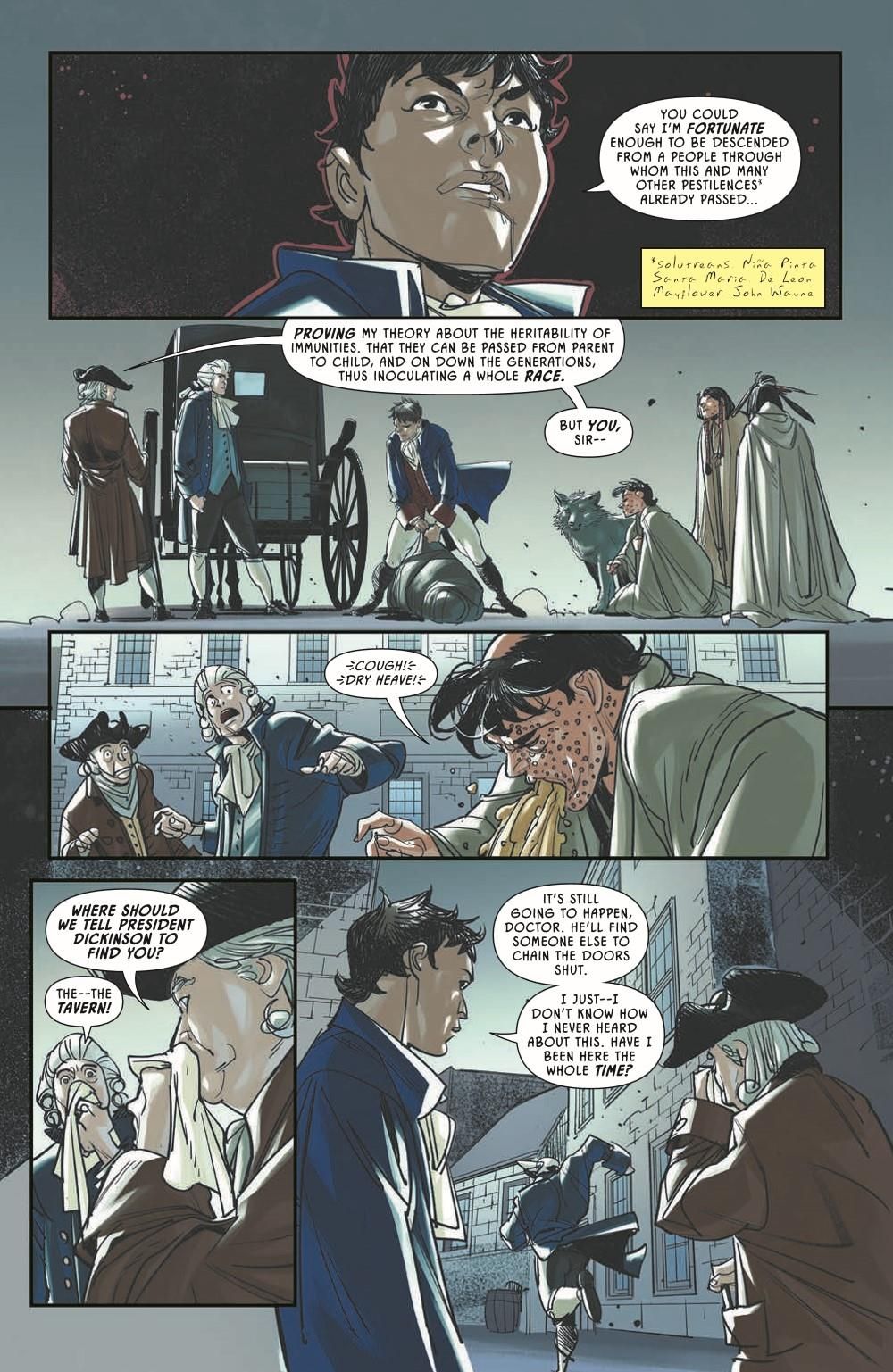 Yellow Kid is on the run from Martin, who is desperate to know what happened to his children. Yellow Kid knows the truth, but before he can get too far, he runs across an old friend in the strangest way possible. Back in 1776, Emily has revealed her true identity as a time traveler from the year 2112, her well-being in danger, her mission on the verge of absolutely collapsing in on itself and having effects on the timeline she couldn't have imagined.