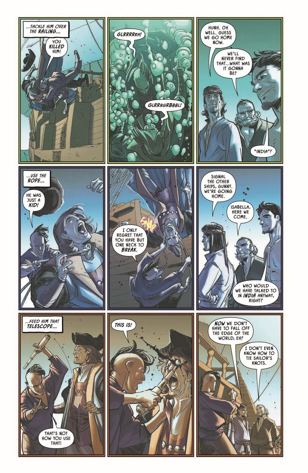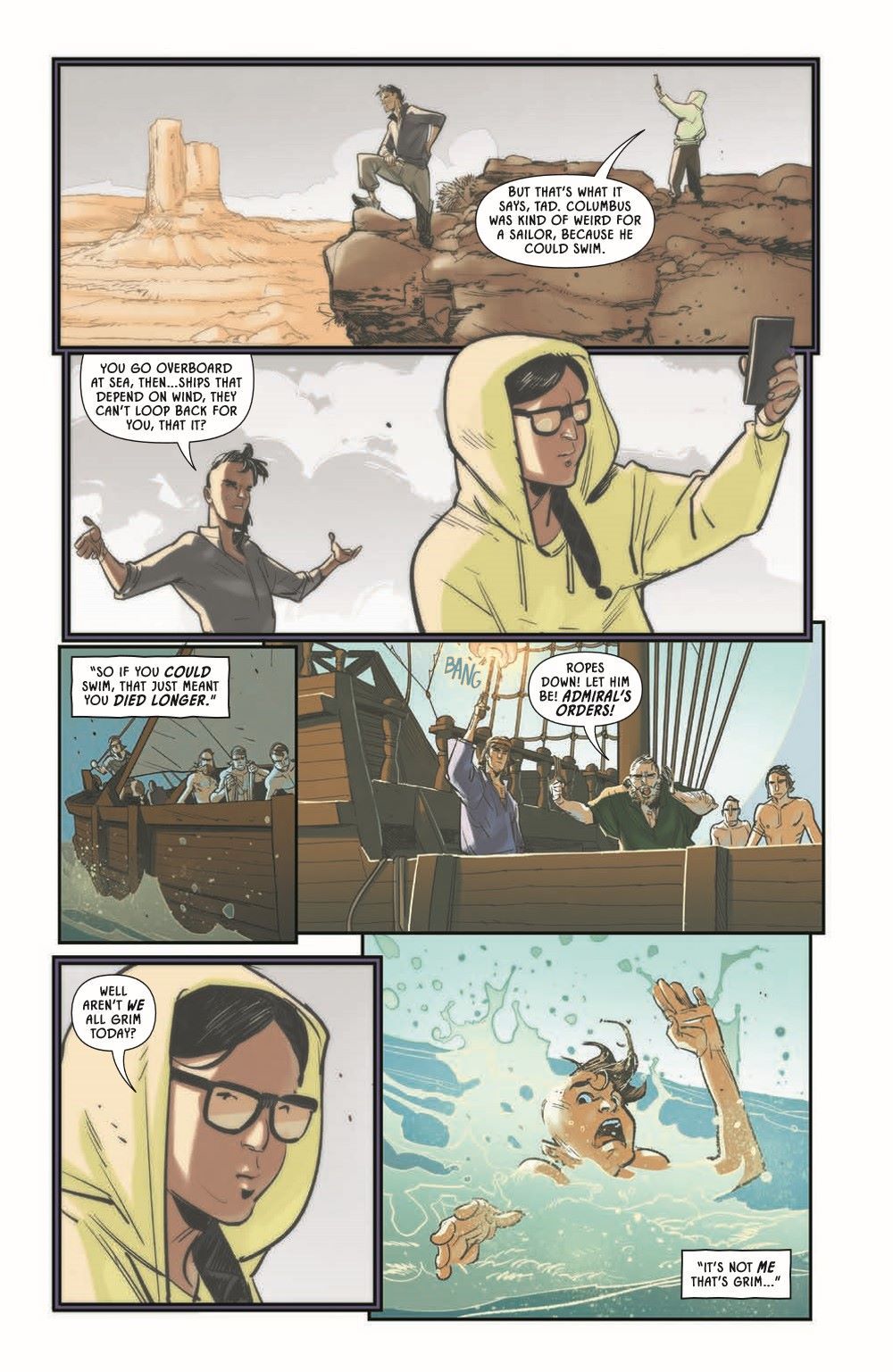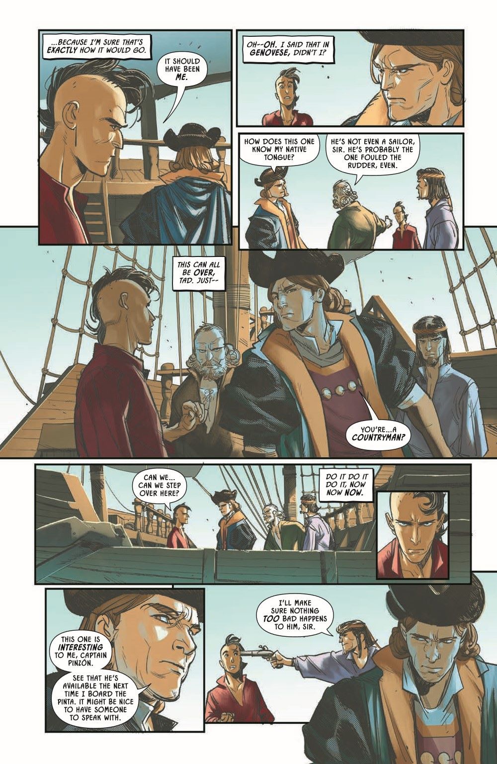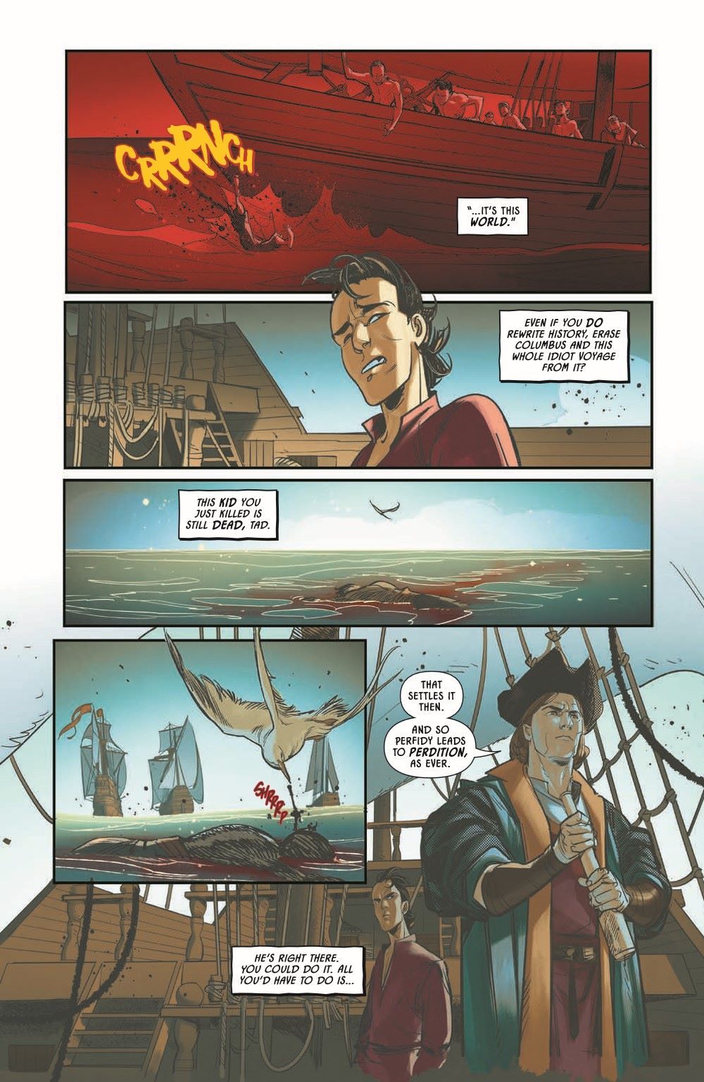 New York Times best seller Stephen Graham Jones and all-star artist Davide Gianfelice continue their heart-stopping historical slasher in Earthdivers #2! After dodging the apocalypse, four Indigenous outcasts are past the point of no return on their audacious one-way, time travel mission to save the world by killing Christopher Columbus. Immersed in 1492 as an undercover crewman, Tad—a brilliant Lakota linguist and wildly unqualified avenger—-must rally from the tragic consequences of his early actions on board and recommit to spilling the admiral's blood before landfall.In the year 2112, ringleader Yellow Kid and headstrong Sosh encounter a haunting sign of Tad's progress in the past, and back at the cave portal, Emily watches her back as her suspicion of Yellow Kid skyrockets.