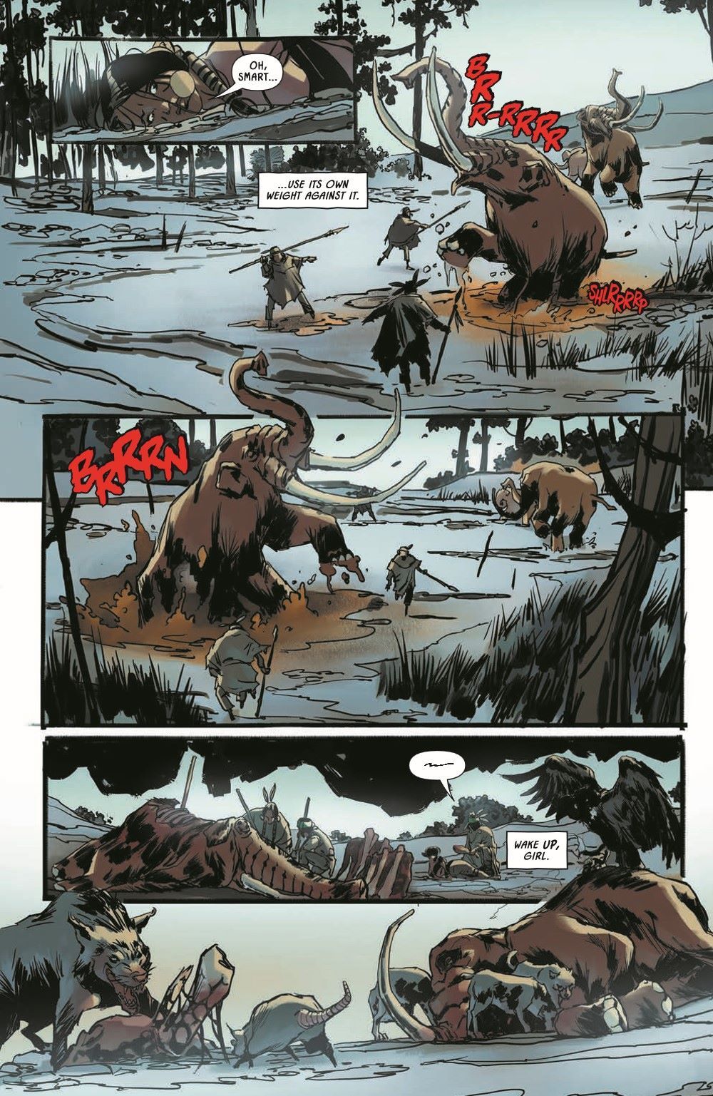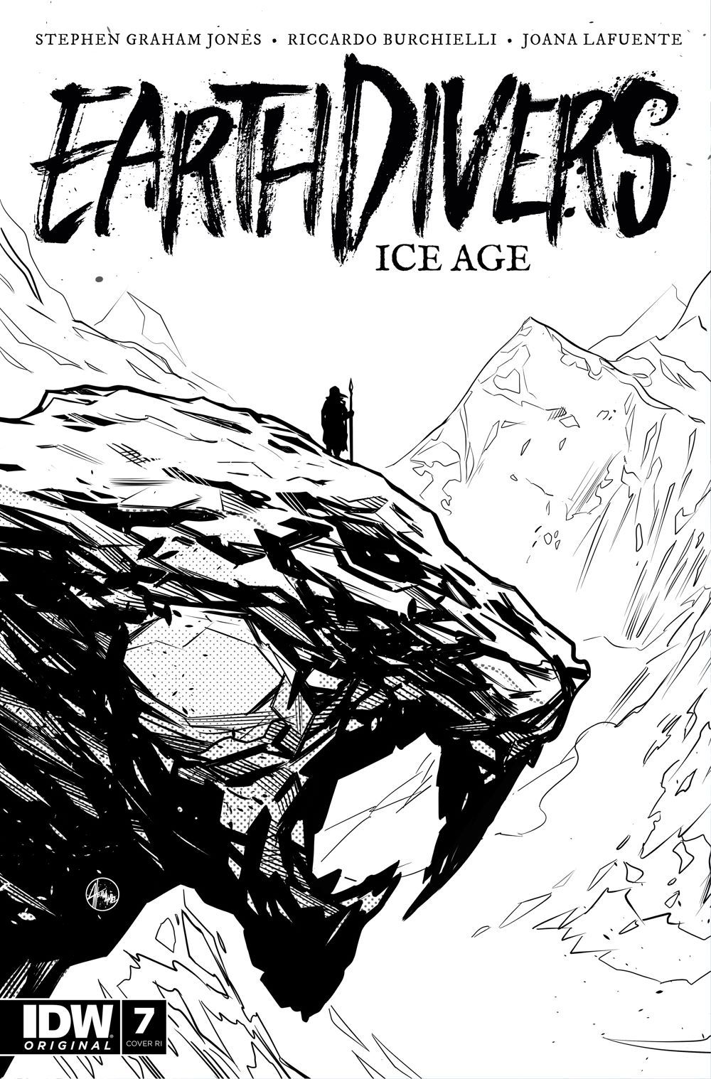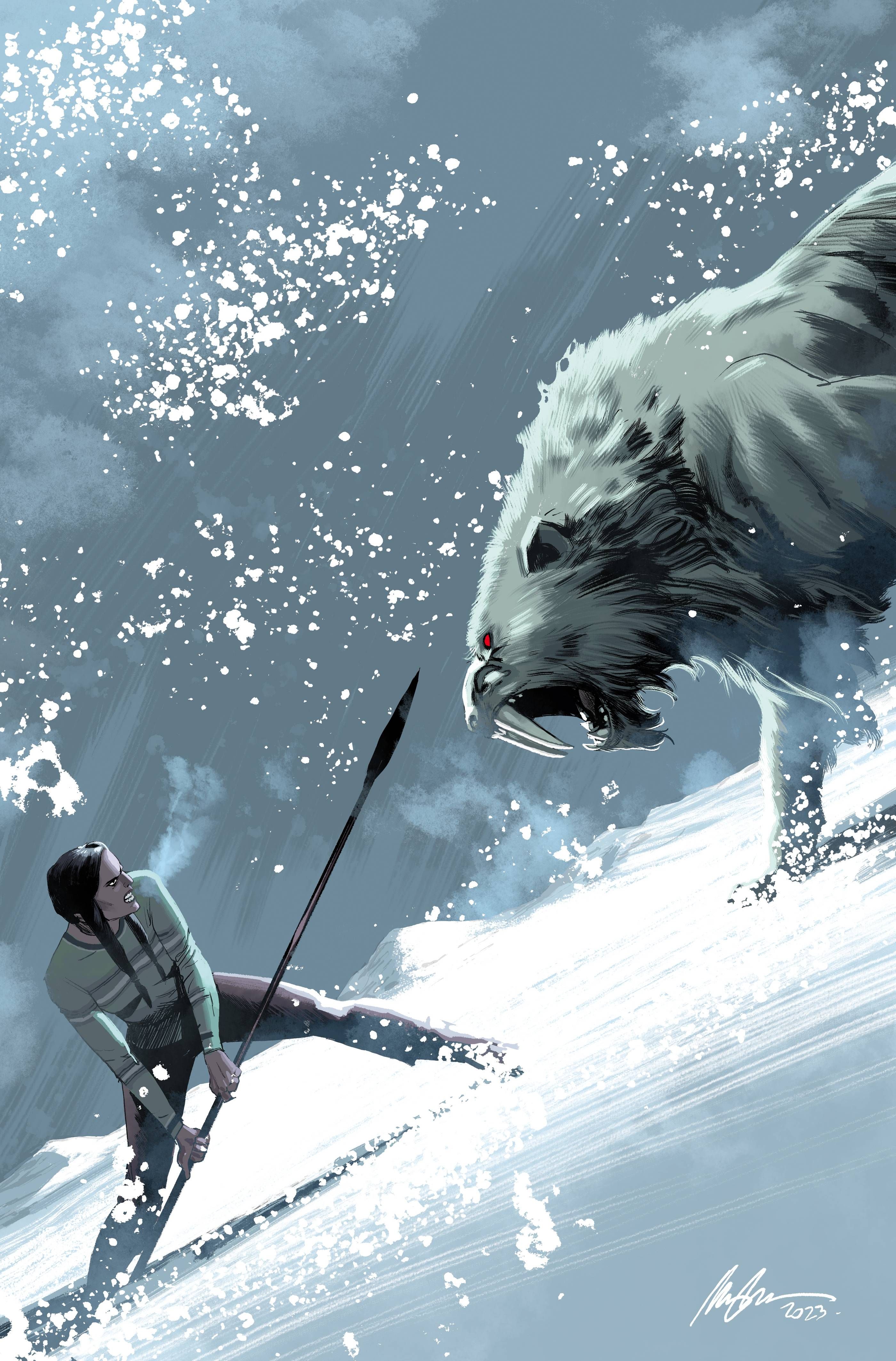 Guest artist Riccardo Burchielli (DMZ) joins Earthdivers, for a side mission to the Ice Age in the first of a four-issue mini-arc exploring America's pre-Columbian past! When Martin and Tawny's children disappeared, the couple barreled into the desert to track them down at any cost. Instead, they ran afoul of another group of rovers who claimed to be saving the world by traveling through a cave portal to the year 1492 to prevent the creation of America—an idea that defied belief until the grieving parents were lured into the cave and vanished in time and space. Now alone, Tawny must adapt to the wild marshlands of prehistoric Florida, circa 20,000 BC, and the breathtaking and bloodthirsty megafauna are the least of her problems when she's caught in a war between a community of native Paleo-Indians and an occupying Solutrean force. Tawny's odds of survival are in free fall, but she's a mother on a mission…and she's holding on to hope that the cave brought her here for a family reunion.