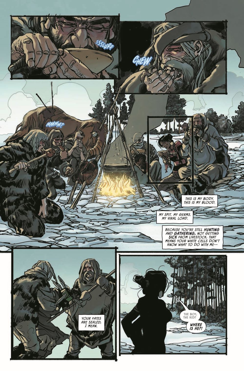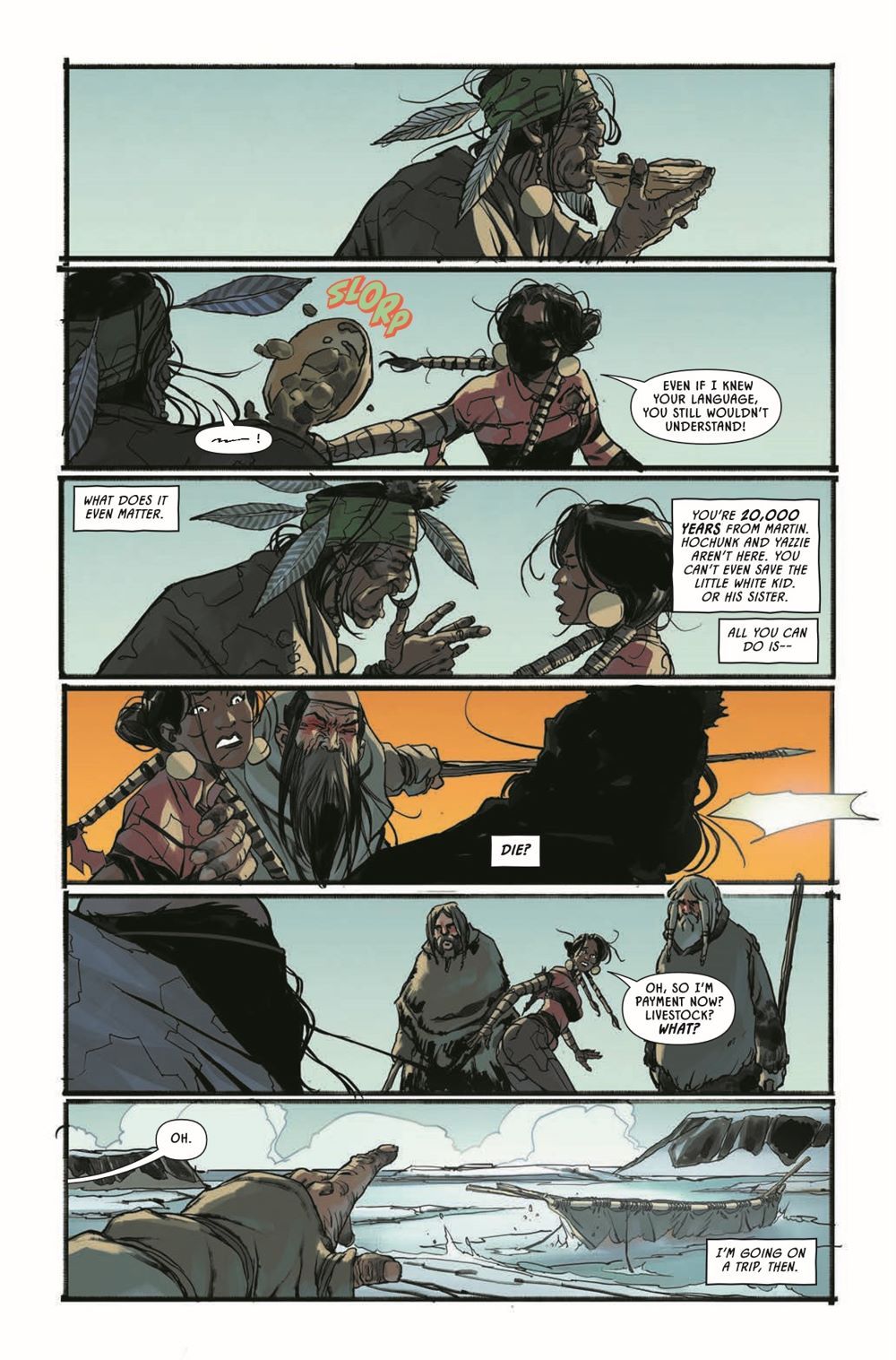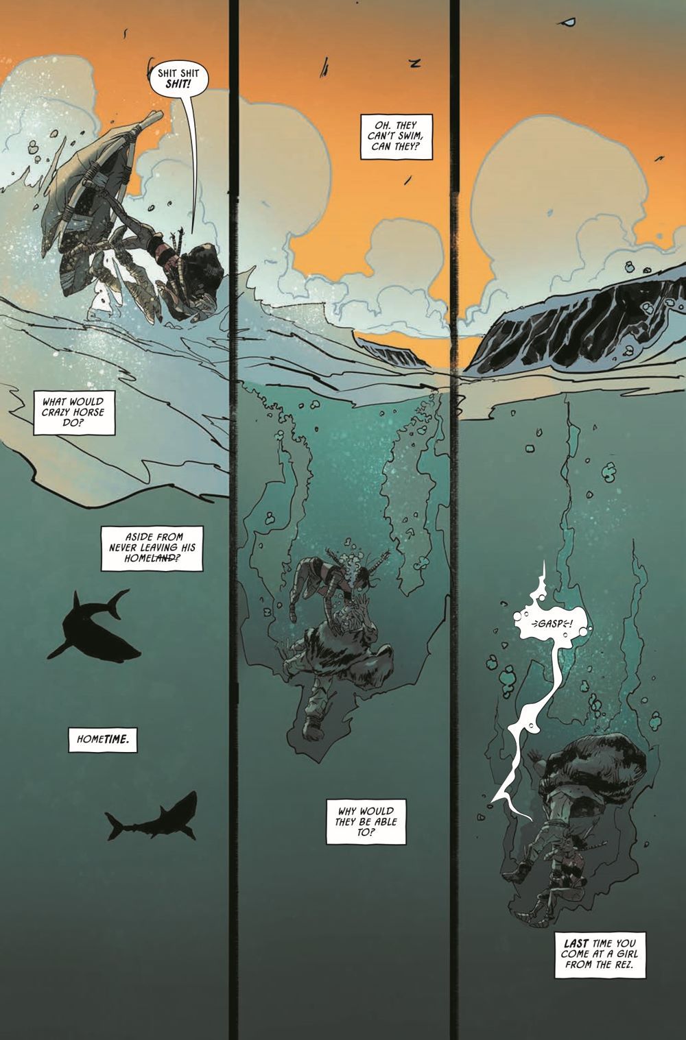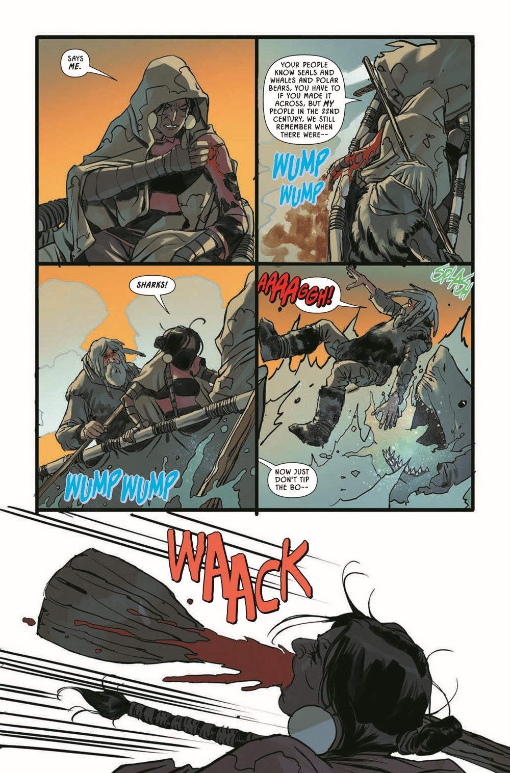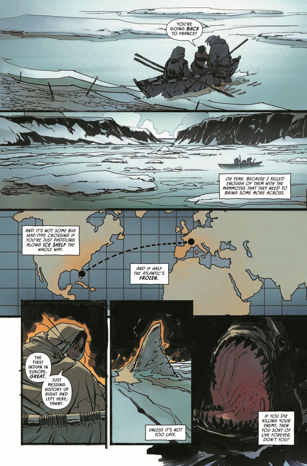 New York Times best-selling author and guest artist Riccardo Burchielli conclude their three-part Earthdivers Ice Age adventure! Tawny's attempt to outsmart her Solutrean captors with a silent weapon from the future could still pay off, but the chief's latest decree means she won't be around to find out. Bound and boarded onto a skin boat headed across ice floes and frigid seas, she has one last, unlikely shot at getting out of this alive: SHARKS. Giant, ravenous, prehistoric sharks.