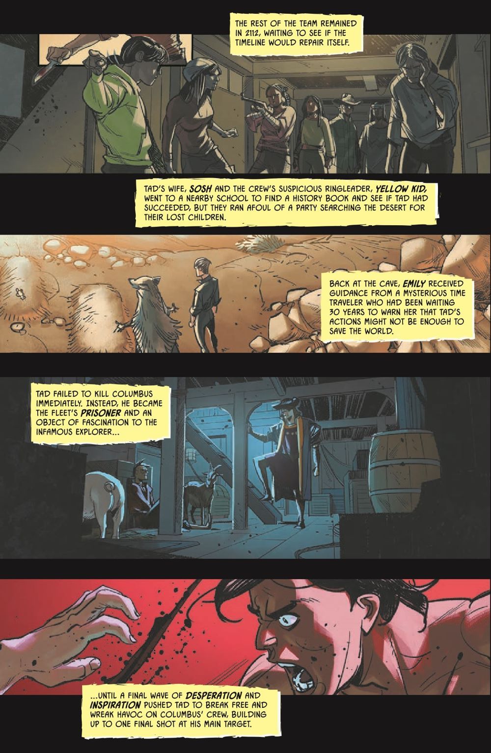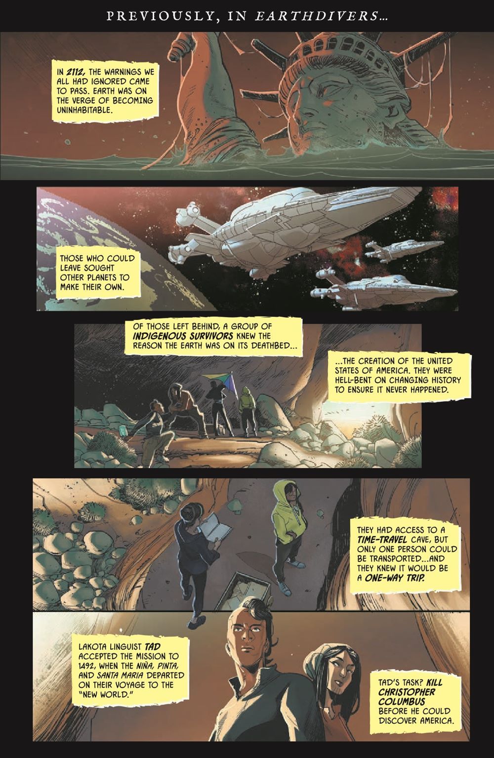 The year is 2112, and it's the apocalypse exactly as expected: rivers receding, oceans rising, civilization crumbling. Humanity has given up hope, except for a group of Indigenous outcasts who have discovered a time travel portal in a cave in the desert and figured out where everything took a turn for the worst: America.
