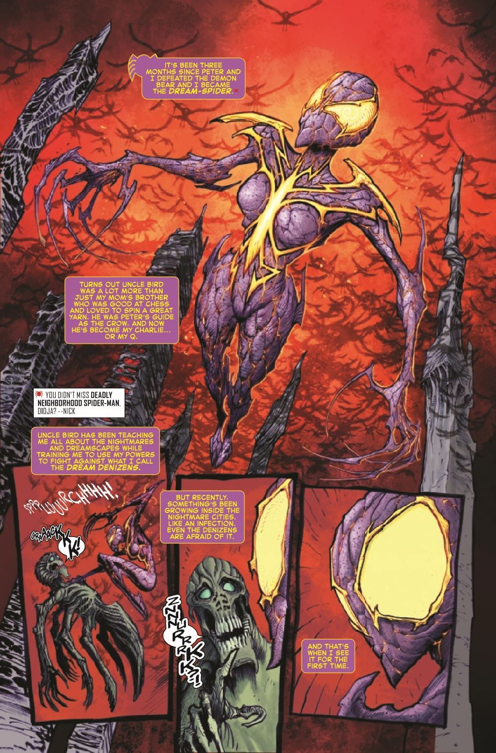 DREAM-SPIDER RETURNS! The new spider-character from the hit DEADLY NEIGHBORHOOD SPIDER-MAN miniseries returns in her first solo adventure! ALSO: What if that radioactive spider we all know and love bit…J. JONAH JAMESON?!