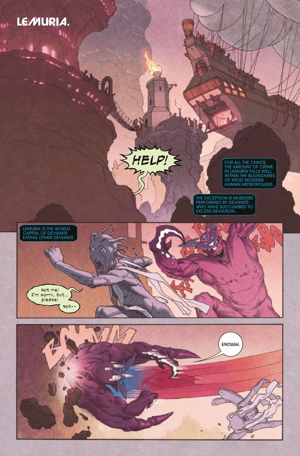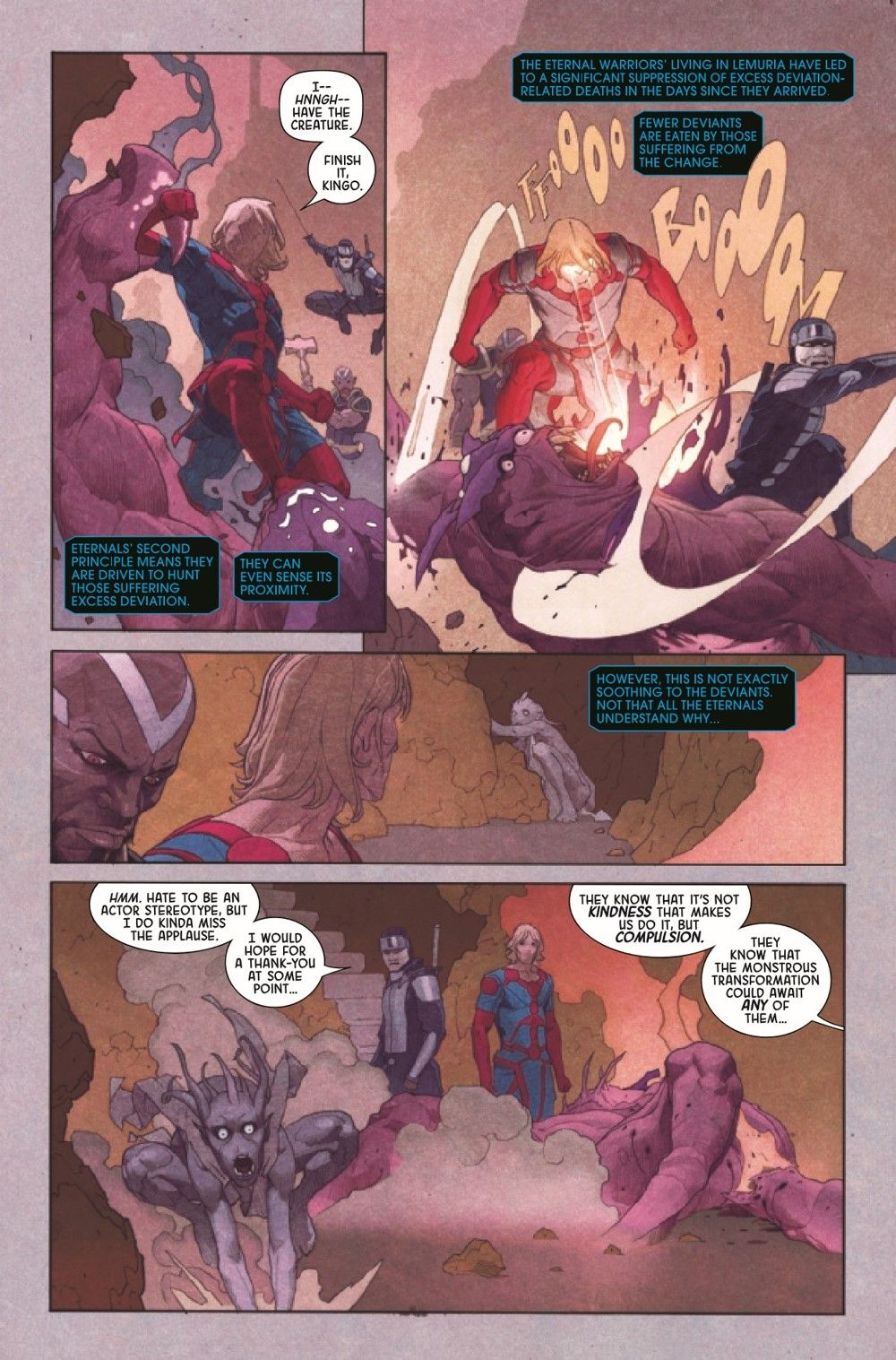 Eternals and Deviants have been at war for a million years. Our Eternals have had enough. They want to live in peace, alongside the Deviants. The Deviants have other ideas. Meanwhile, Thanos is Prime Eternal and, to everyone's surprise, puts into action a series of sensible policies for the good of all. There is a lie in this solicit. You may be able to spot it.