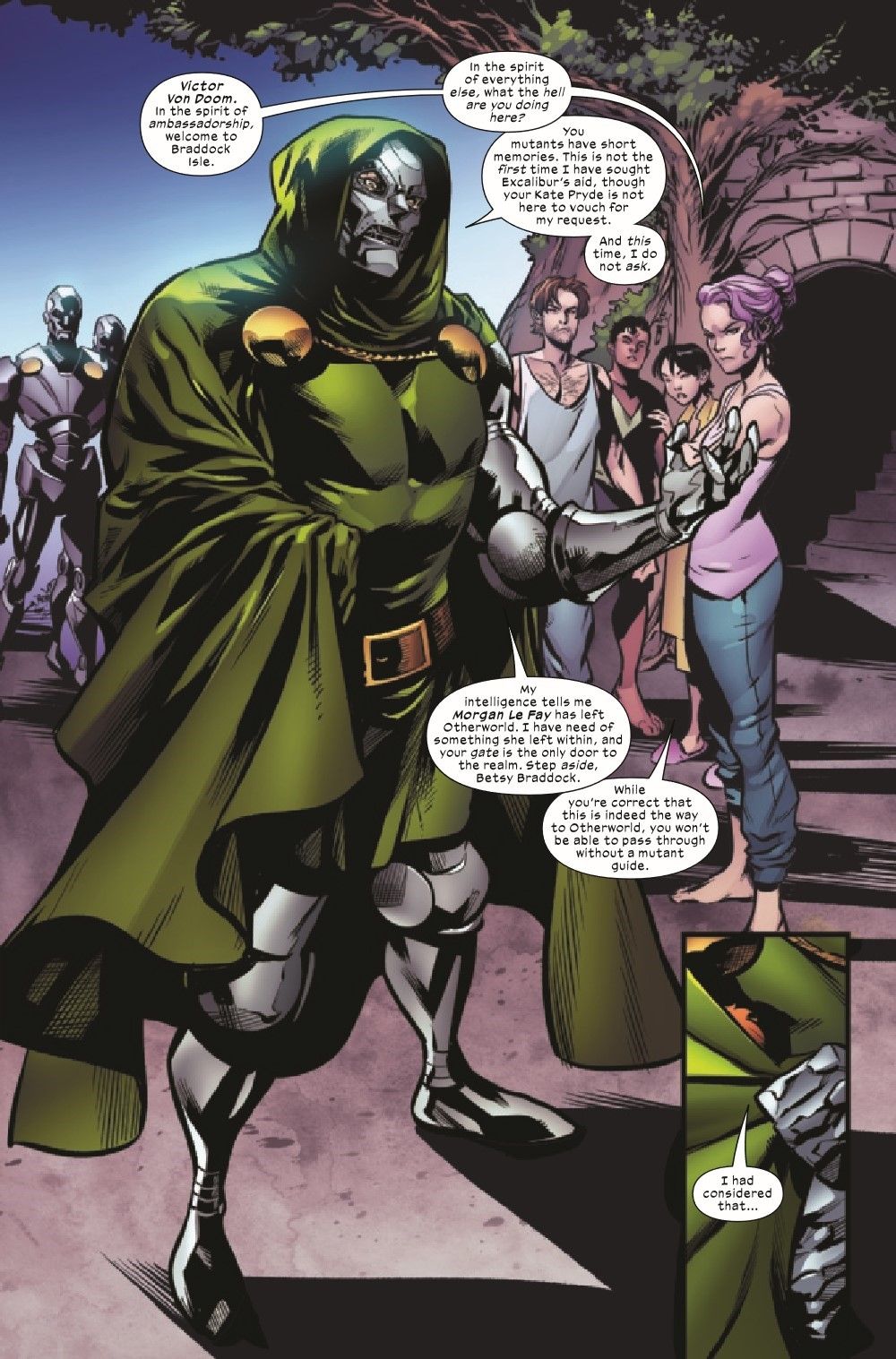 THE CALL OF DOOM! As guardians of the gate, Excalibur has sworn to safely escort those who quest to the Otherworld within, but their duties are tested to their limits when DOOM returns to Avalon.