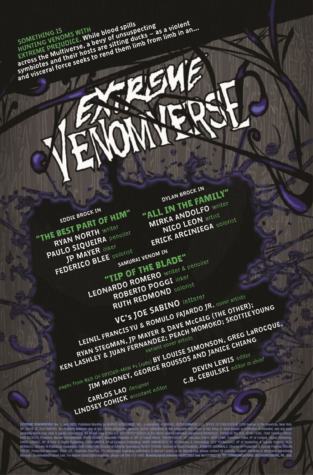 RETURN TO THE VENOMVERSE! Face front, Venomaniacs - to celebrate the 35th Anniversary of the creation of VENOM, the SUMMER OF SYMBIOTES IS UNDERWAY! And it all starts with EXTREME VENOMVERSE, a landmark series that's going to take Mighty Marveldom to corners of the hive never seen before in three titanic tales! FIRST! Comics superstars RYAN NORTH AND PAULO SIQUEIRA put a fresh and exciting spin on a story you may be familiar with…starring Eddie Brock as…SPIDER-MAN?! THEN! Your new favorite comics writer, MIRKA ANDOLFO, shows you a side of the whole Brock family you NEVER thought you'd see! AND FINALLY! One of the best writer/artists in comics today, LEONARDO ROMERO, reimagines Venom as a SAMURAI! But whether all of your new favorite symbiotes will survive this summertime saga remains to be seen…