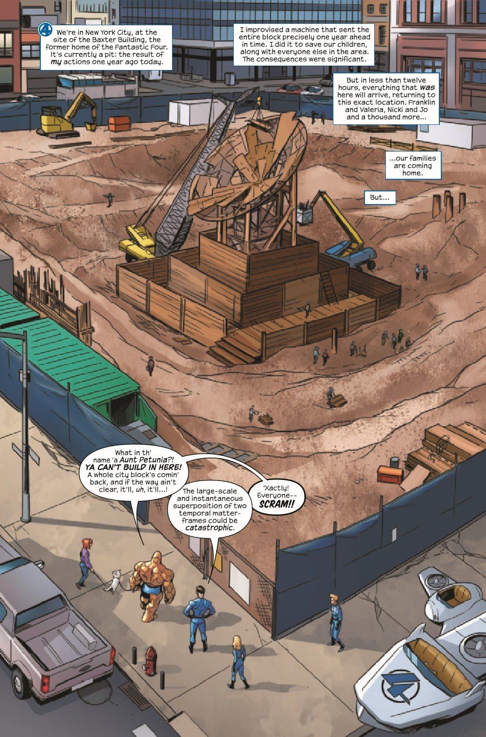 A year ago, Reed Richards sent a whole city block the Baxter Building stands on - along with his own children and the children of his best friends Ben and Alicia - a year ahead in time. It was a desperate measure, but it saved them. And now, it's time for them all to come back. But when the Fantastic Four arrive in NYC, they find something is being built in the pit where the block once stood - and worse, nobody seems to know exactly what it is or why they're building it. With the clock ticking, they investigate this mystery - and discover a mysterious new threat that may have been pulling the strings this entire time…