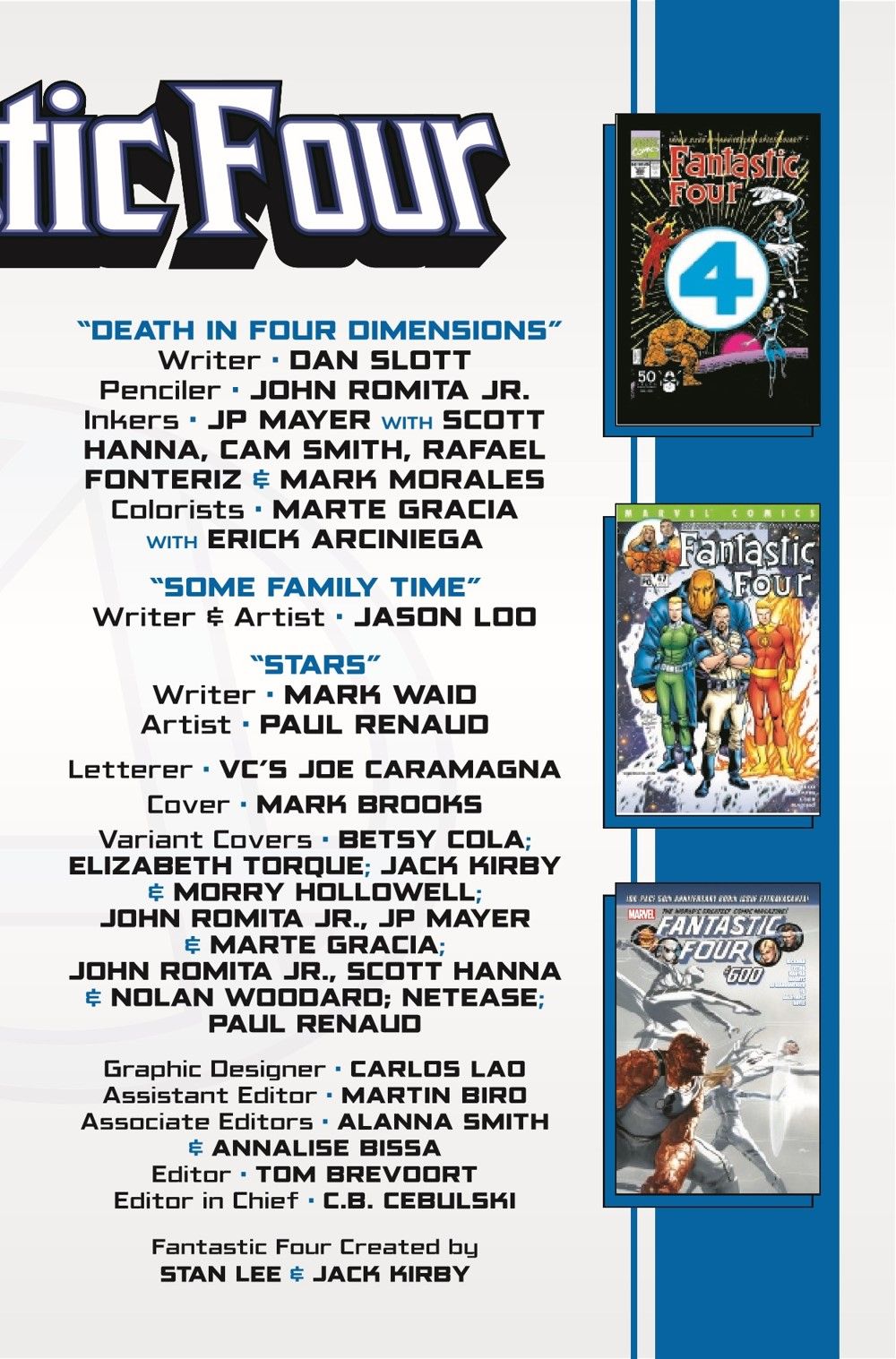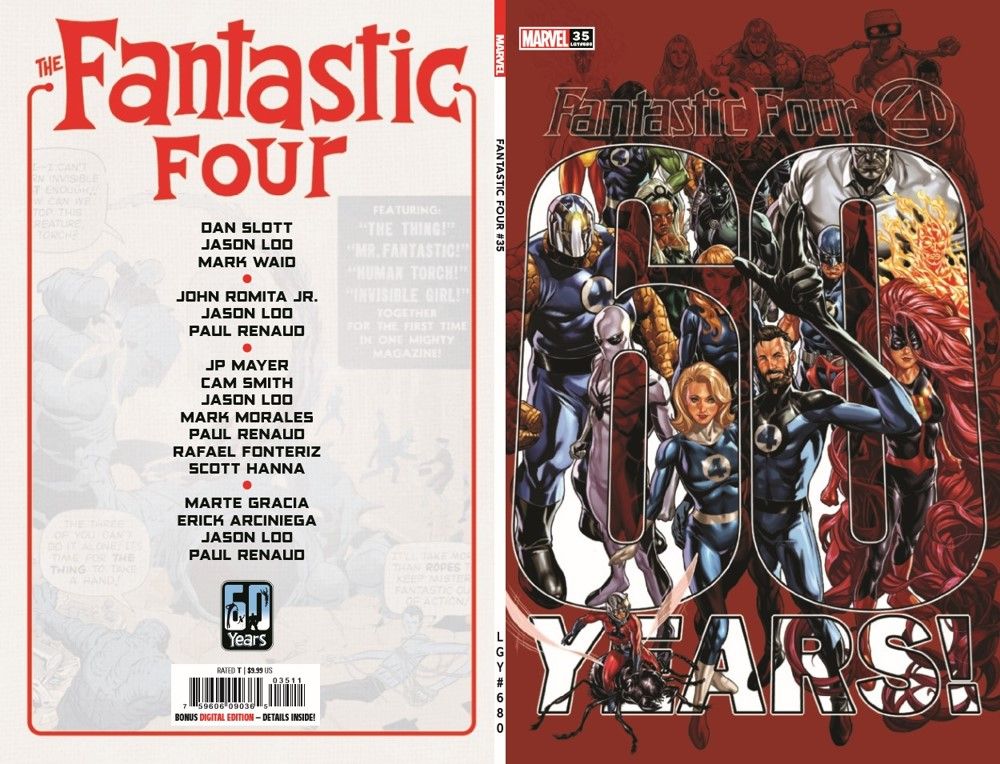 A TITANIC 60TH ANNIVERSARY ISSUE! The entire Kang bloodline is out to destroy every era of the Fantastic Four! How can Reed, Sue, Ben and Johnny hope to survive simultaneous attacks across their lifetimes by Rama Tut, the Scarlet Centurion, Kang the Conqueror and Kang's final descendant, the sinister Scion?! Join the FF and some special surprise guest stars as John Romita Jr. returns to Marvel and joins forces with writer Dan Slott for this celebratory adventure! Marvel's First Family will literally never be the same again! Plus: Mark Waid and Paul Renaud deliver dramatic new insights into the origin of the fabulous foursome in an all-new anniversary tale!