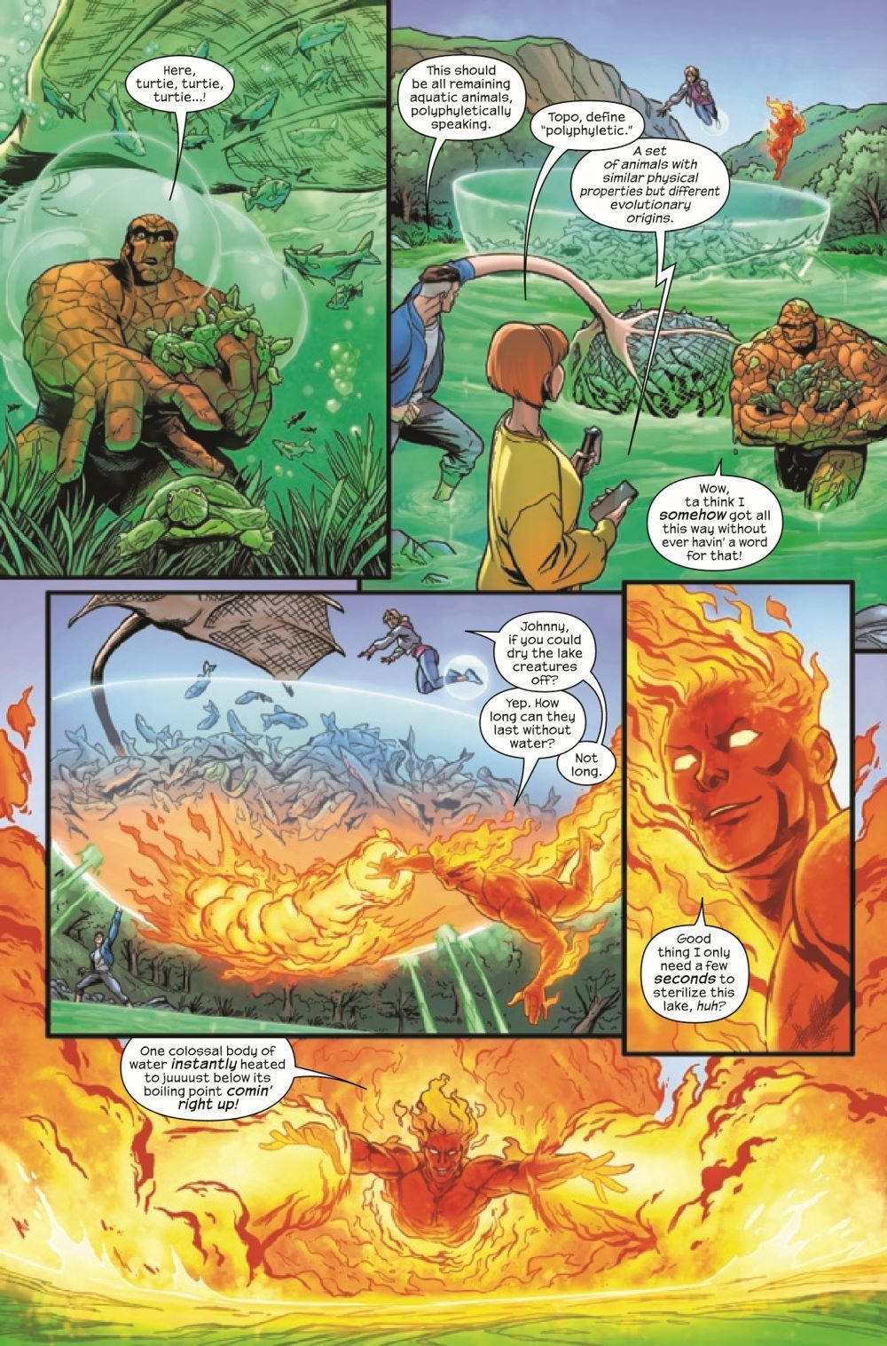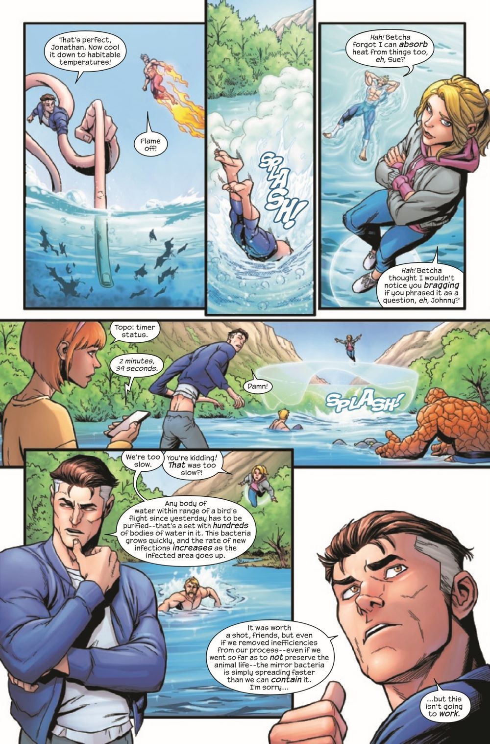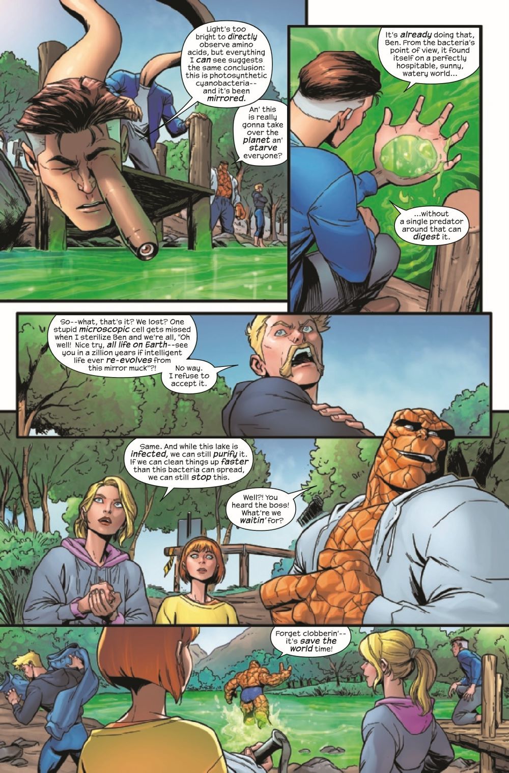 The Fantastic Four have been restored to their correct dimension and orientation, but they don't know that some microscopic invaders, immune to all predators on Earth, have come along for the ride! • What happens when the Fantastic Four accidentally threaten all life on the planet? Well, they try to fix it. But what happens when they can't? • I'll tell you what happens: Sue and Johnny team up to pull off their most audacious stunt yet and maybe, just maybe, save us all. Meanwhile, Ben, Alicia and Reed have to convince a skeptical world that what they're doing is worth it... • Plus: Doctor Octopus is in this one! Only for a little bit, because, come on — he's going up against the FANTASTIC FOUR. It's gonna be a short fight. • OR IS IT???