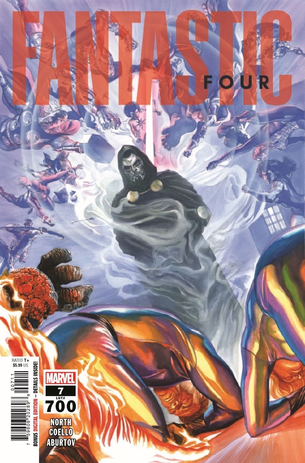 COLOSSAL ISSUE #700! FANTASTIC FOUR #7 is also FANTASTIC FOUR #700, which means we're ABSOLUTELY going huge. It's an over-sized spectacular as the Fantastic Four reach their new home - not knowing that a mysterious threat has made it there first! As their knowledge of LANGUAGE ITSELF begins to melt from their minds, the Four are in disarray as their existence hangs in the balance... ...and the greatest villain of all time finally seals their DOOM.