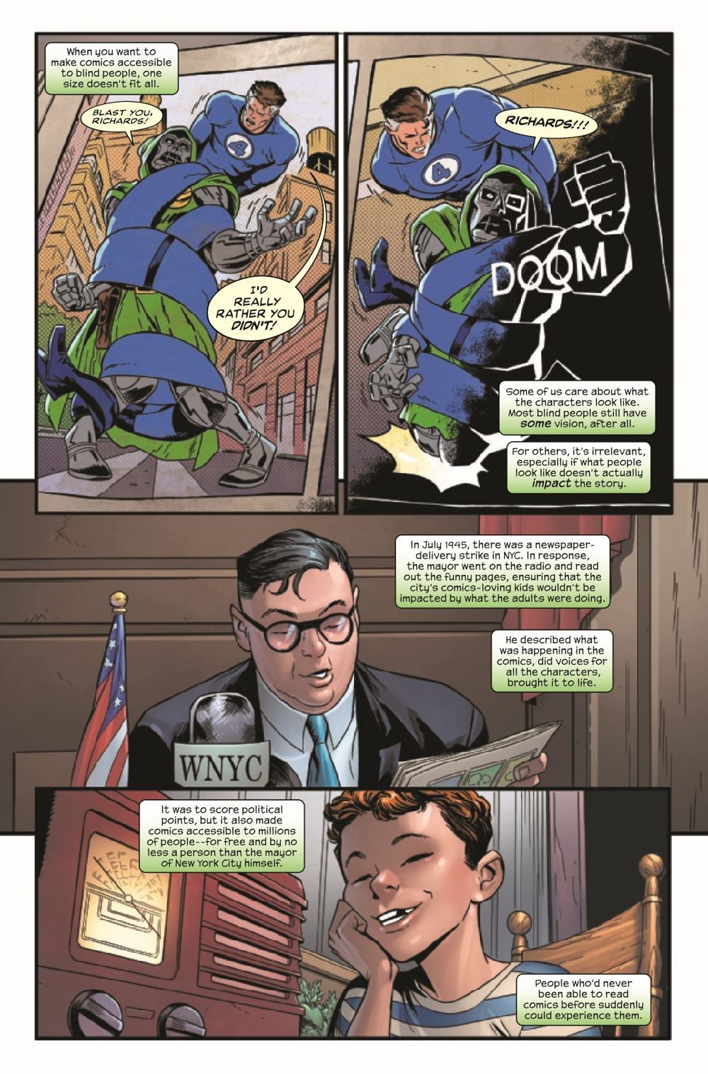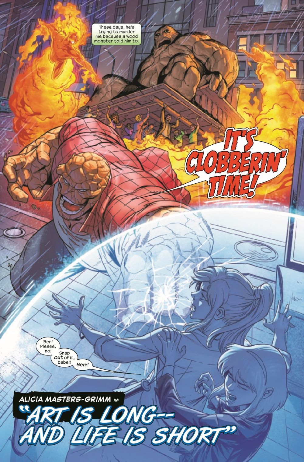 Alicia, Sue and Johnny face off against Ben and Reed - as they battle for the survival of their minds themselves against an alien that can wipe their memories clean! But can they survive this brutal onslaught from their friends and lovers, the very people who know them - and their powers - better than anyone else in the universe? We'll all find out together in this Alicia-narrated issue! Plus: A meditation on the nature of art itself! And cool fights too!
