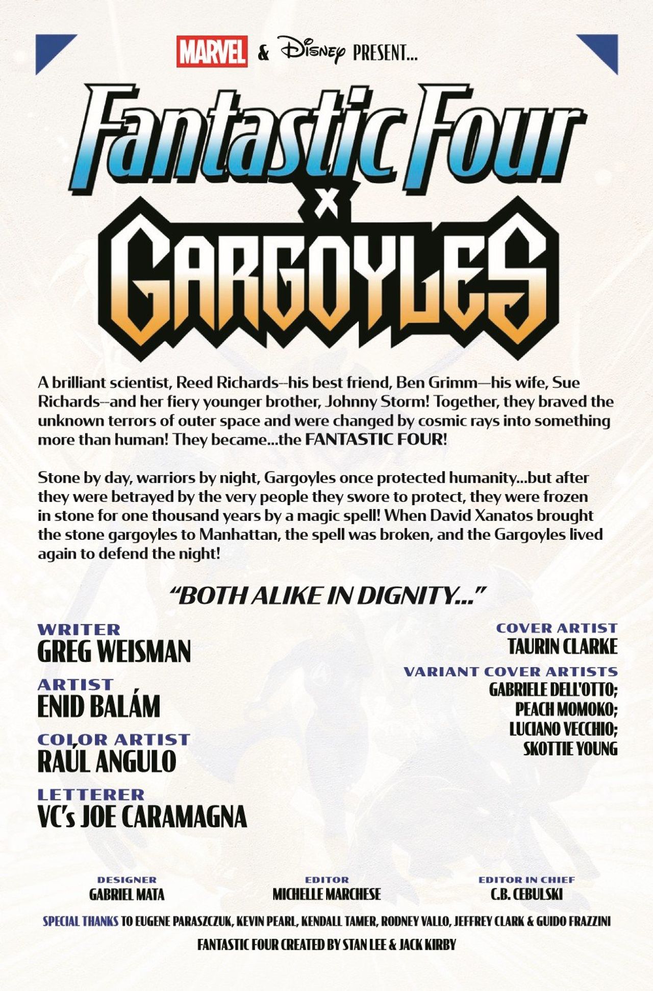 MARVEL'S FIRST FAMILY UNITES WITH THE MANHATTAN CLAN IN THIS EXCITING CROSSOVER! GARGOYLES creator and acclaimed Marvel writer Greg Weisman brings the Gargoyles to the Baxter Building alongside star artist Enid Balám! Danger strikes when the super villain Diablo learns stone gargoyles may hold the secret to eternal life…but the Gargoyles aren't about to let him leech the blood of his own! Fortunately, they've got the help of expert Diablo-bashers - the Fantastic Four! Plus: Tony Stark and David Xanatos compare facial hair, Marvel's own Gargoyle, Isaac Christians, bonds with his new kin, and more! You won't want to miss this collision of beloved universes!