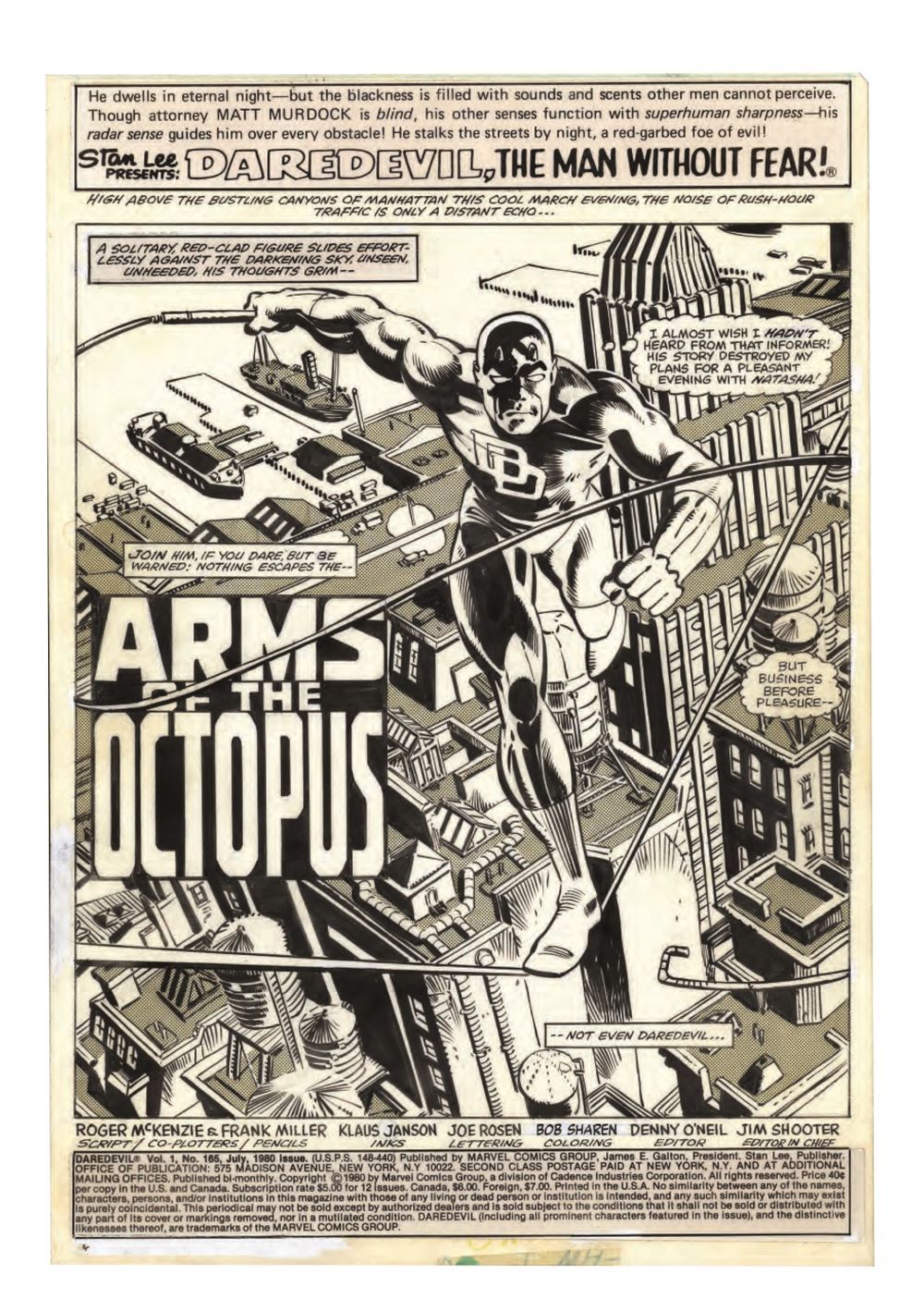 Frank Miller helped redefine sequential storytelling in the early 1980s. His style, influenced by Will Eisner's The Spirit, was new and exciting. One of his earliest issues featured the introduction of Elektra and was the first issue Miller wrote.