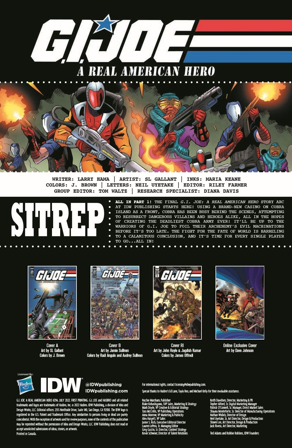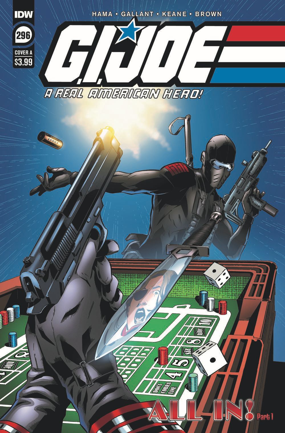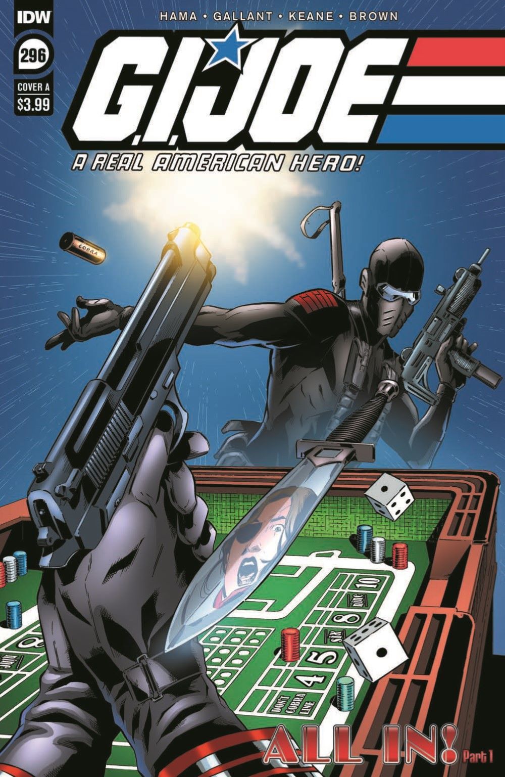 The final G.I. Joe: A Real American Hero story arc at IDW Publishing starts here! Using a brand-new casino on Cobra Island as a front, Cobra has been busy behind the scenes resurrecting dangerous villains and heroes alike, all in the hope of creating the deadliest Cobra army ever! It'll be up to the warriors of G.I. Joe to foil their archenemy's evil machinations before it's too late. The game for the fate of world is barreling to a calamitous conclusion, and it's time for every single player to go...ALL-IN! New and classic heroes and villains will fill the pages (including some shocking appearances!) as the fan-favorite creative team of Living Legend Larry Hama and SL Gallant begin the final treacherous march to issue #300!