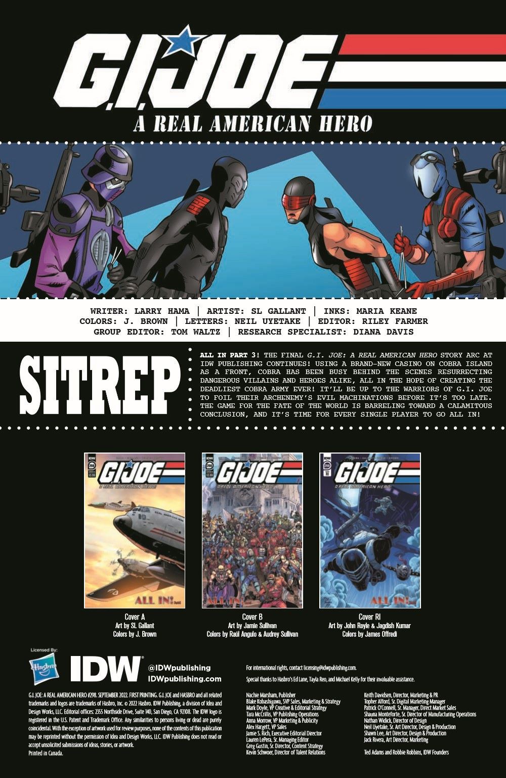 All-In, Part 3! The final G.I. Joe: A Real American Hero story arc at IDW Publishing continues! Using a brand-new casino on Cobra Island as a front, Cobra has been busy behind the scenes resurrecting dangerous villains and heroes alike, all in the hope of creating the deadliest Cobra army ever! It'll be up to the warriors of G.I. Joe to foil their archenemy's evil machinations before it's too late. The game for the fate of the world is barreling to a calamitous conclusion, and it's time for every single player to go…ALL-IN! New and classic heroes and villains will fill the pages (including some shocking appearances!) as the fan-favorite creative team of Living Legend Larry Hama and SL Gallant continue the final treacherous march to issue #300!