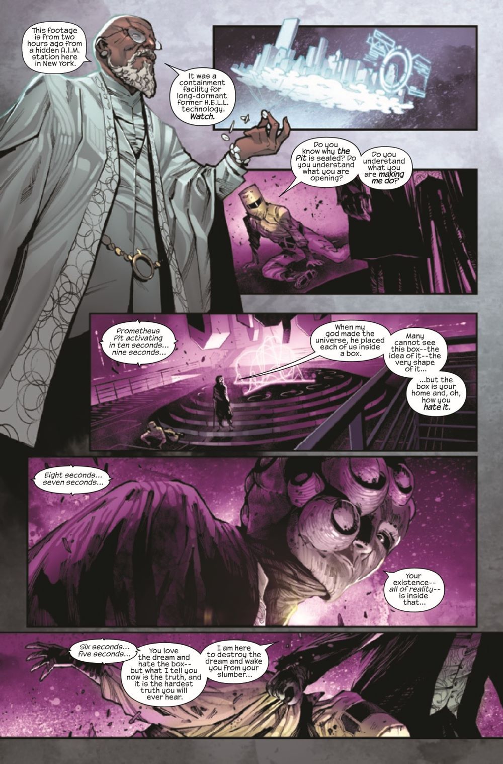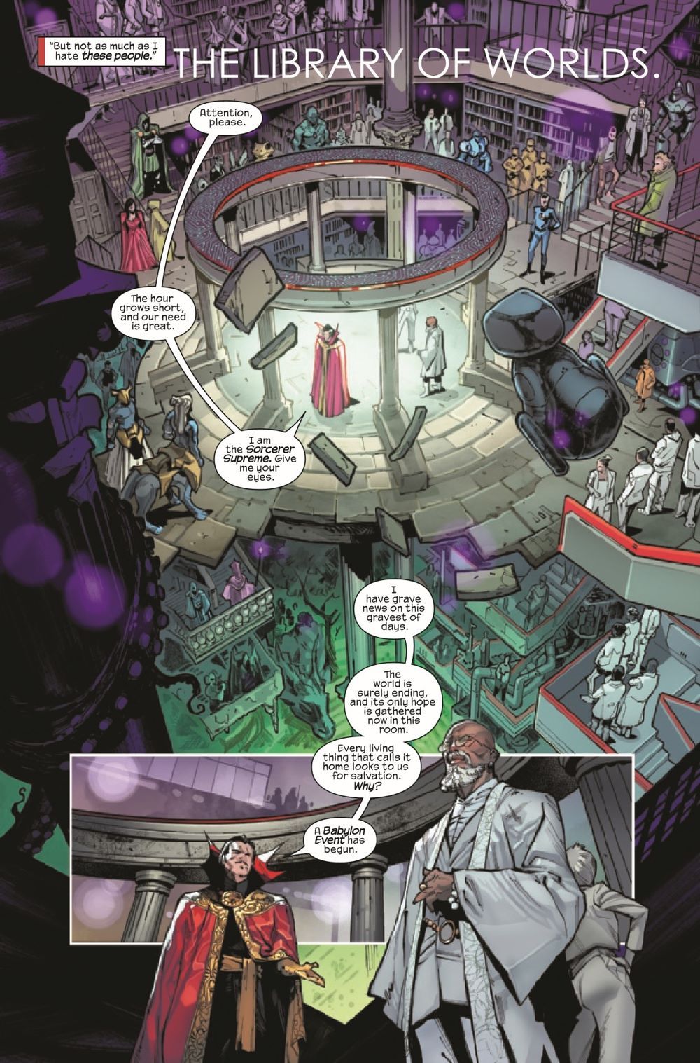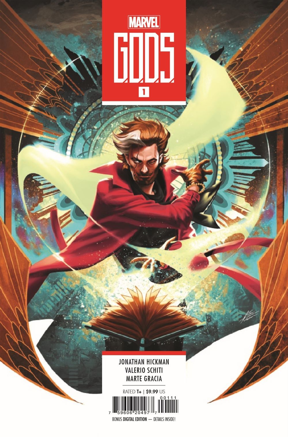 JONATHAN HICKMAN RE-INVENTS THE COSMOLOGY OF THE MARVEL UNIVERSE! WHAT HAPPENS WHEN THE-POWERS-THAT-BE MEET THE-NATURAL-ORDER-OF-THINGS? The infinite détente between THE-NATURAL-ORDER-OF-THINGS and THE-POWERS-THAT-BE nears an end. Old acquaintances are reunited during a Babylon Event. The Lion of Wolves throws the worst parties. Don't look under the table. There's a John Wilkes Booth penny on the ground. This ENORMOUS EXTRA-SIZED first issue features DOCTOR STRANGE, who, while not boring at all, is easily the most boring person in the book.