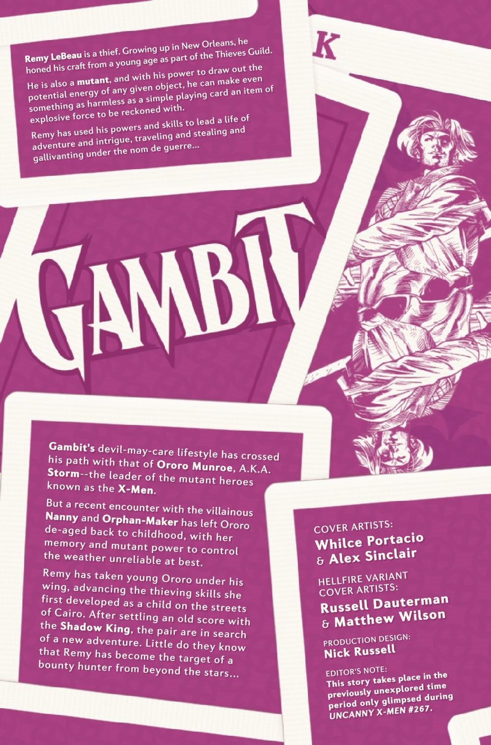 GAMBIT AND 'RO - ON THE LAM AND OFF THE RAILS! 'RO is the mutant X-Man Storm, reverted to childhood and trying to retain use of her powers while fighting to find her memories. GAMBIT is the free spirit Remy LeBeau, not yet an X-Man and making his way up and down the Mississippi. What do they have in common? They're mutants, they're thieves, and they're having a blast! But their side mission to escape the SHADOW KING goes off the rails when sudden disaster strikes, and the duo find themselves in the midst of local trouble with 'Ro's life - and very essence - in the balance. Can Gambit find the heroic path before it's too late? Featuring old favorites as well as new friends and enemies!