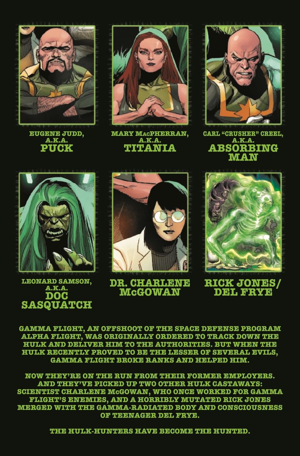 SPINNING OUT OF IMMORTAL HULK, BRUCE BANNER'S GAMMA-POWERED ALLIES GO ON THE RUN! Gamma Flight had one job: Find and stop the Hulk. But when push came to smash, they sided with the Green Goliath-and the human world intends to make them regret it. Puck, Absorbing Man, Titania, Doc Sasquatch, Dr. Charlene McGowan and a horribly changed Rick Jones are fugitives from every known authority-but a team that full of gamma is bound to break before long. Al Ewing, Crystal Frasier and Lan Medina mastermind a whole new world of gamma!