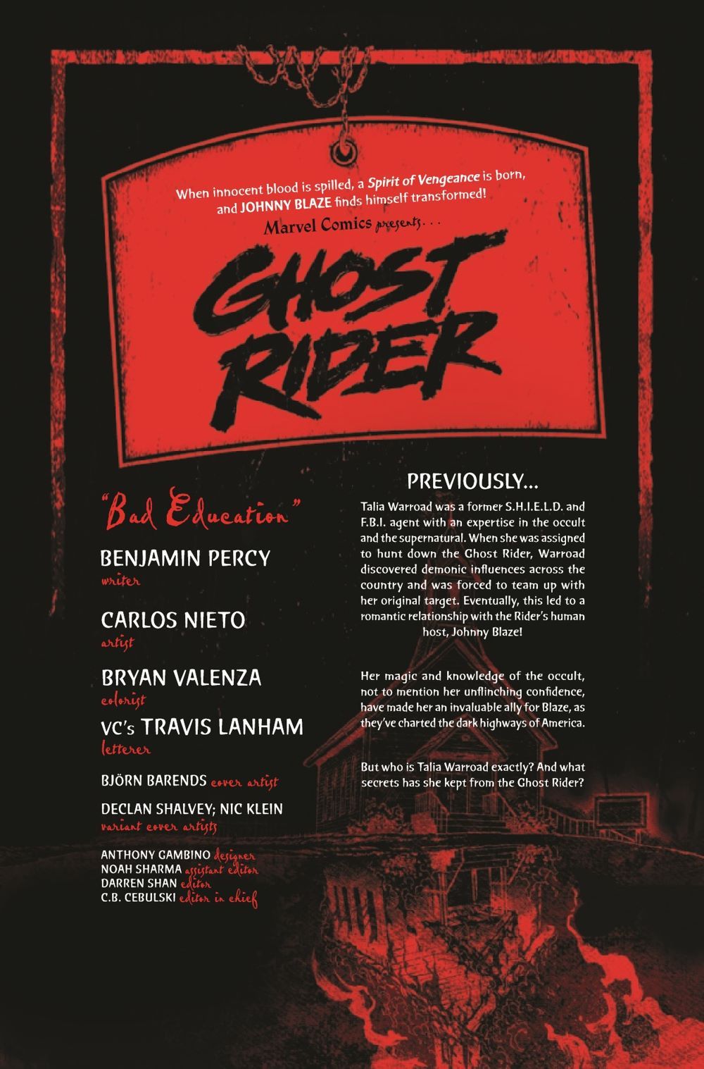 Johnny Blaze has been traveling with the brilliant hedge witch, Talia Warroad, but how well does he really know her? Now Talia's messy past, her teenage loves and furious first spells, will pull into his lane. Just who is Talia Warroad and how was her life set on a collision course with the Spirit of Vengeance? Guest starring DOCTOR STRANGE!