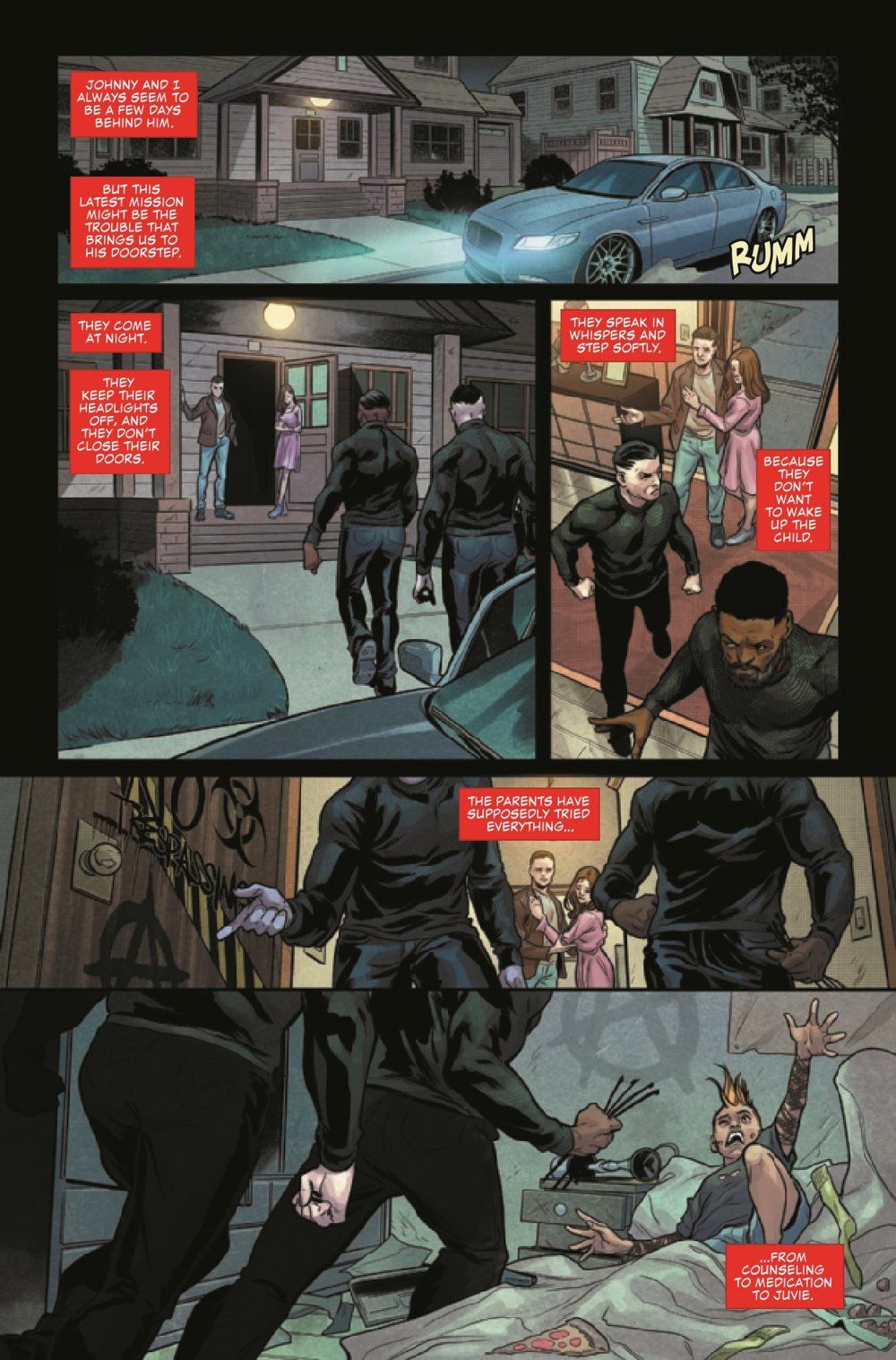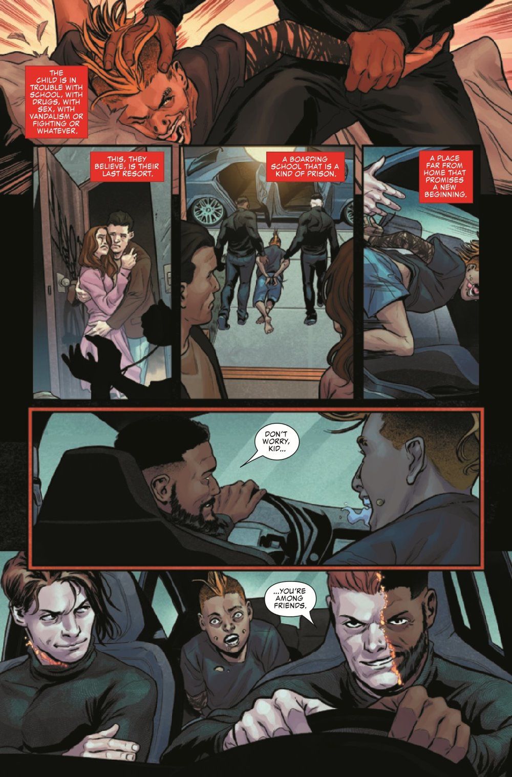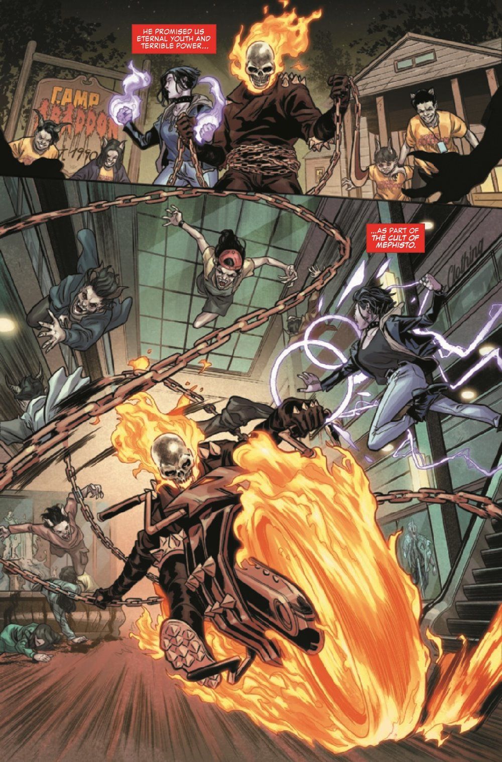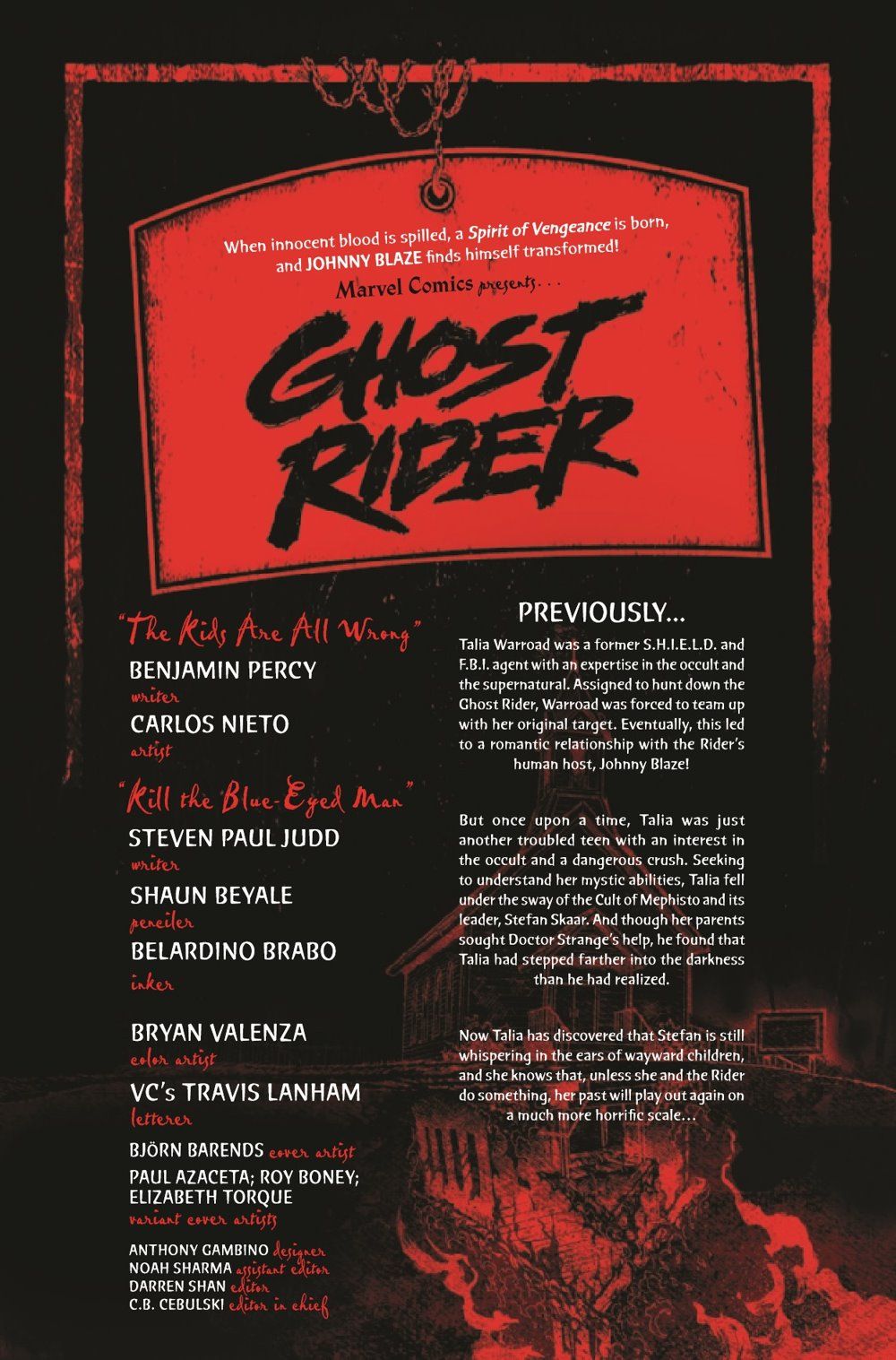 On the trail of the Cult of Mephisto, Talia Warroad and Johnny Blaze discover a town emptied of adults. What happened, what will become of the children left behind and how does it connect to Talia's own childhood? He may not be the nurturing type, but these children's only hope is the Ghost Rider! Plus: A backup story featuring Ghost Rider and Kushala, the Spirit Rider!