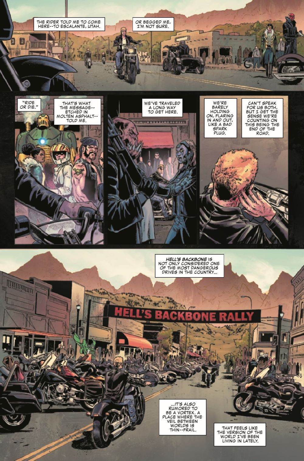 DEATH RALLY! New alliances and old betrayals come into play when a mysterious invitation goes out, drawing Johnny Blaze to the world's largest motorcycle rally, featuring a race Johnny might not want to win...but can't lose. Featuring guest stars from across the Marvel Universe!