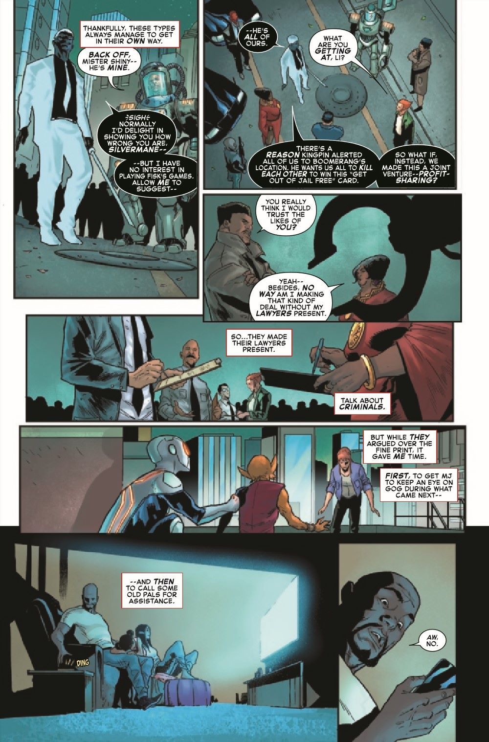 Everything comes down to this! • Kingpin's quest that violates all natural law! • Tombstone and Robbie Robertson's years' old enmity! • Randy Robertson and Beetle's timeless love! • Boomerang's scheme! • Spider-Man's whole status quo!