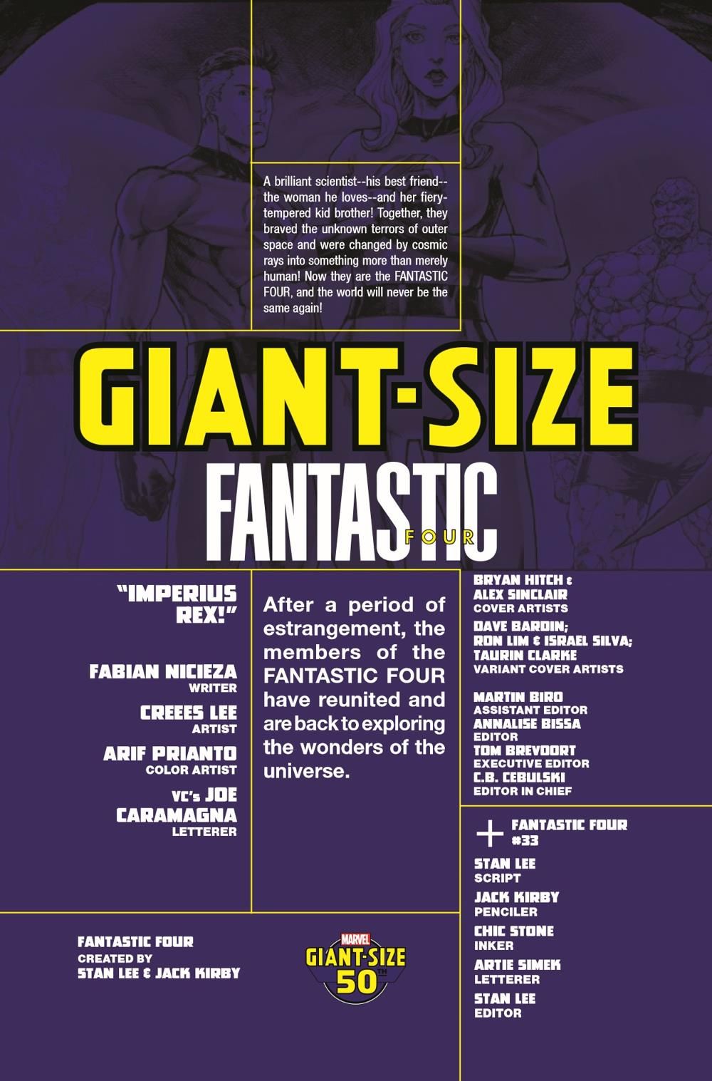 IMPERIUS REX! Namor is imprisoned, serving out his sentence as the disgraced King of Atlantis! So when a new yet ancient threat arises from the sea, who better to leap into the fray than Marvel's First Family: the FANTASTIC FOUR! Writer FABIAN NICIEZA and artist CREEES LEE join forces for a GIANT-SIZE deep dive into some of Atlantis' most dangerous history…and the present that can scarcely hope to contain it! PLUS: Includes a reprinting of FANTASTIC FOUR #33, a classic issue from Stan Lee and Jack Kirby featuring betrayal, action and high drama - in the Atlantean style!