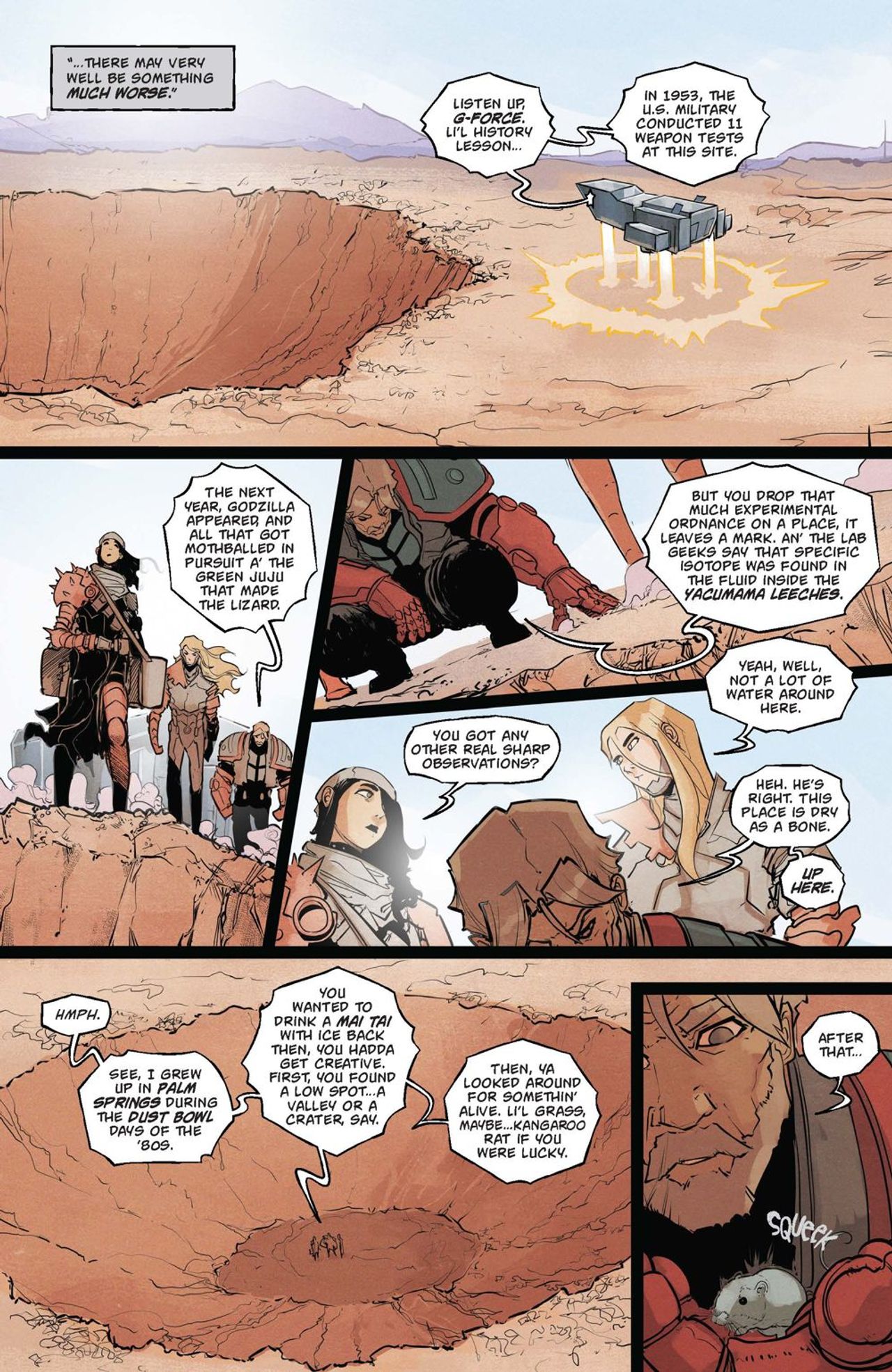 The rematch of Jacen and Godzilla starts here! In one corner, we have the meanest and greenest King of the Monsters the world has ever seen. In the other, we have the boy who wields the fire of Godzilla. Who will prevail? After attacking Atlanta, Godzilla seemingly disappeared into the Earth below. While half of G-Force goes searching for the origins of the synthetic leech kaiju Yacumama, the other half is going Godzilla hunting. But will Rumi's technique be enough for Jacen to take down the King of the Monsters?